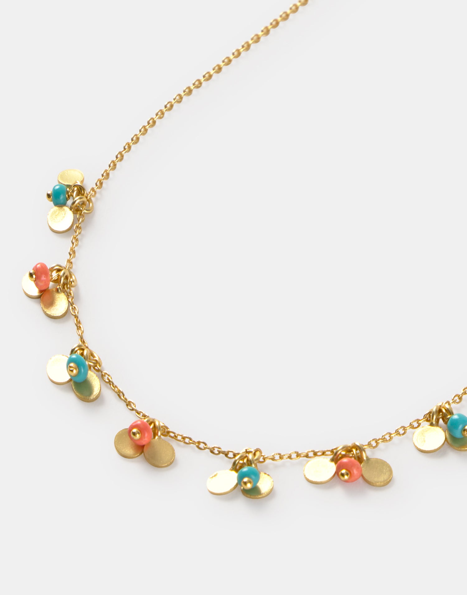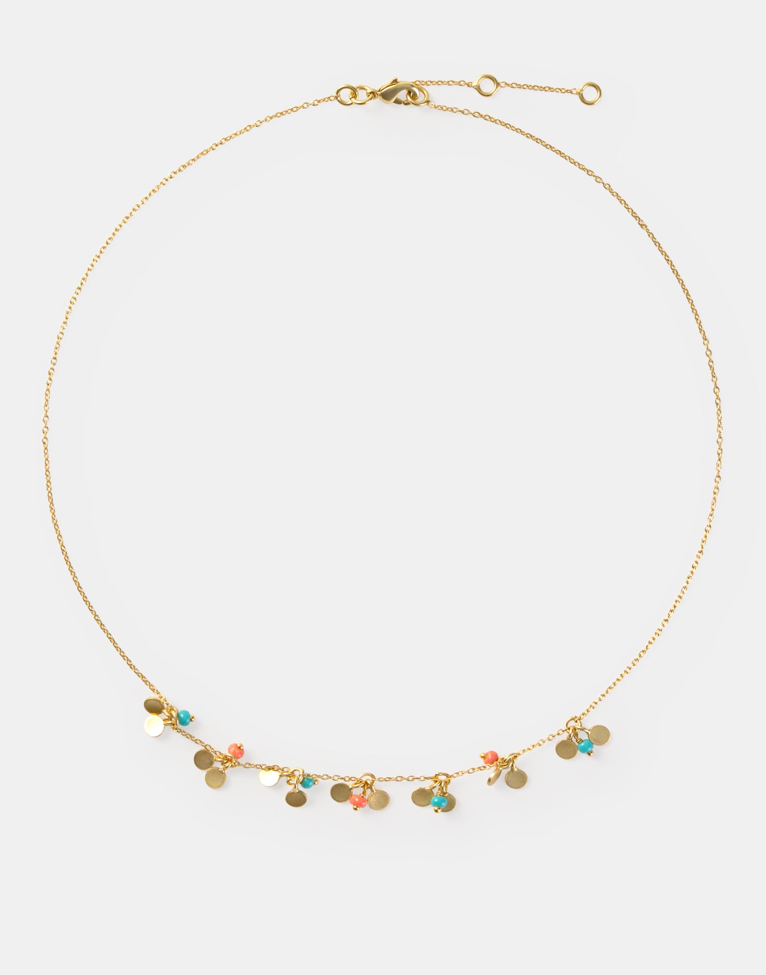 Collar de cadena daurada amb penjolls petits de comptes i medalles. Tancament ajustable amb mosquetó.