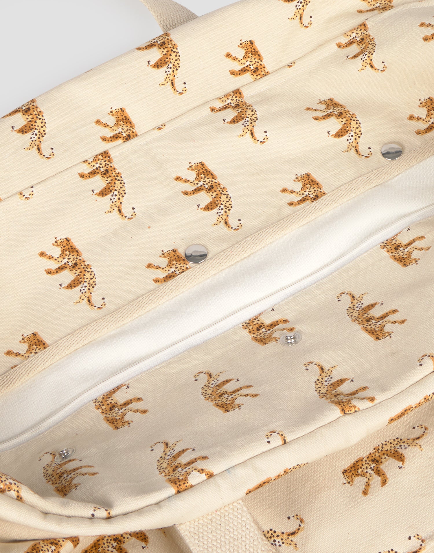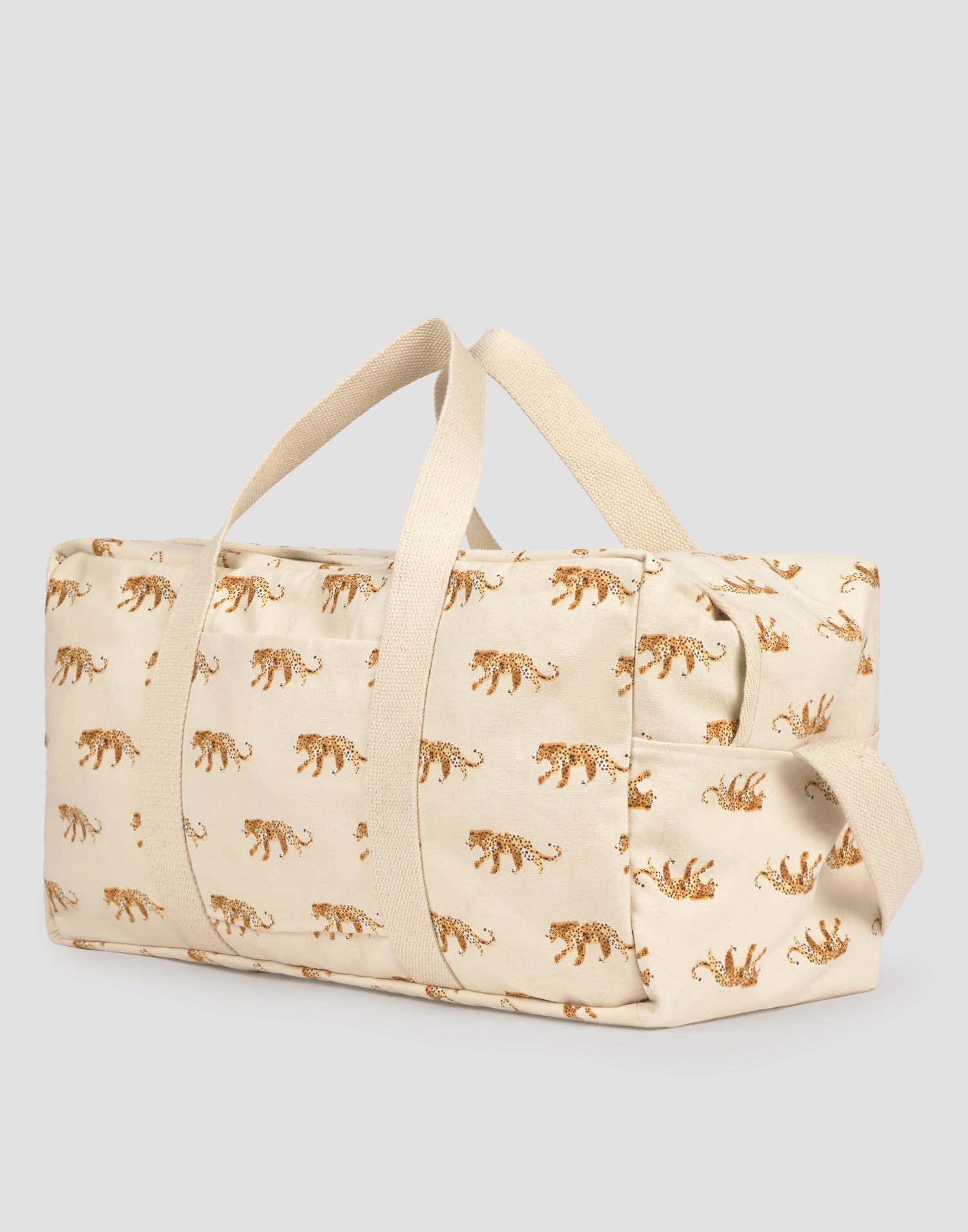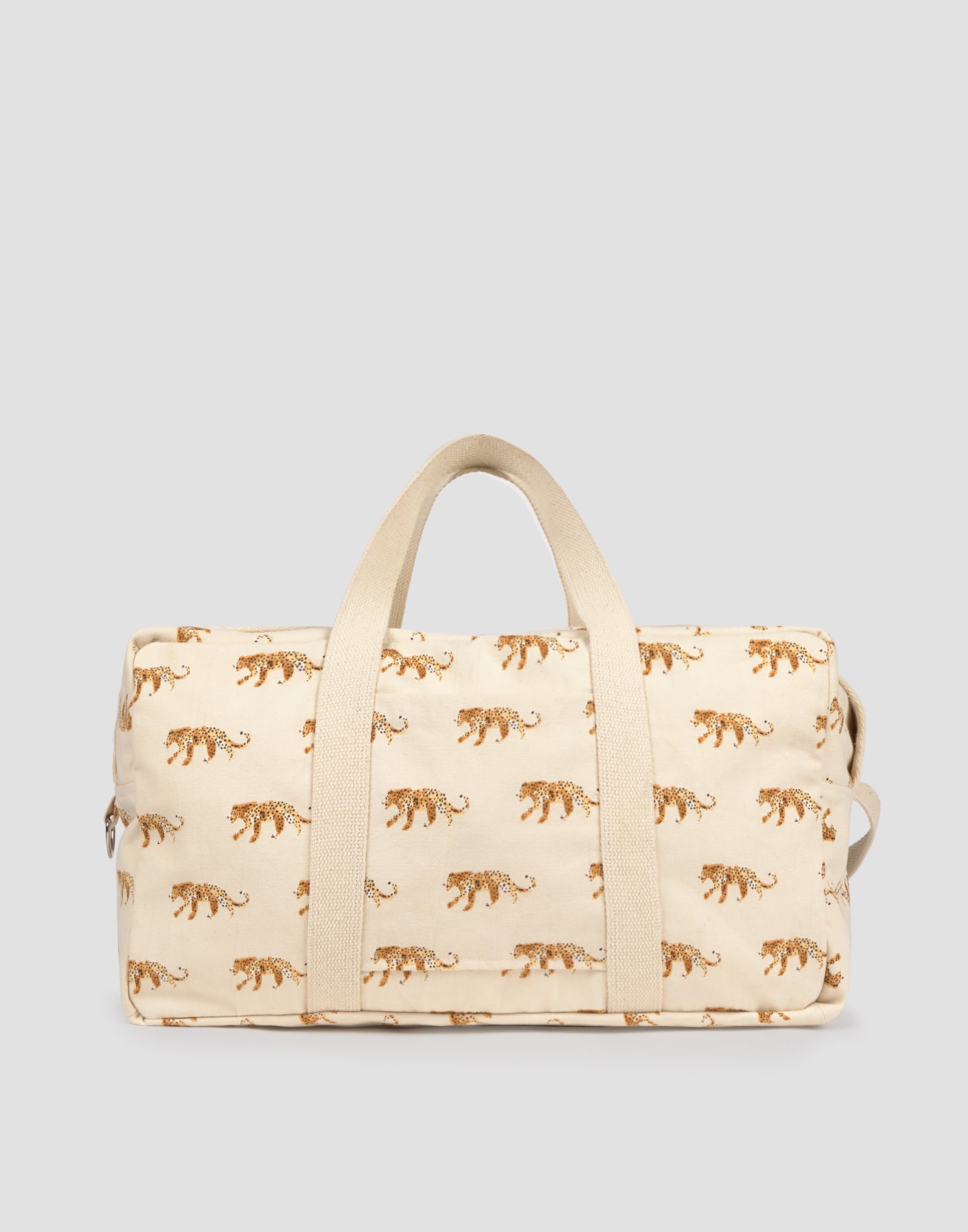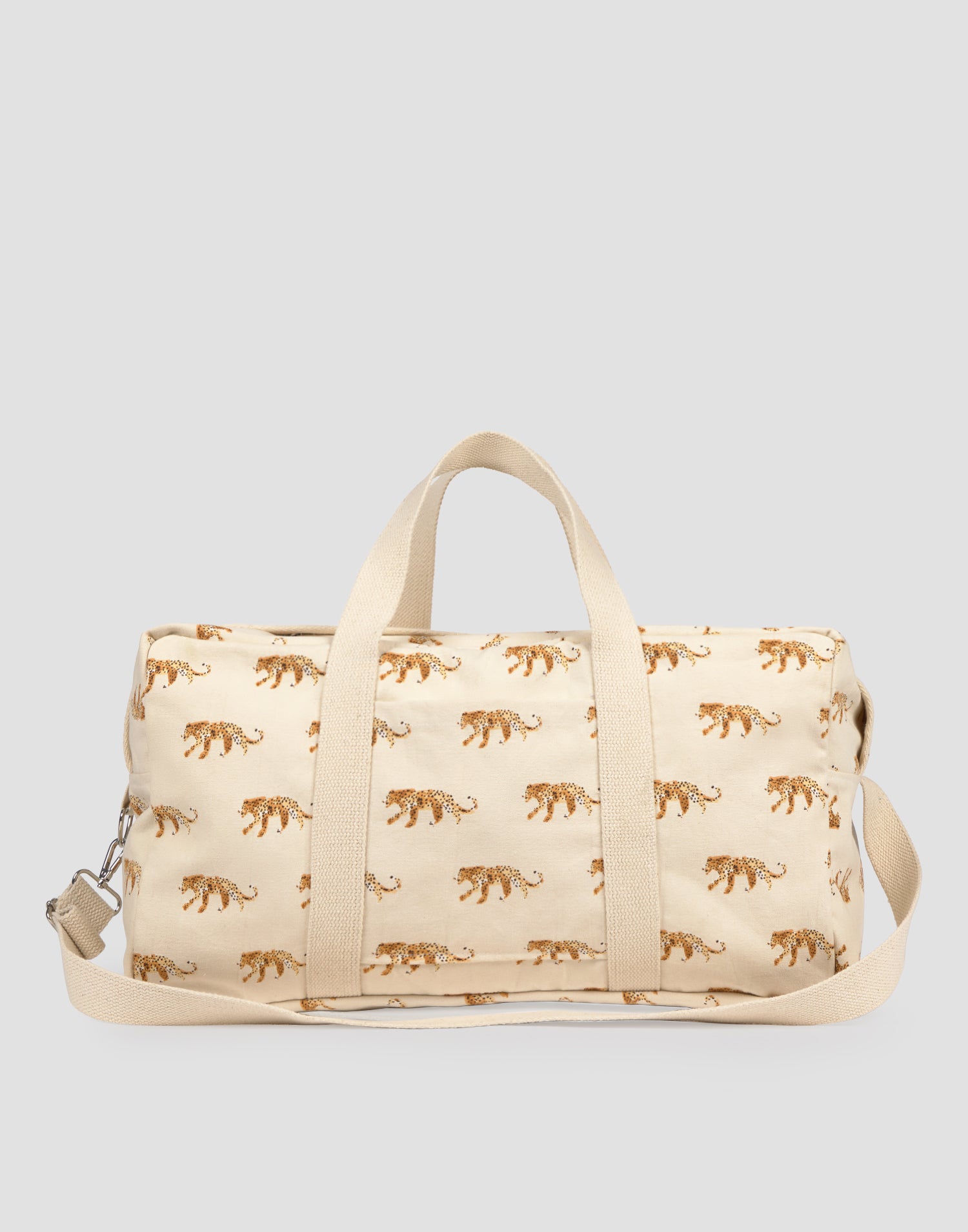 Bossa de cap de setmana estampada amb dues nanses d’espatlla, nansa llarga ajustable i tancament de cremallera oculta.