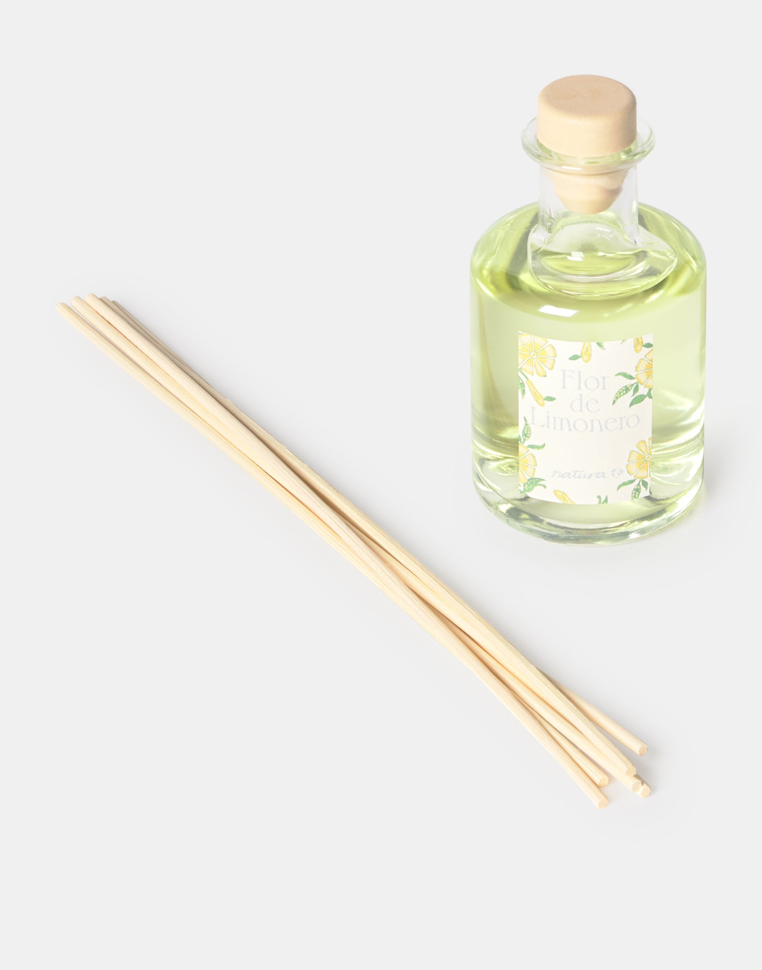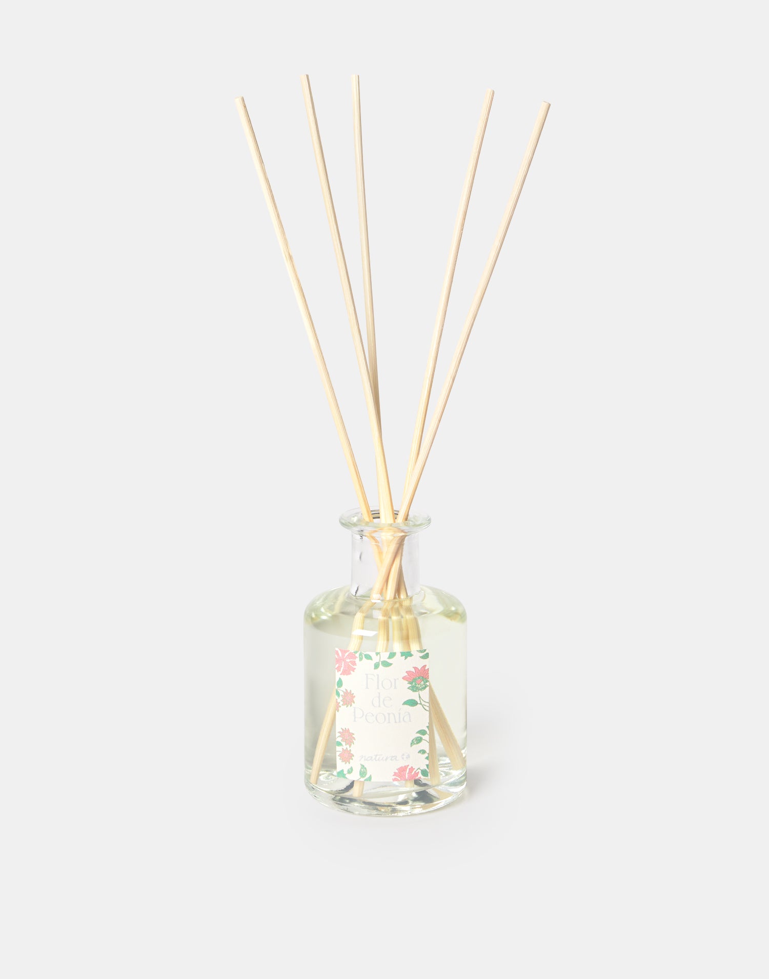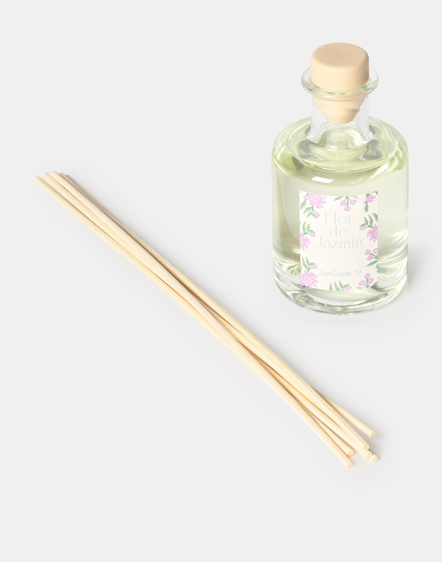 Ambientador tipus difusor amb varetes, amb envàs de vidre i varilles de fibra.