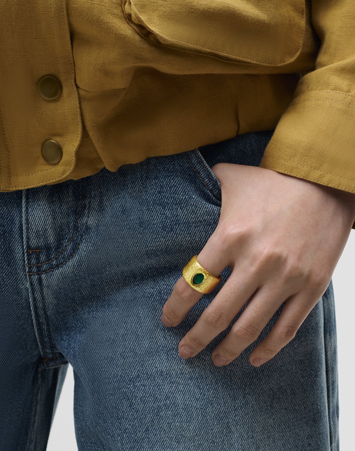 Anillo ancho dorado ajustable con detalle de piedra.