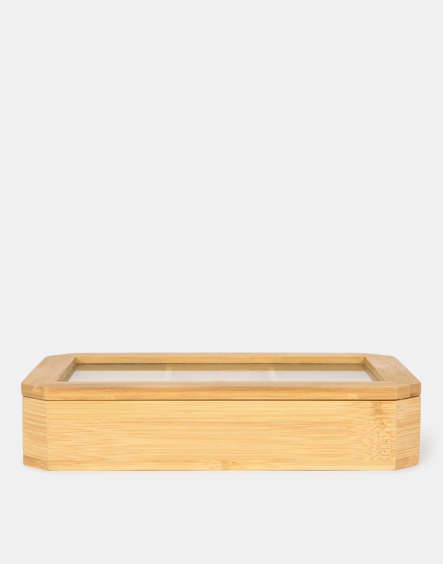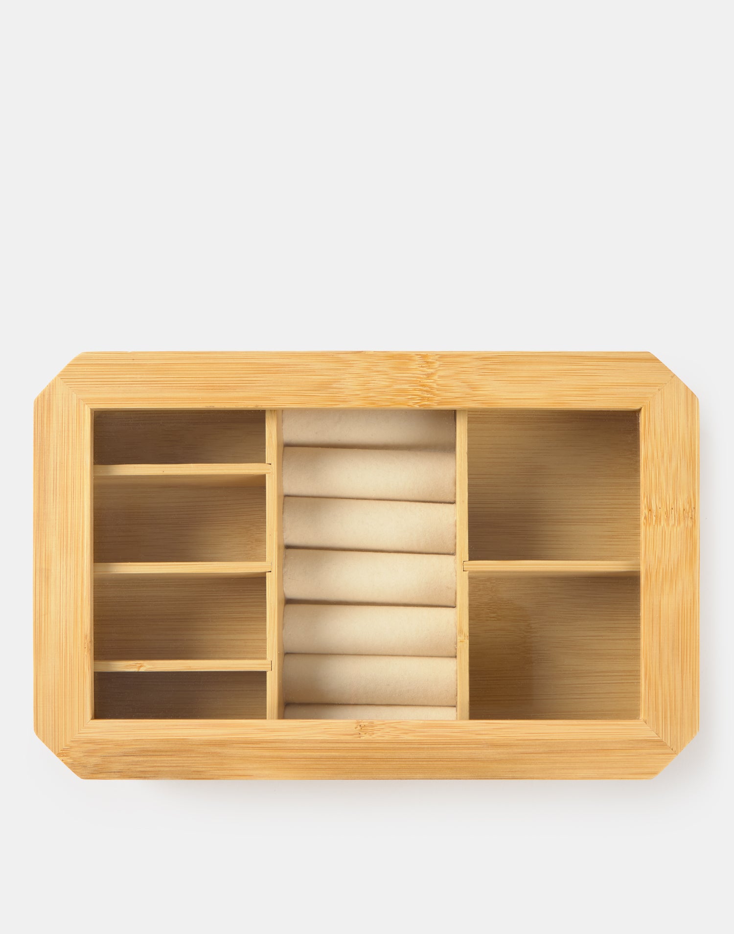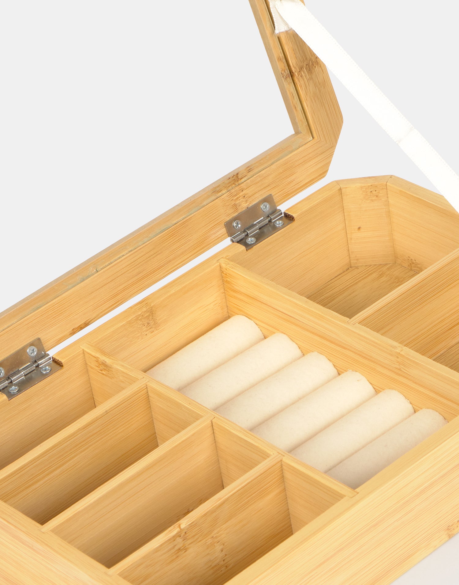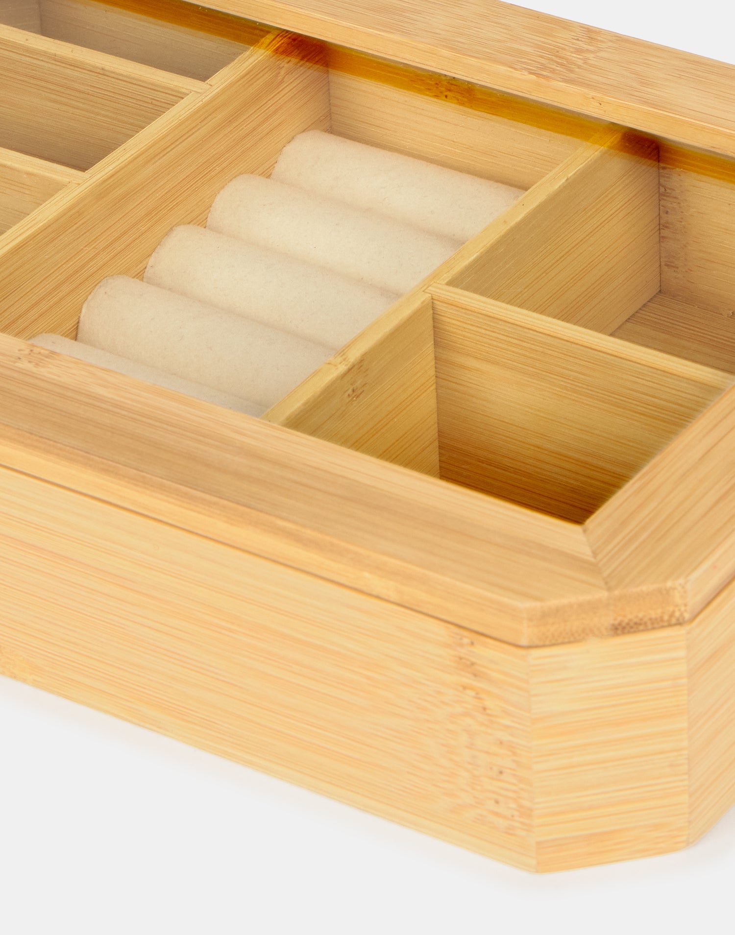Joyero organizador hecho en madera de bambú. Tapa de cristal.