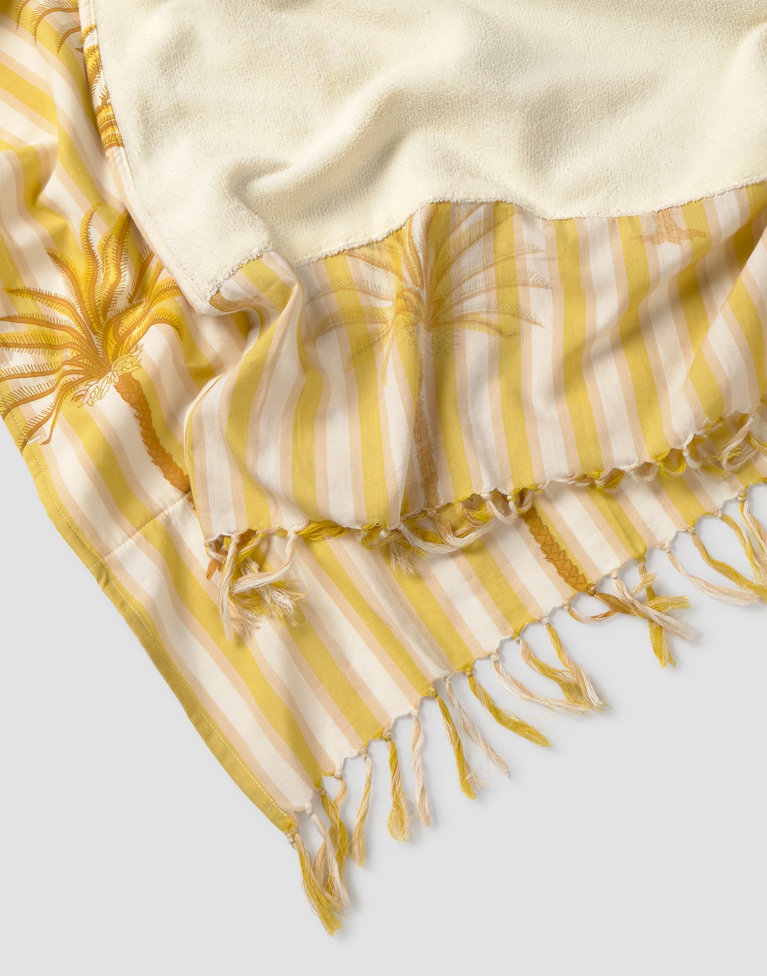 Toalla de algodón con tela estampada en la parte frontal y terminaciones en flecos.
