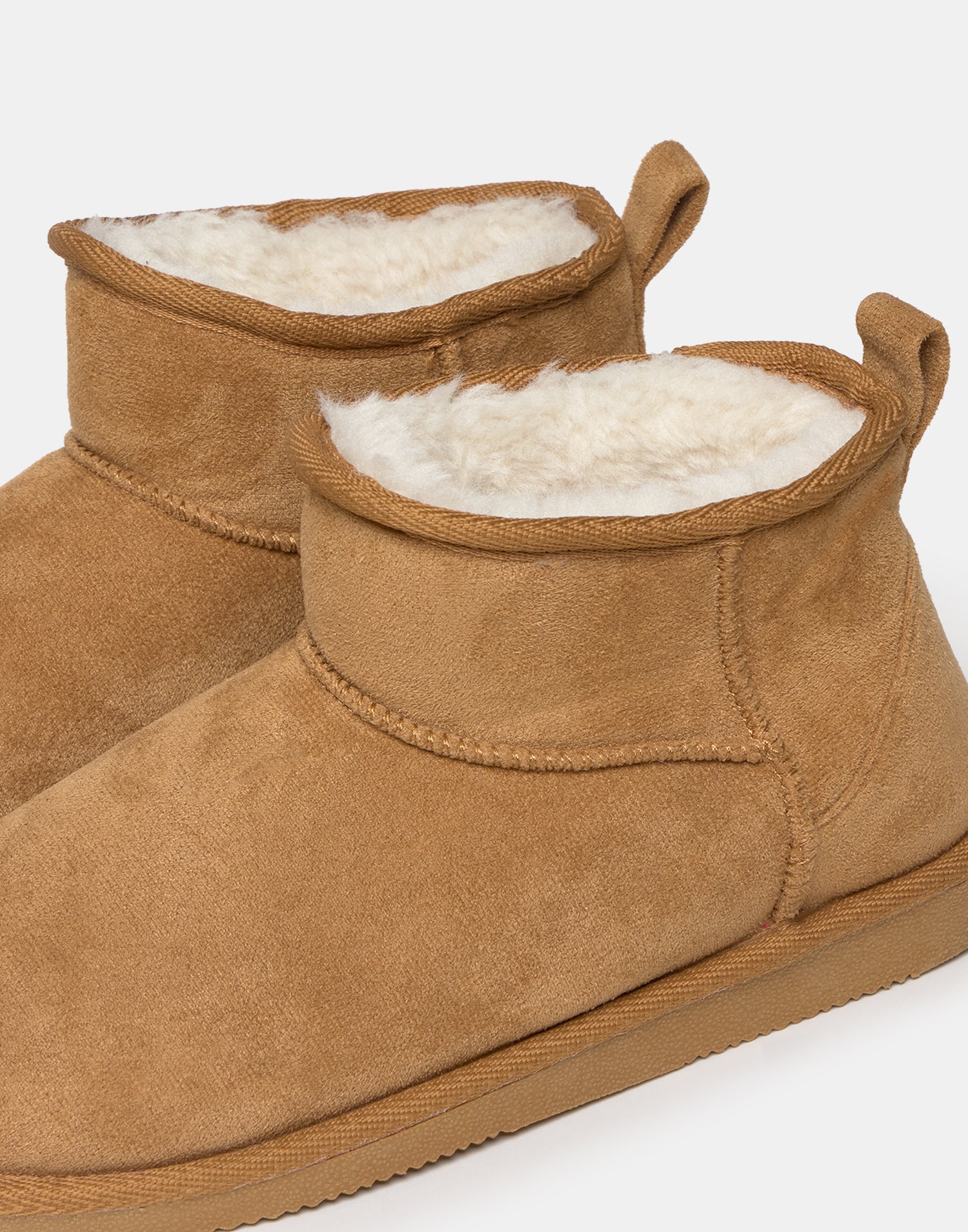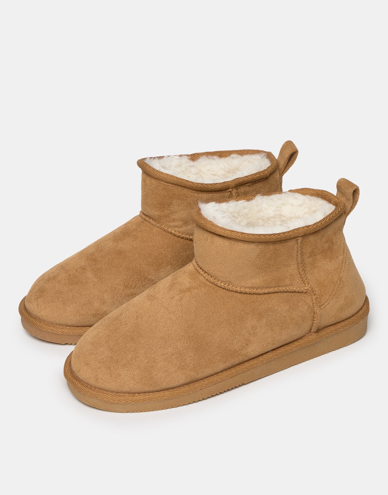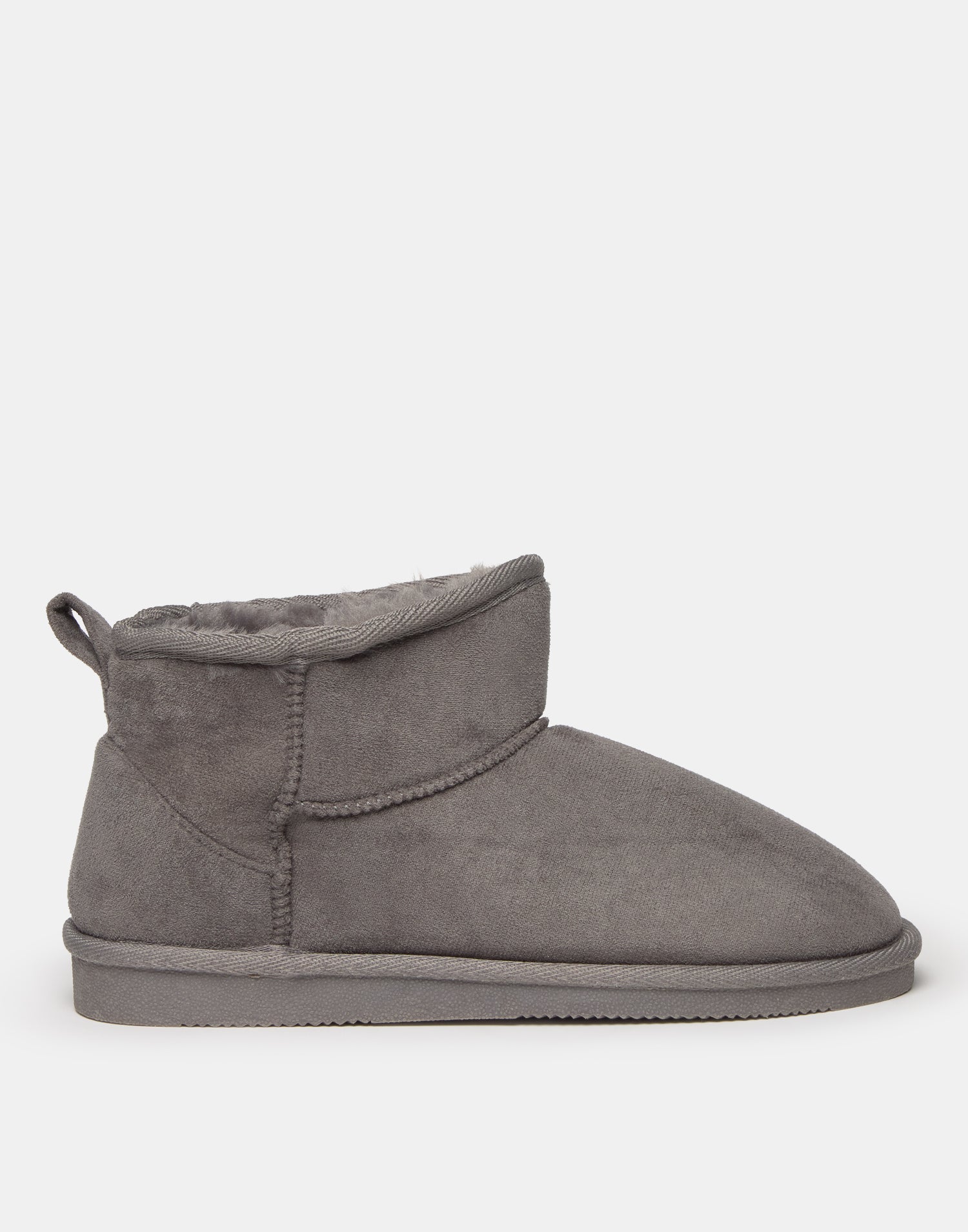 Bota baja efecto antelina, con forro interior efecto pelo y tirador en la parte superior de la caña. Suela de goma.