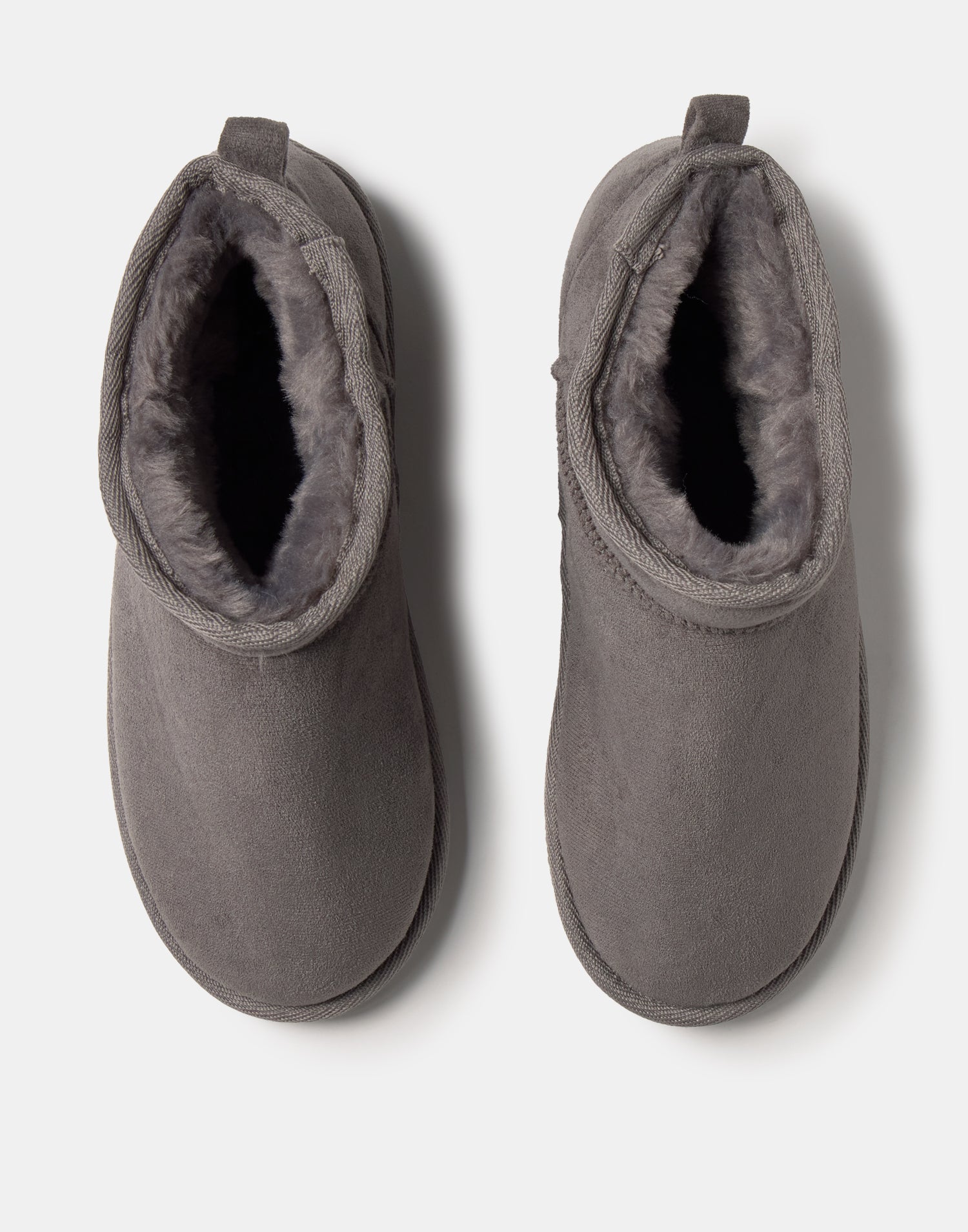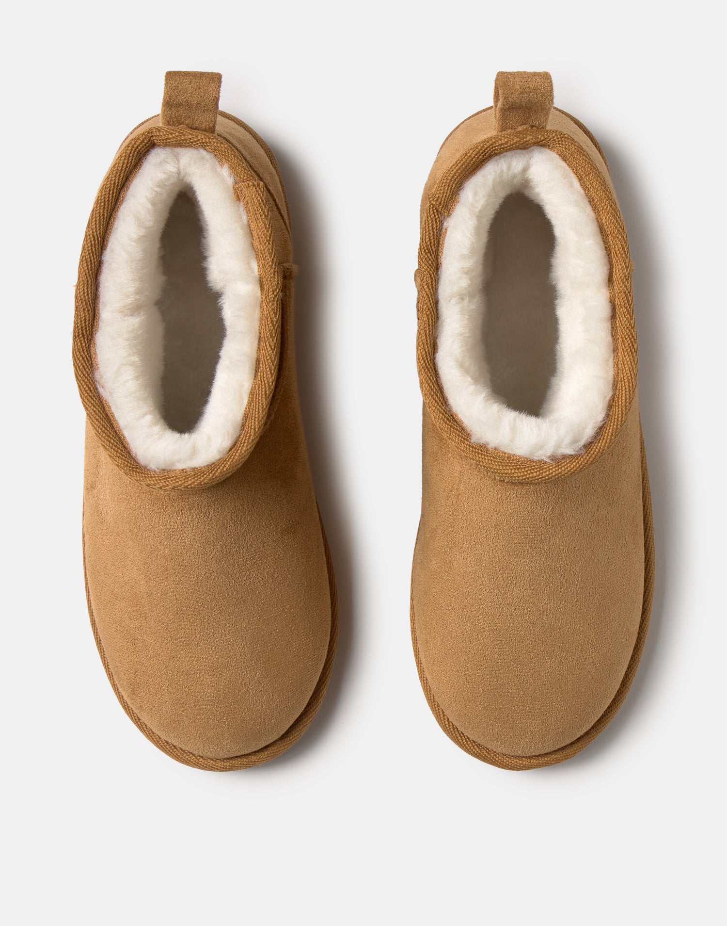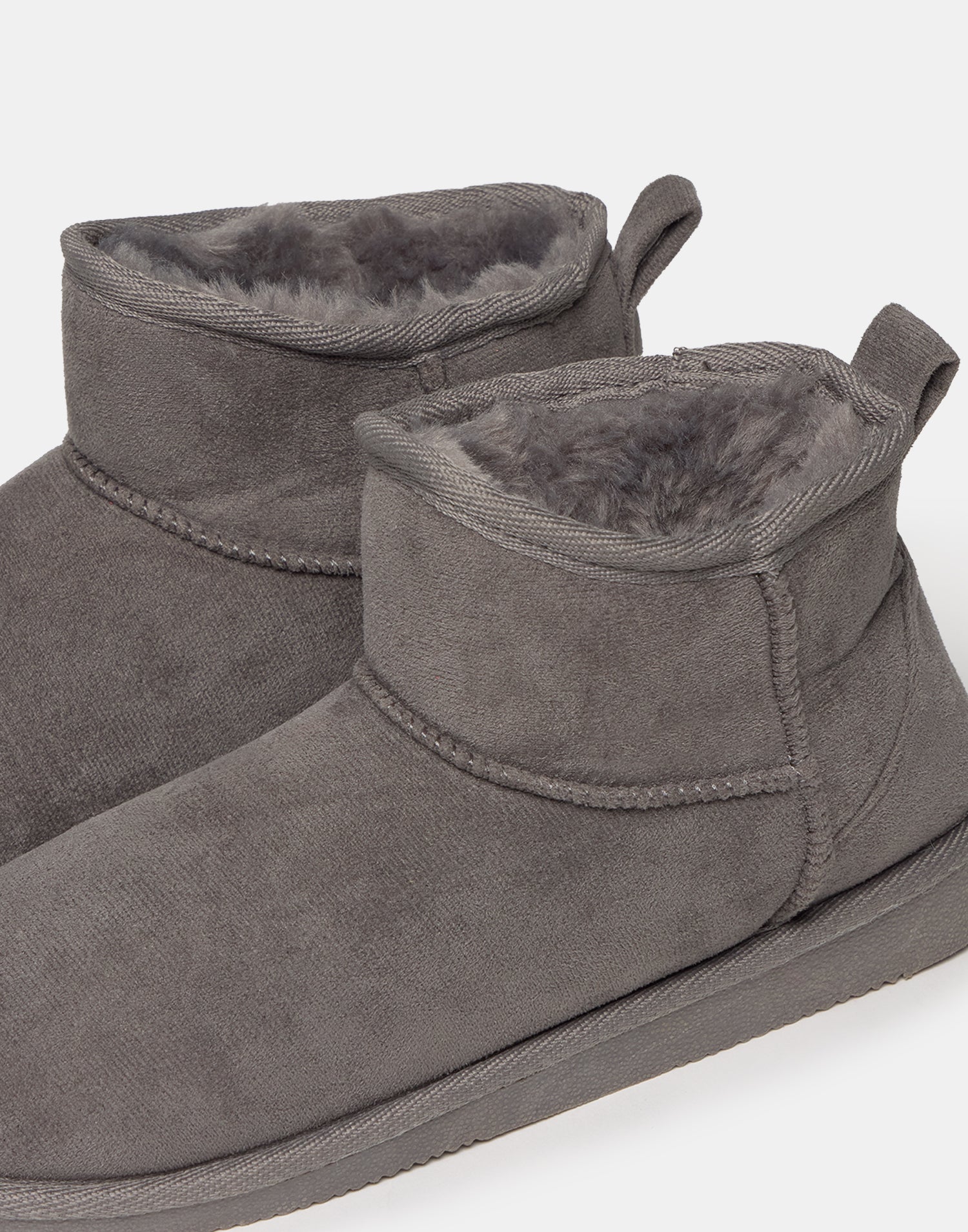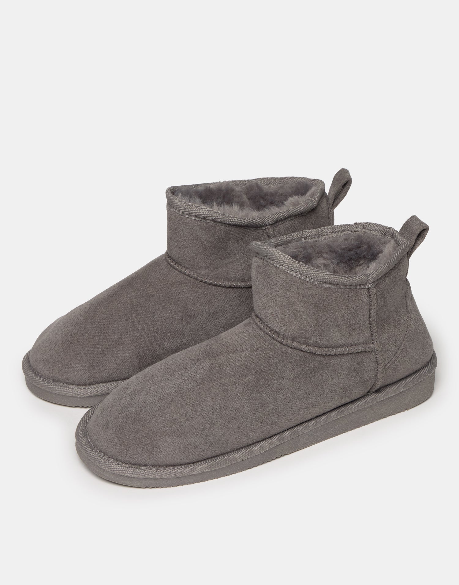 Bota baja efecto antelina, con forro interior efecto pelo y tirador en la parte superior de la caña. Suela de goma.