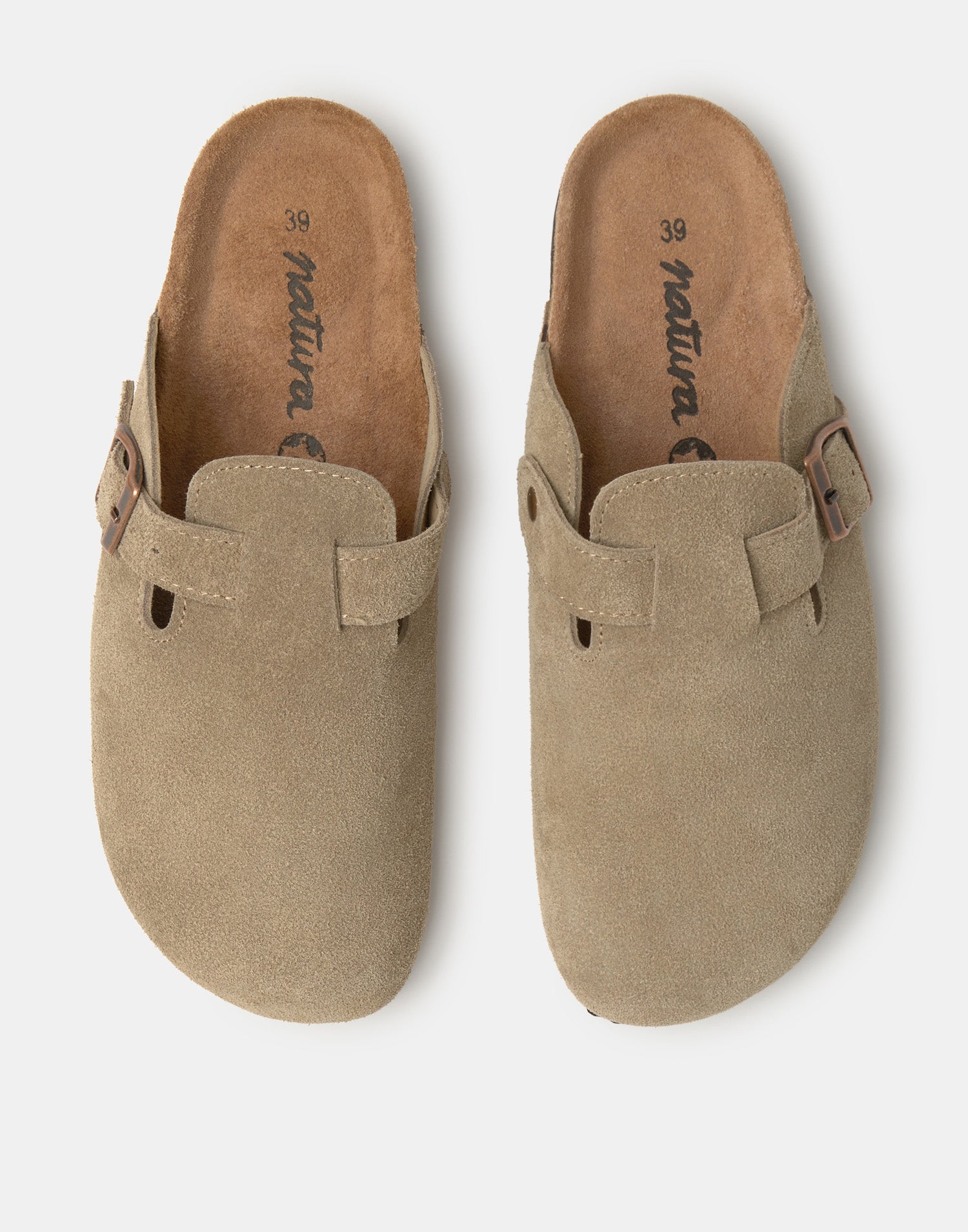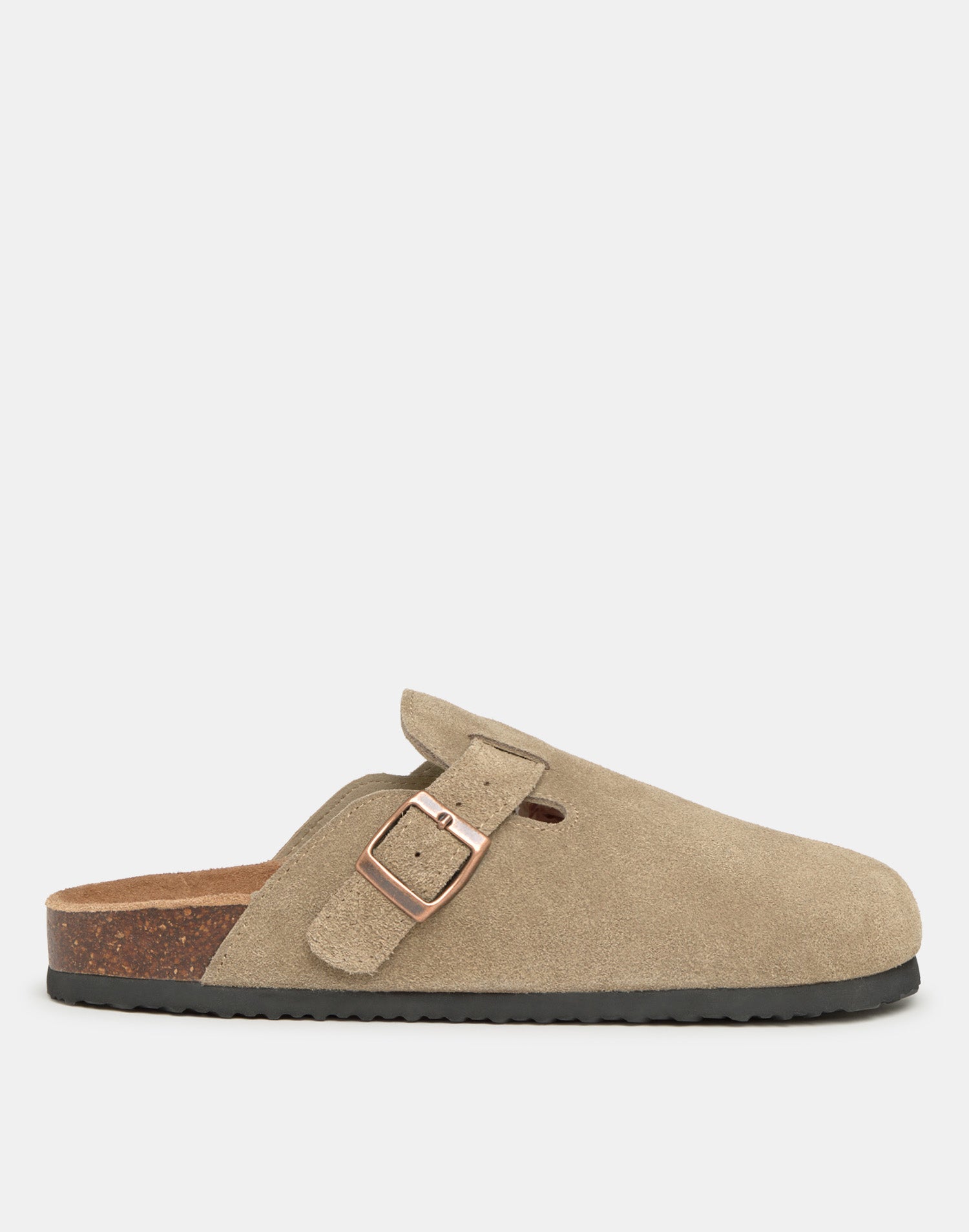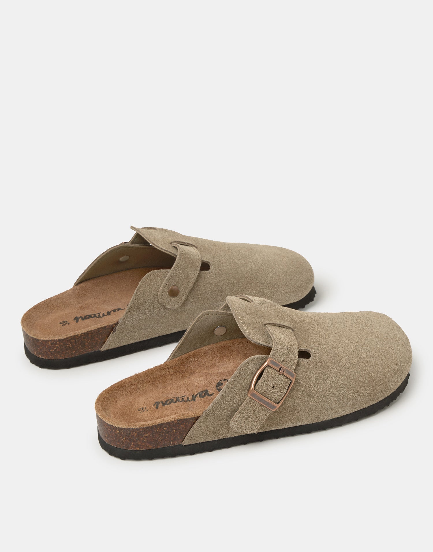 Zapato tipo zueco con diseño destalonado, corte de piel de serraje y suela de corcho. Detalle de hebilla en el corte.