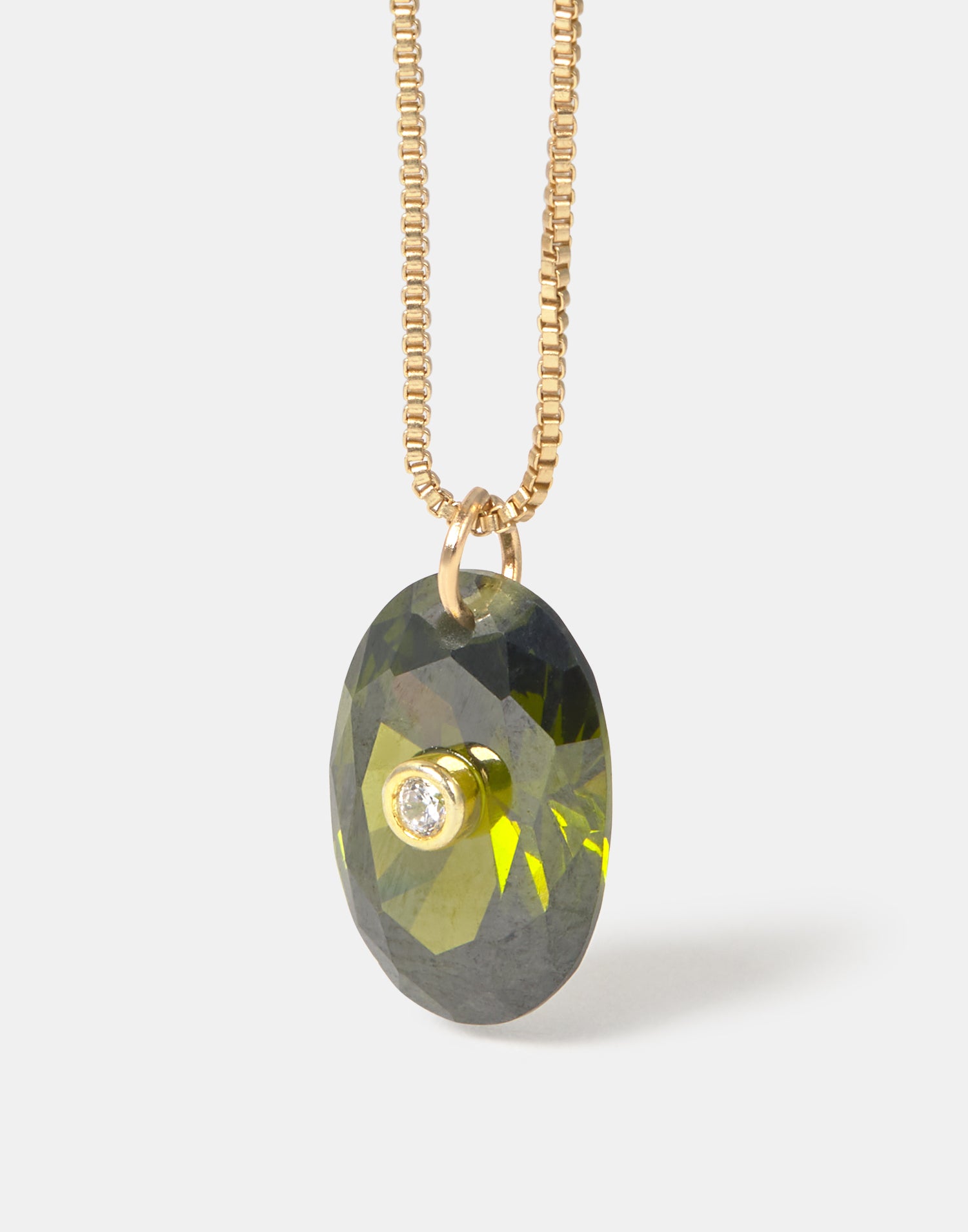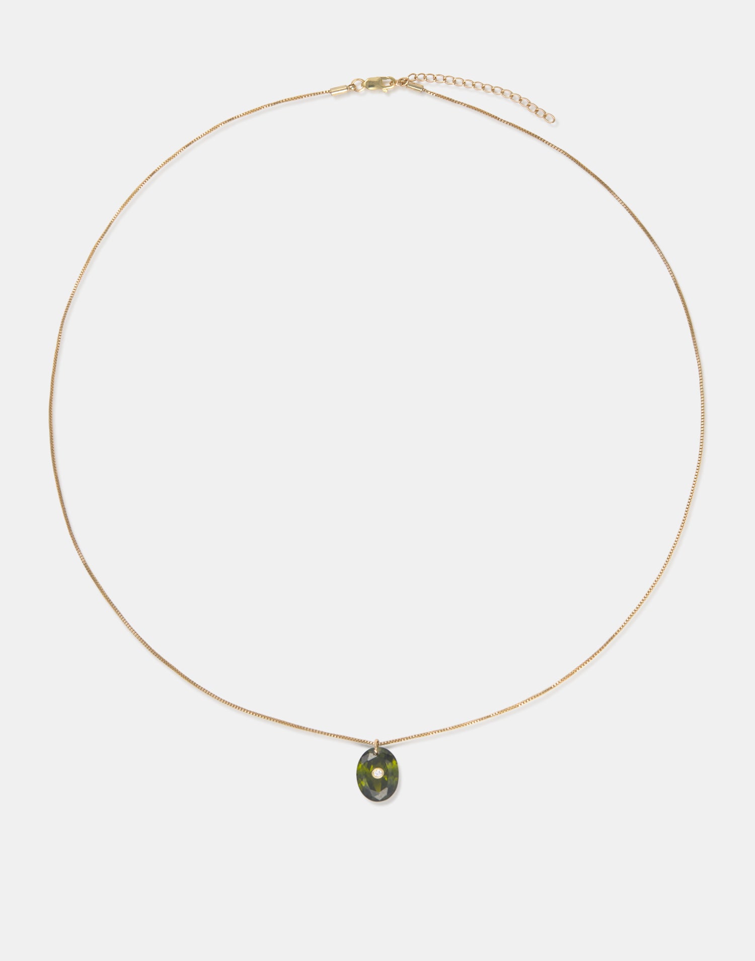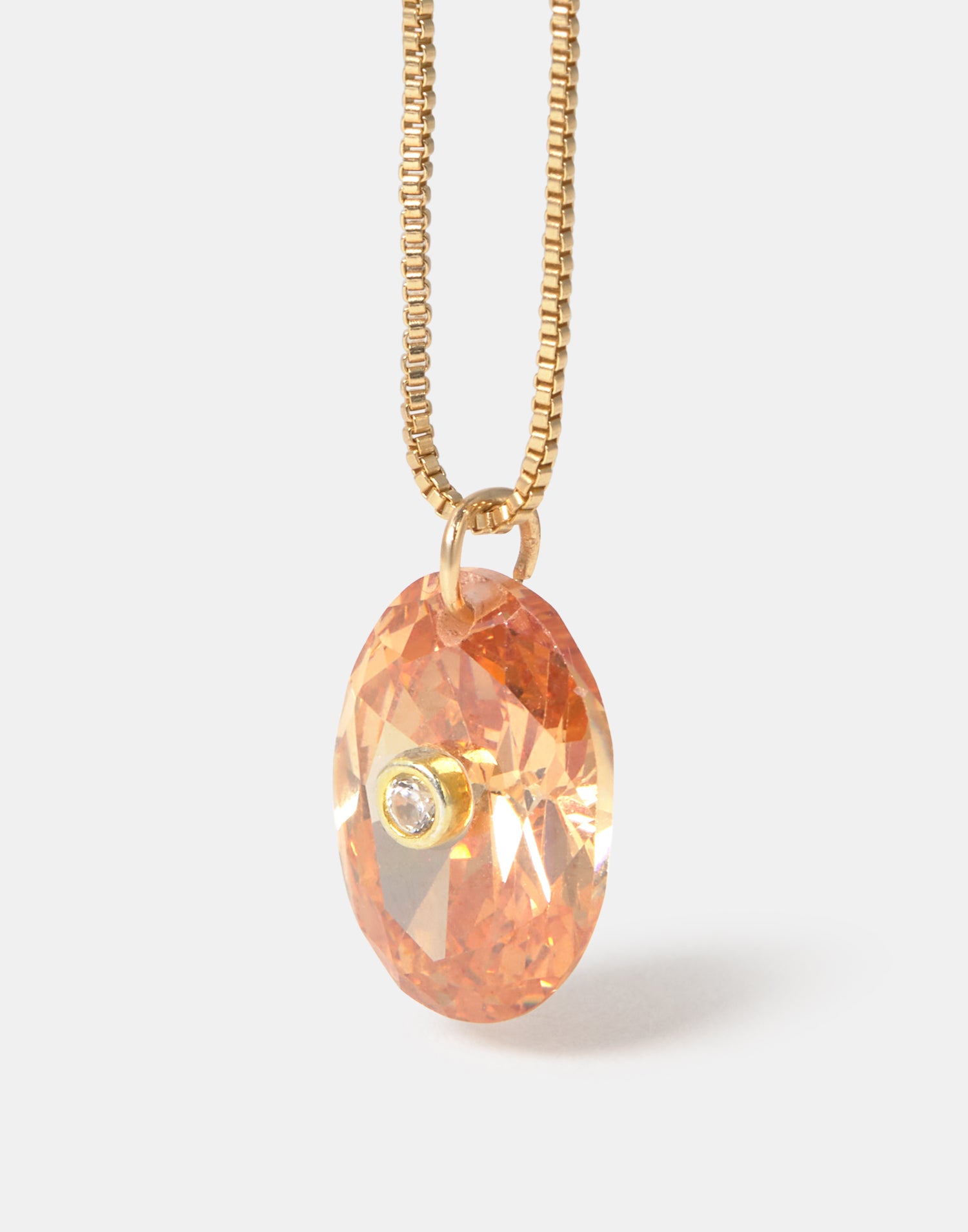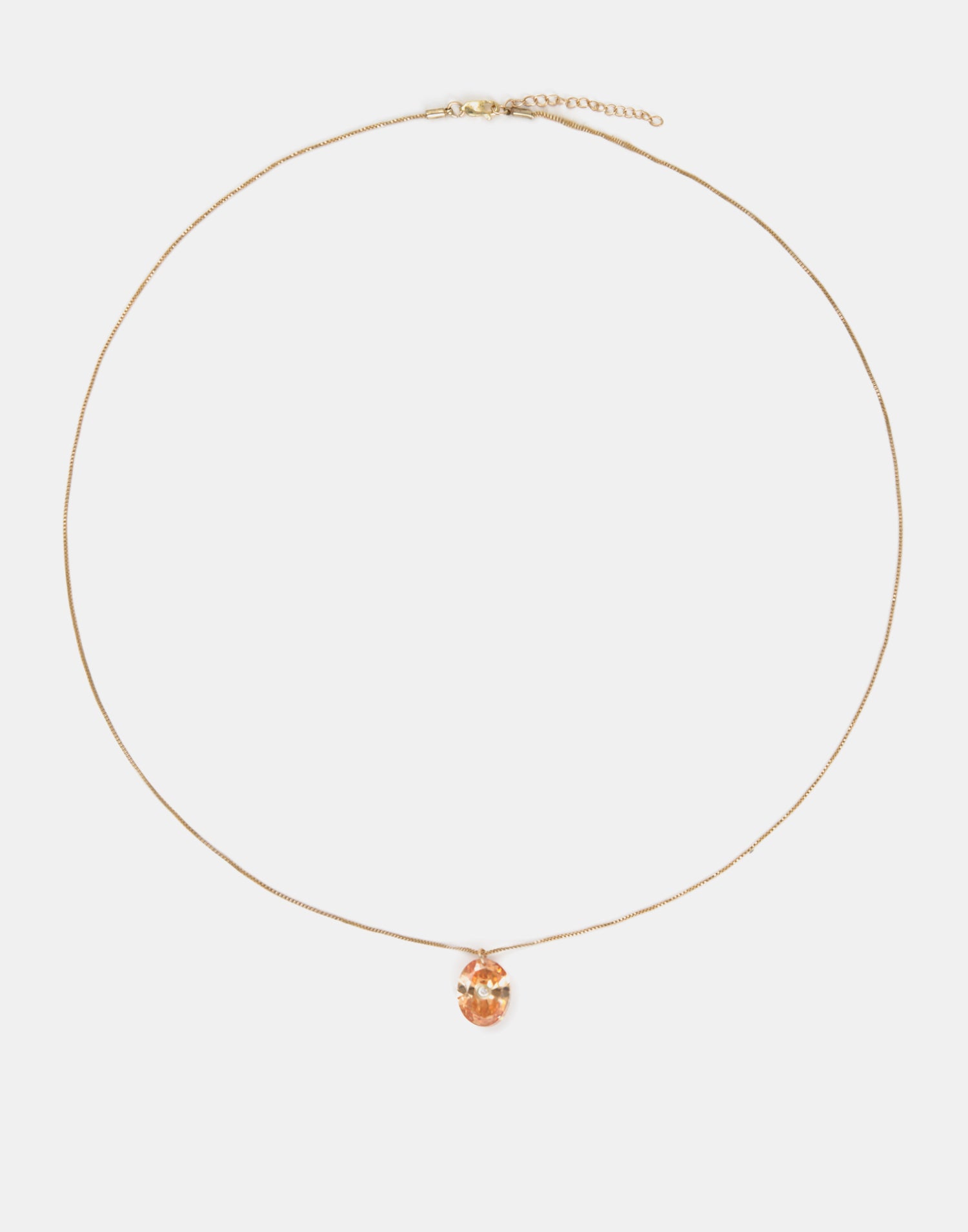 Collar de cadena dorada con colgante y cierre ajustable con mosquetón.