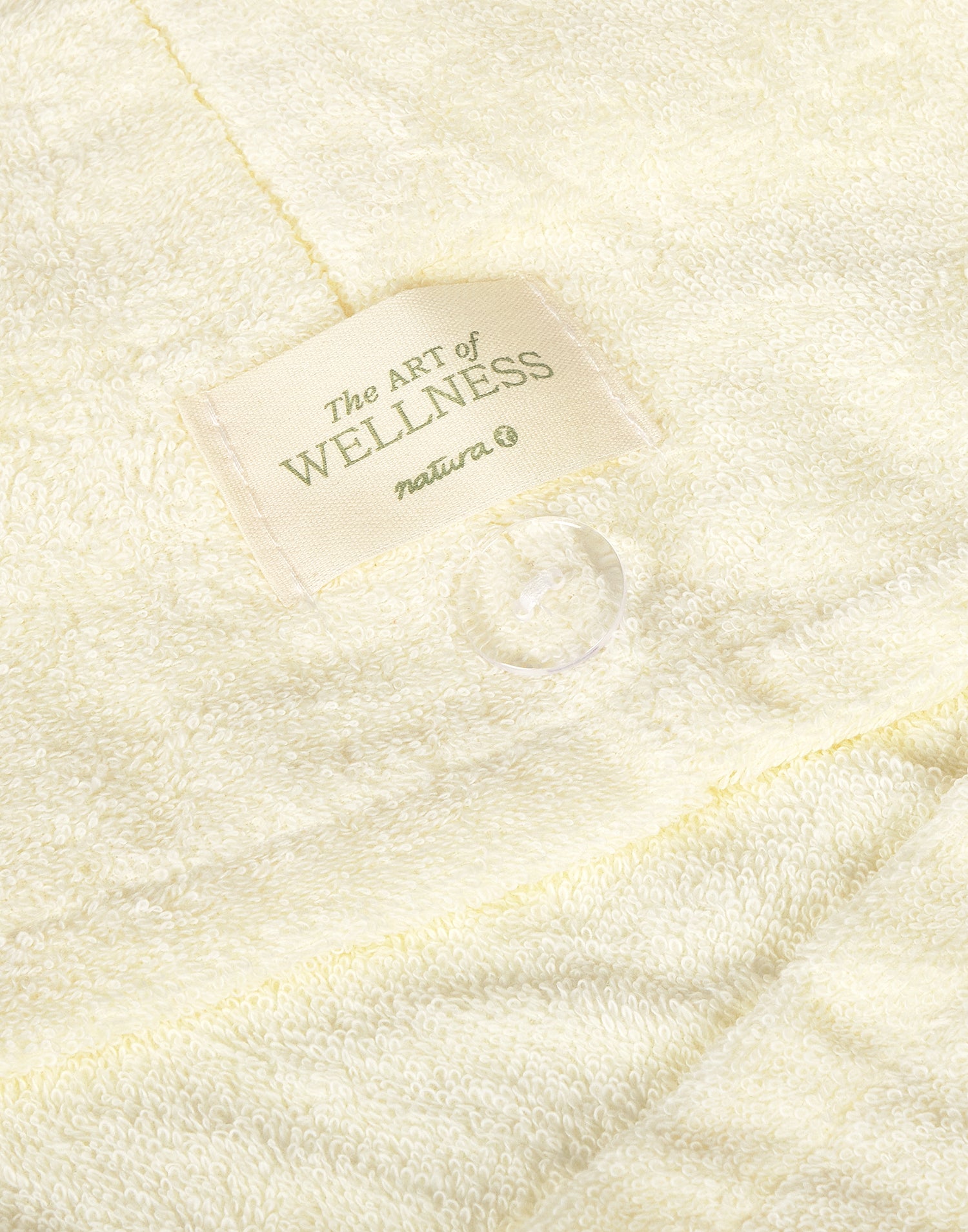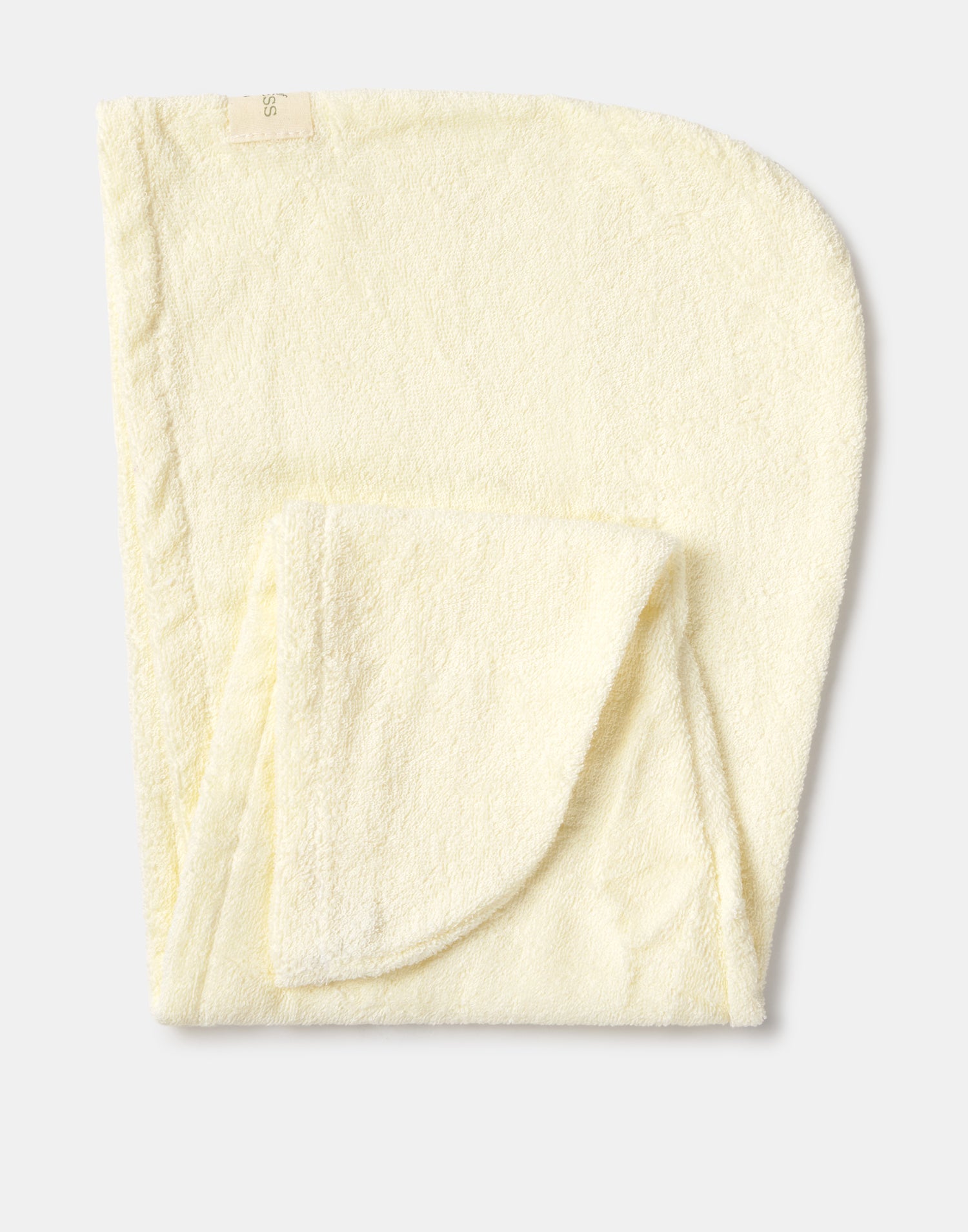 Toalla de pelo confeccionada en algodón. Su forma permite envolver el cabello y mantenerlo en su sitio gracias a un práctico botón.