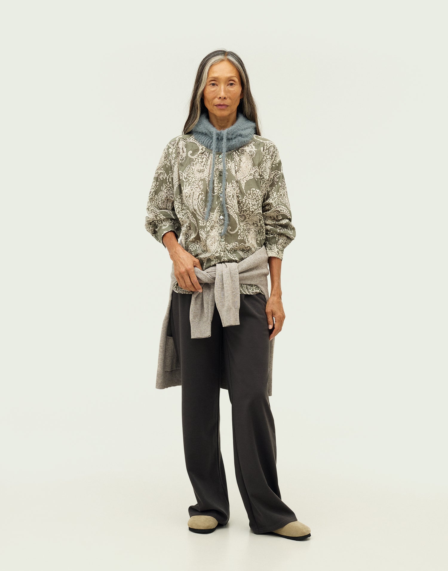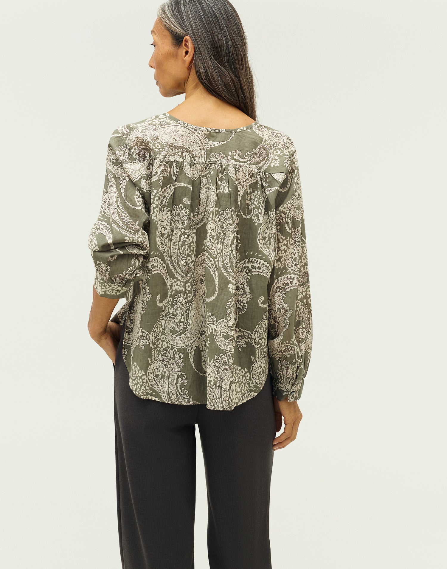Blusa estampada con manga larga, cuello redondo y cierre frontal de botones.