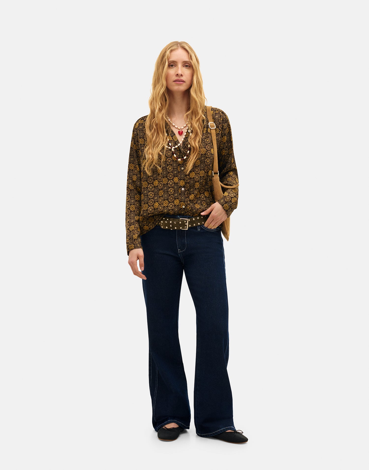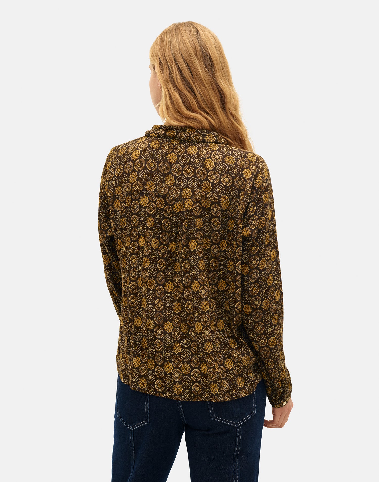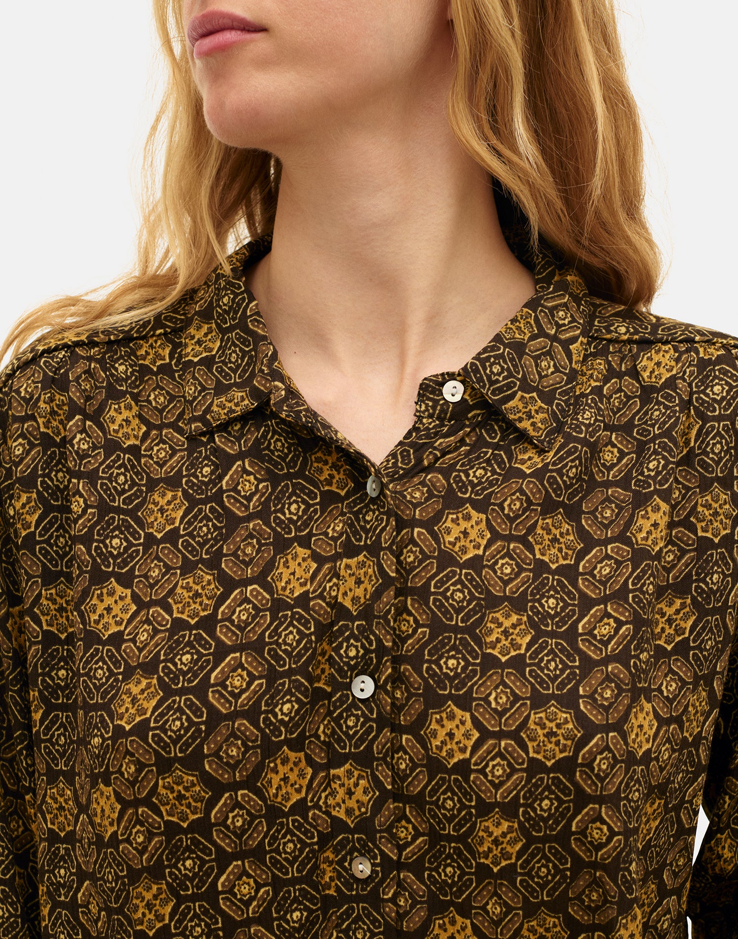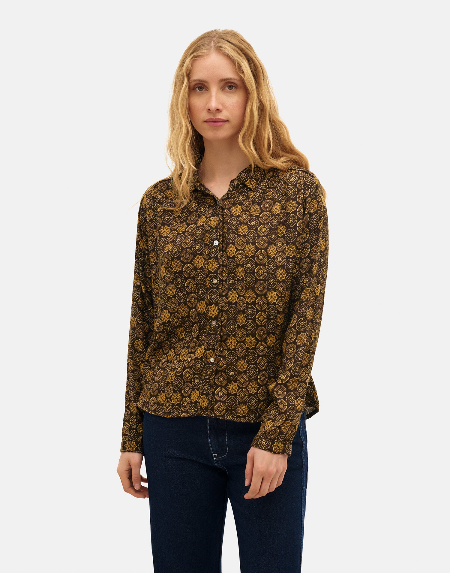 Camisa estampada con cuello solapa, manga larga con puño abotonado y cierre frontal de botones.