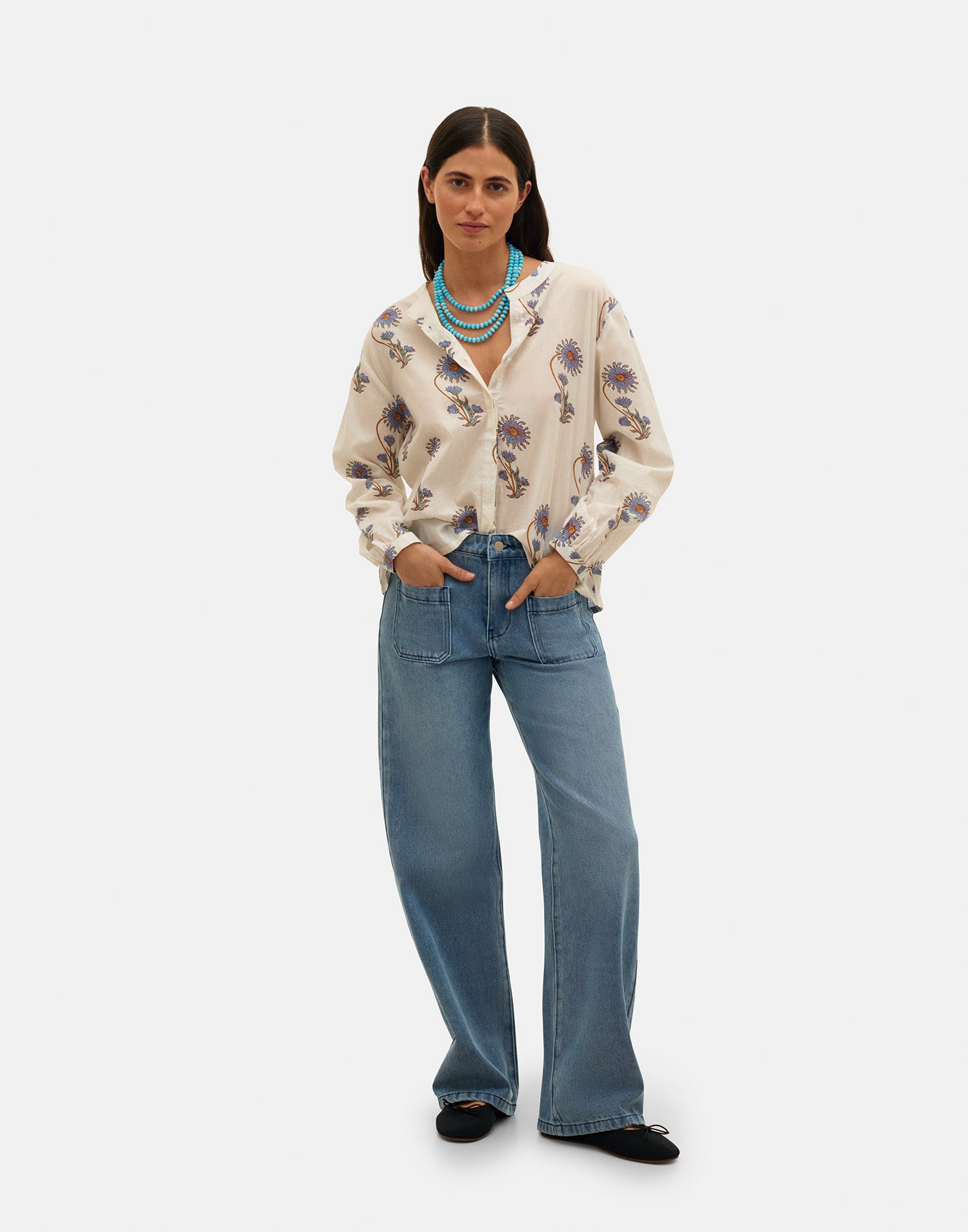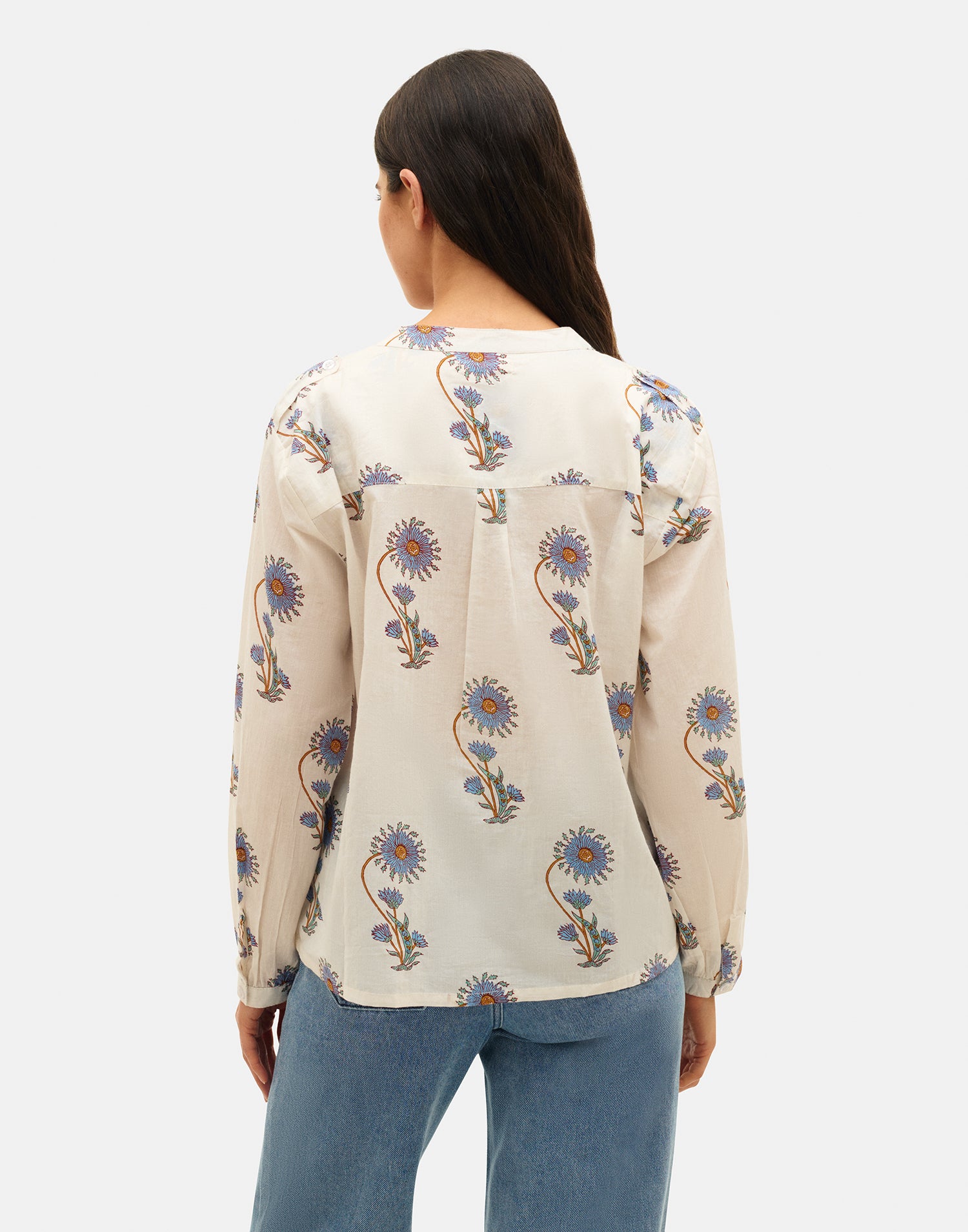 Blusa de cuello redondo y manga larga, con cierre frontal de botones ocultos por solapa y estampado floral.