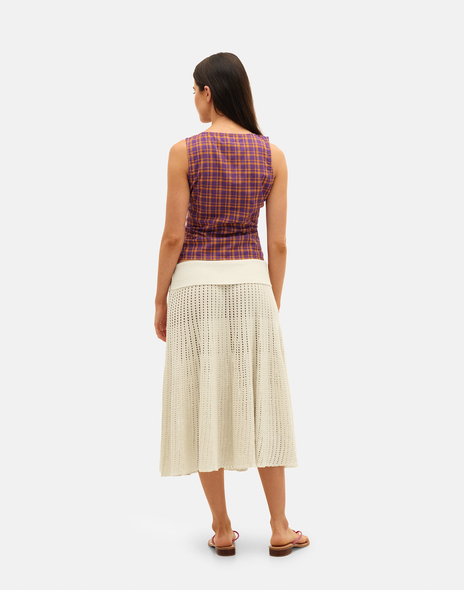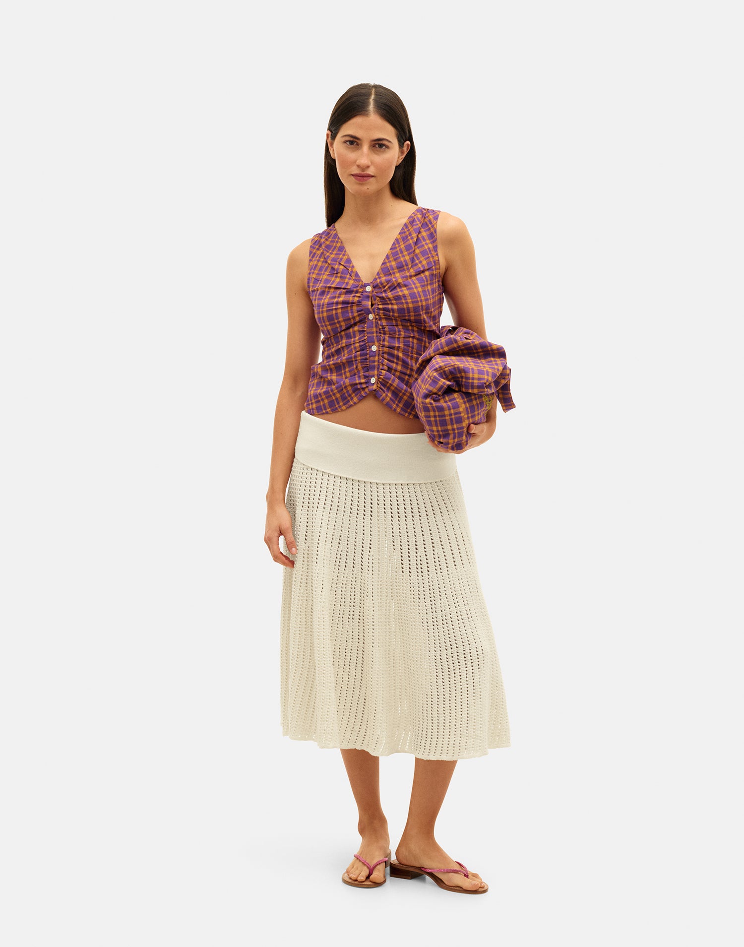 Falda de punto calado con volantes y cintura elástica.