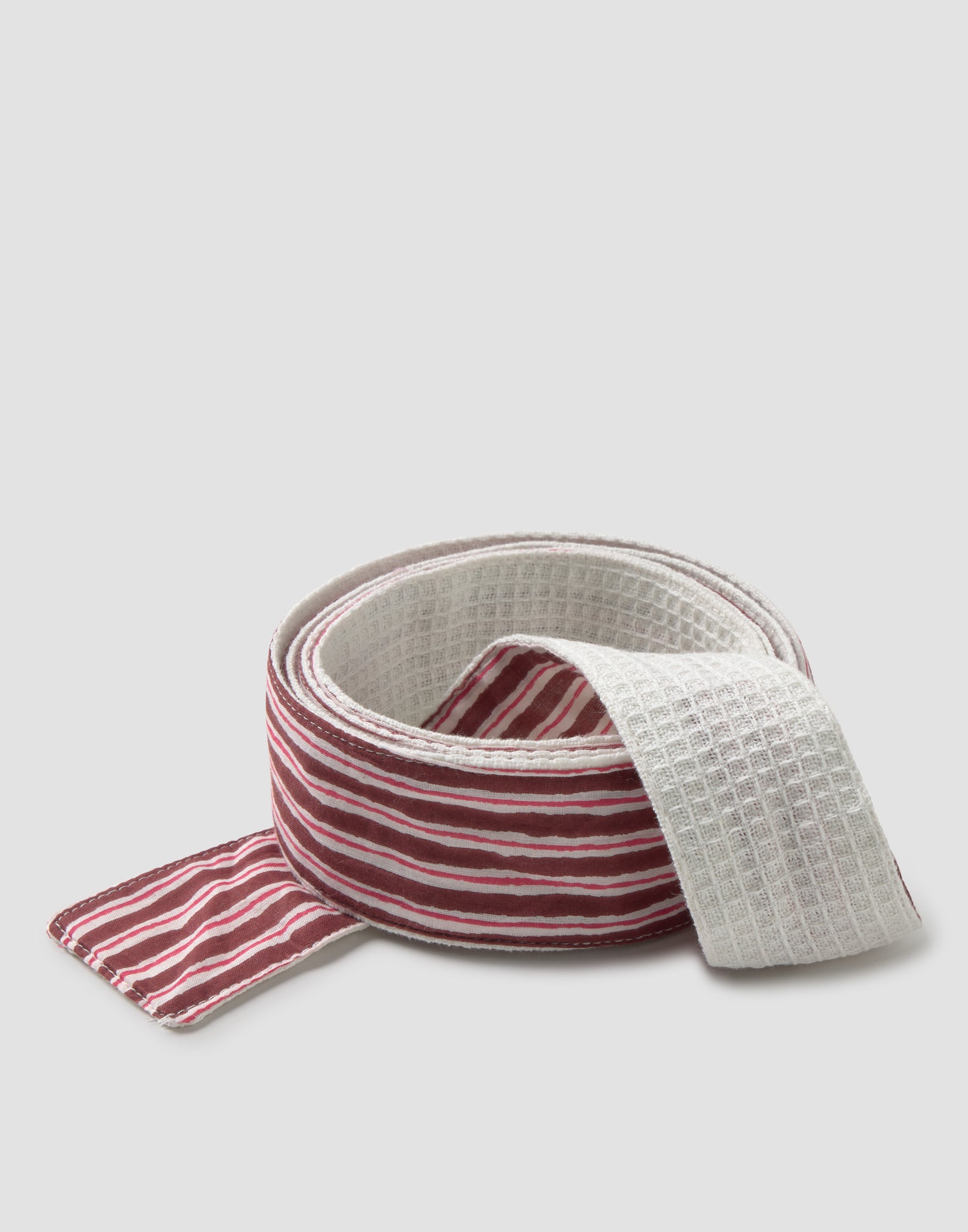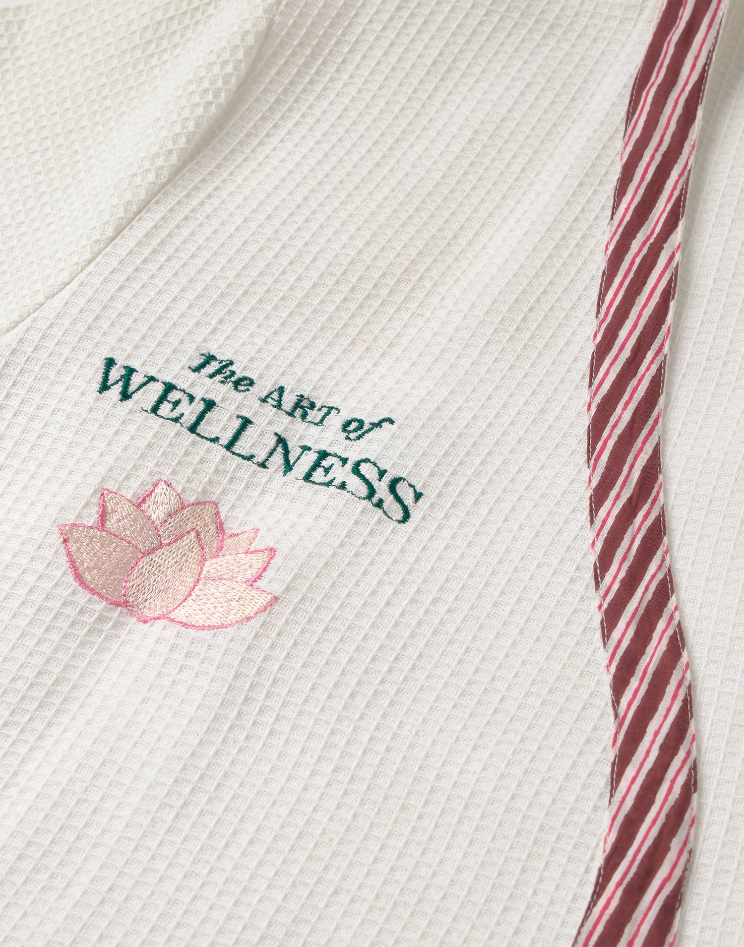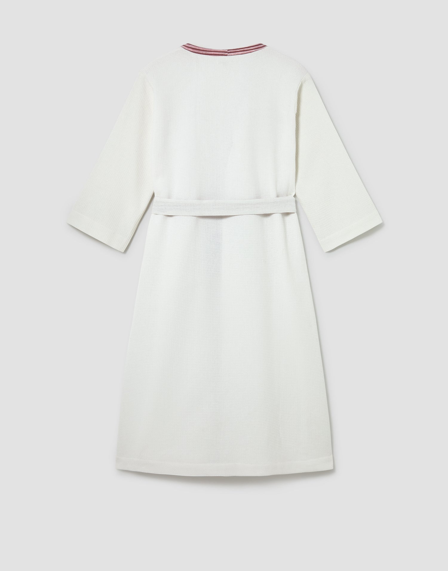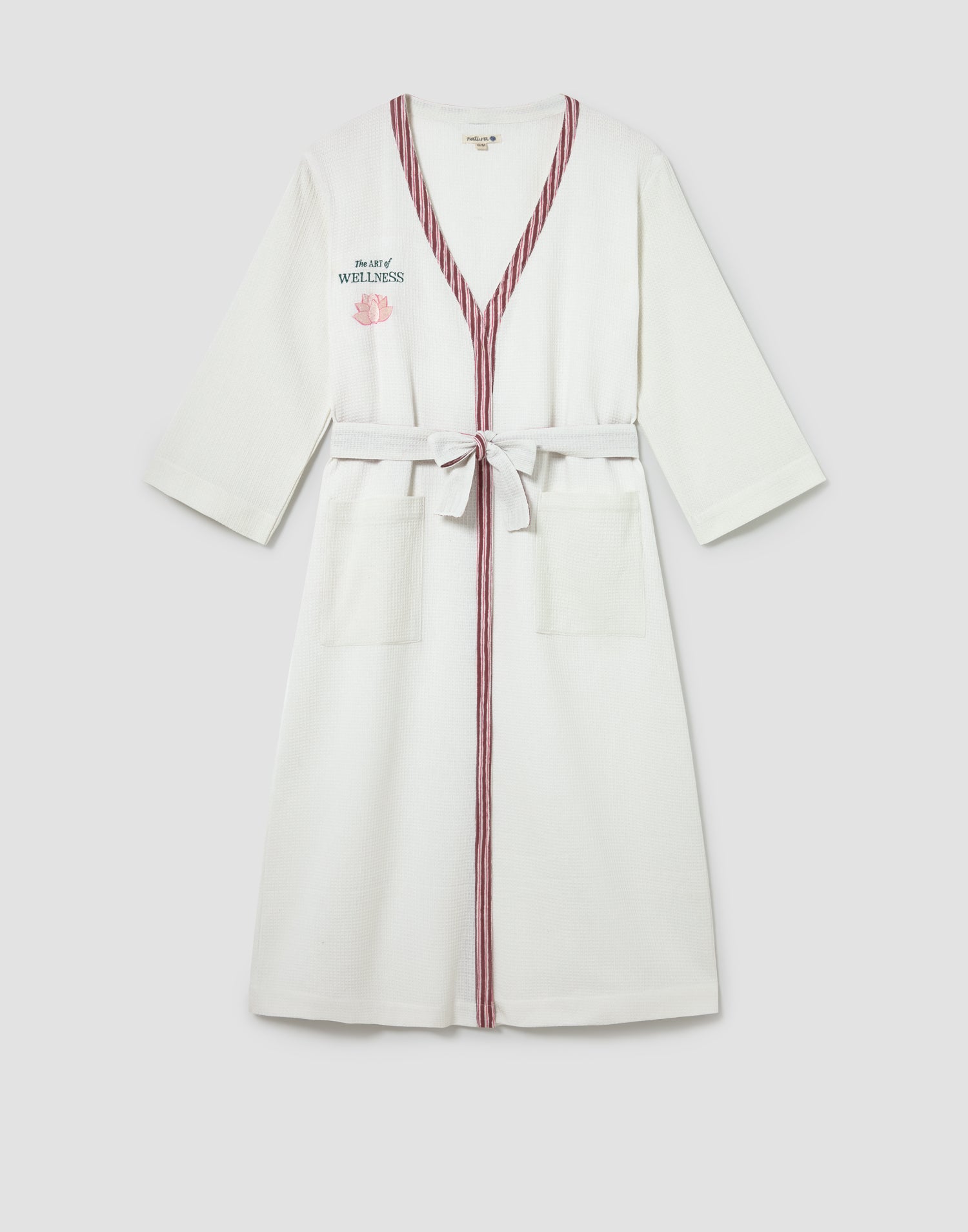 Albornoz confeccionado en algodón waffle con detalle bordado y ribete a contraste. Dos bolsillos delanteros y cinturón.