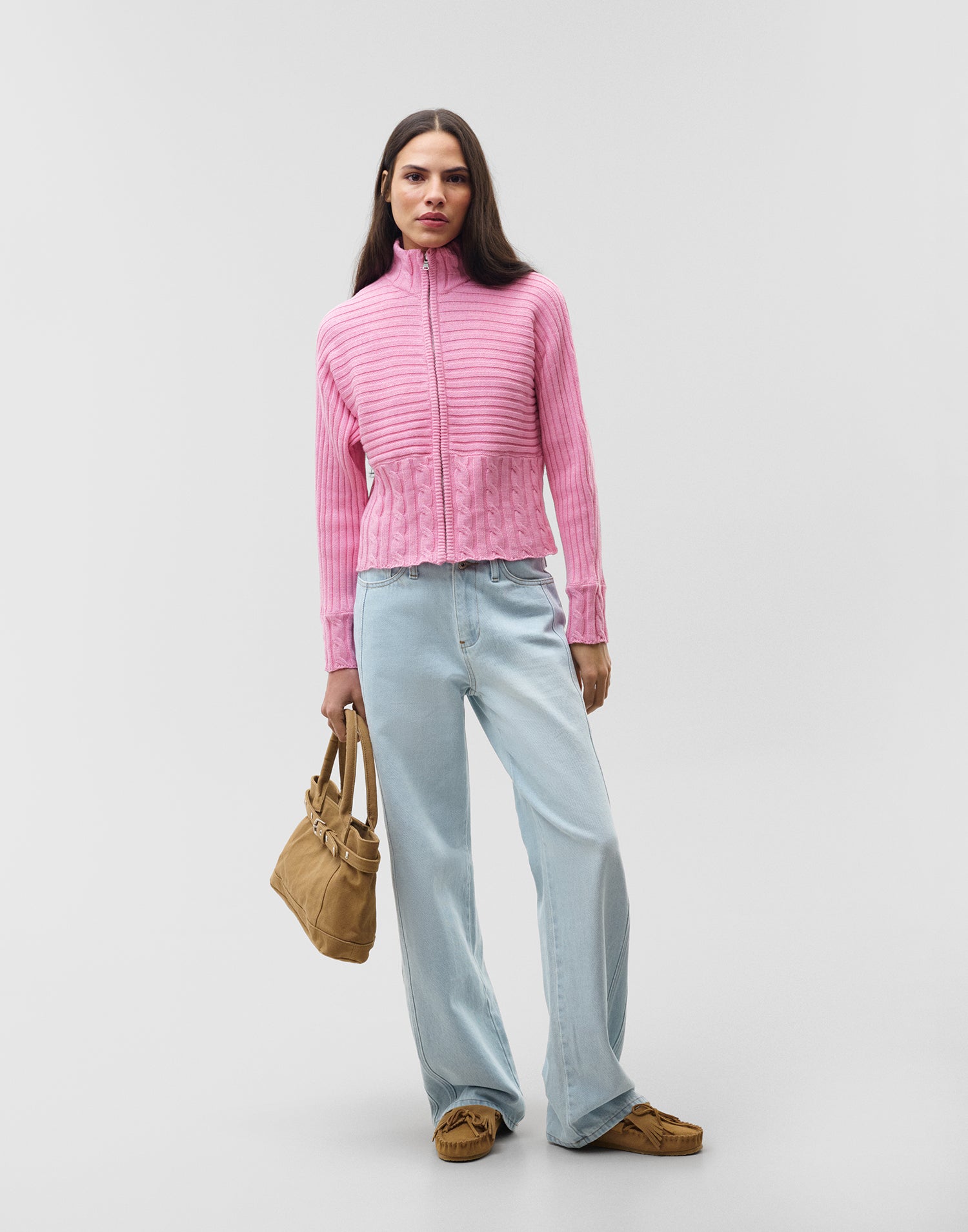 Chaqueta de punto de cuello subido, manga larga y cierre frontal con cremallera.