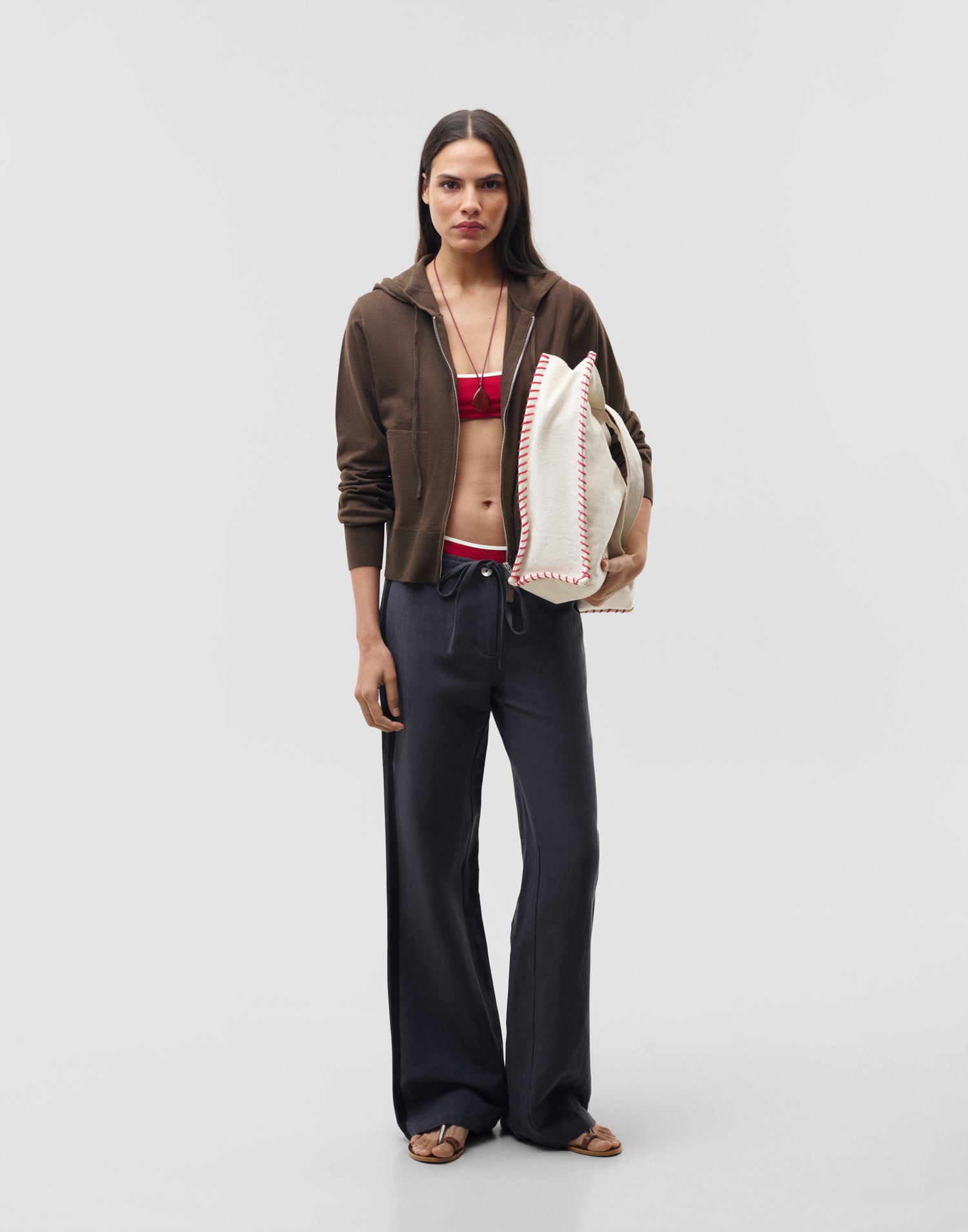 Chaqueta de punto con capucha y diseño de flor de loto en espalda. Manga larga. Cierre frontal con cremallera.