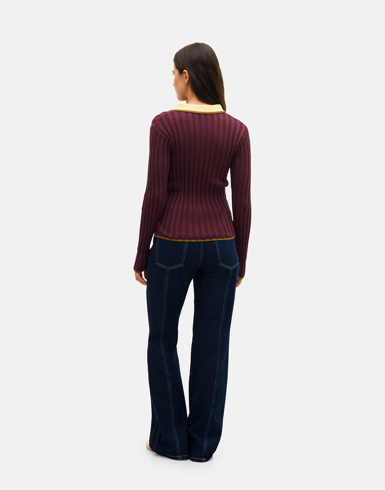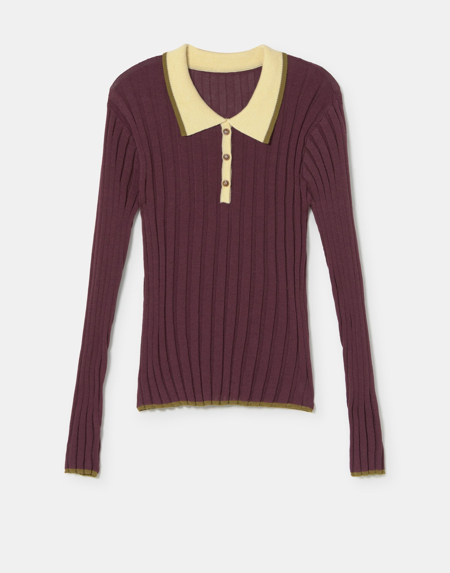 Jersey de punto con tejido en canalé, manga larga y cuello solapa con cierre parcial de botones.