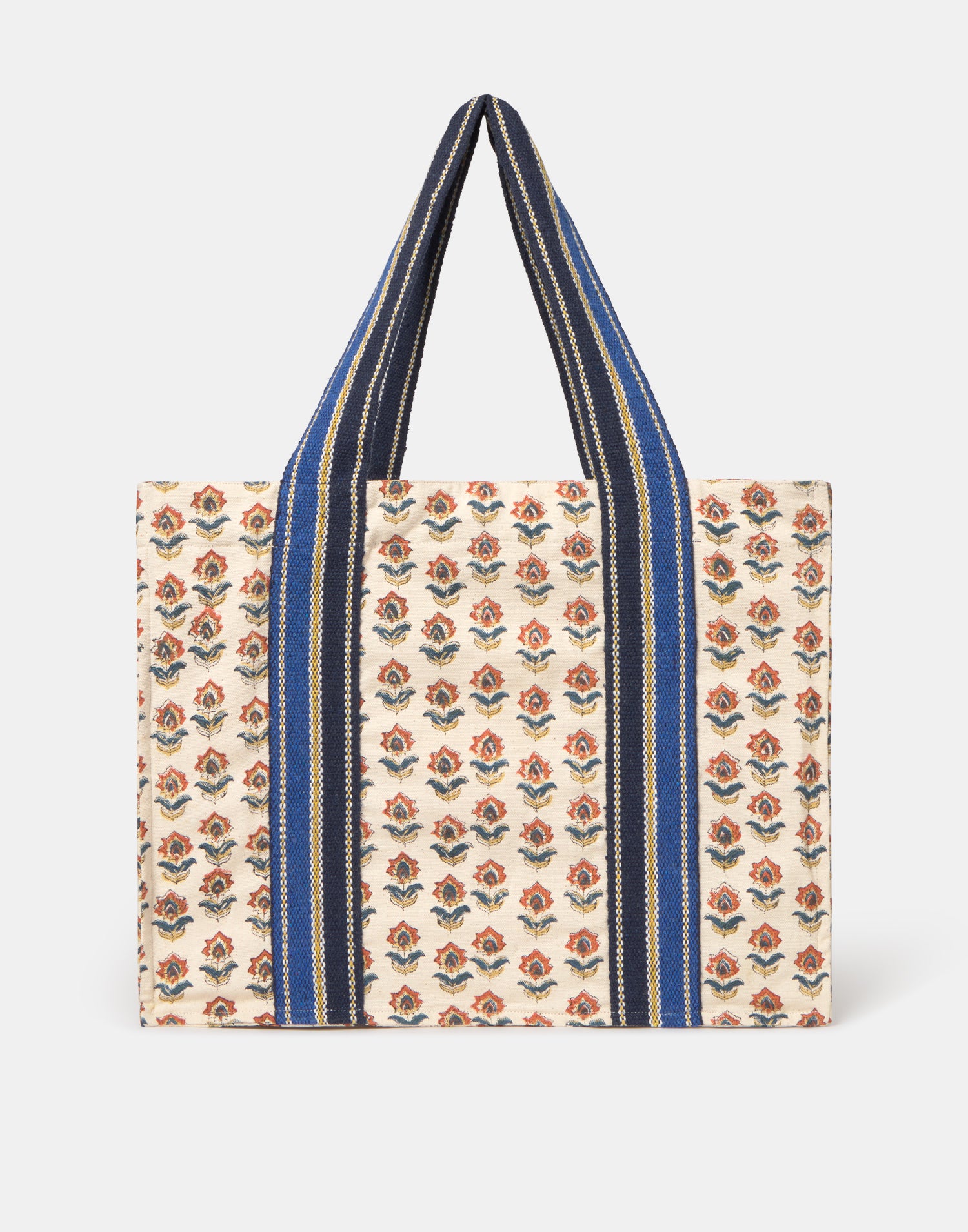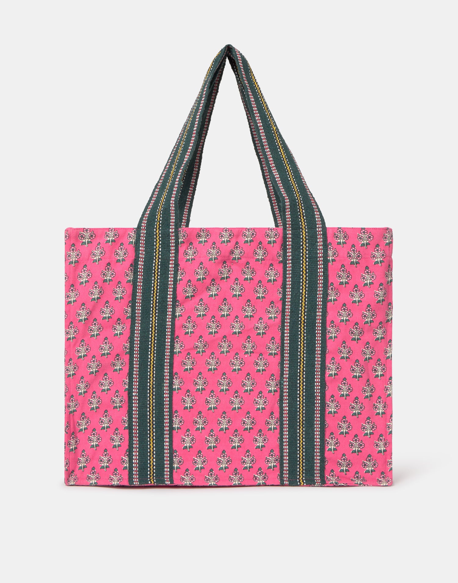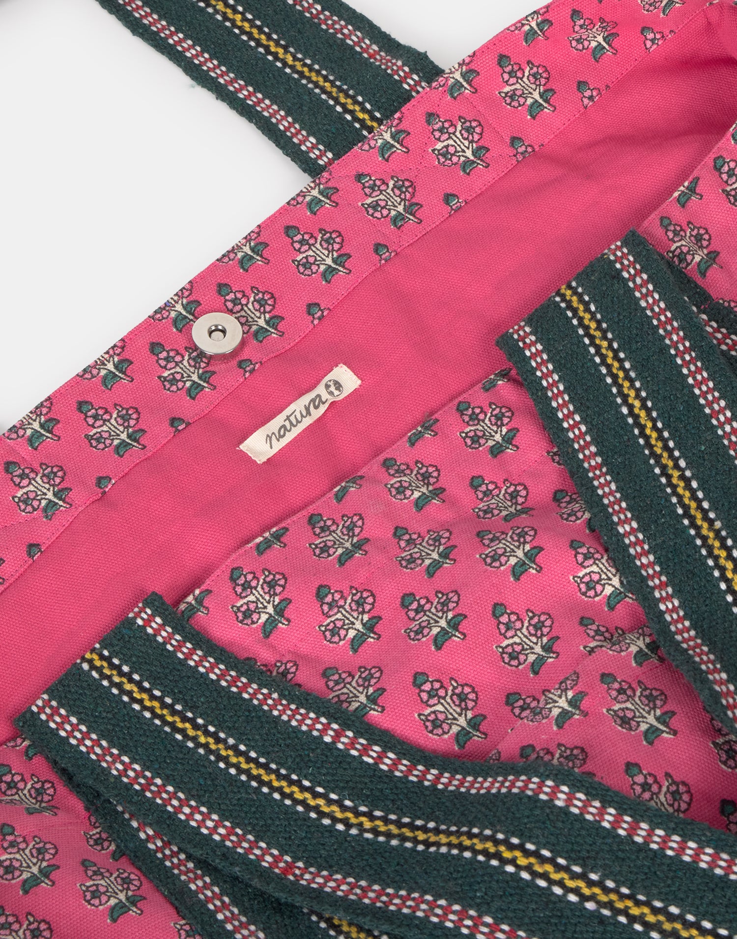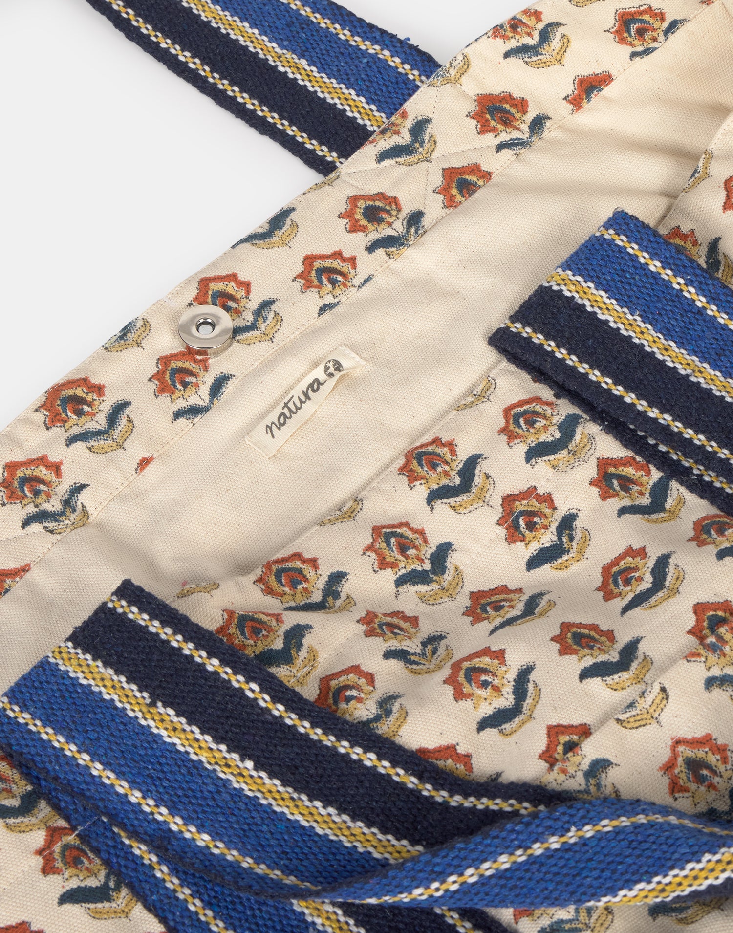 Bolsa de algodón estampada con técnica block print, dos asas y cierre de imán. Bolsillo exterior en la parte frontal y detalle de dos pompones.