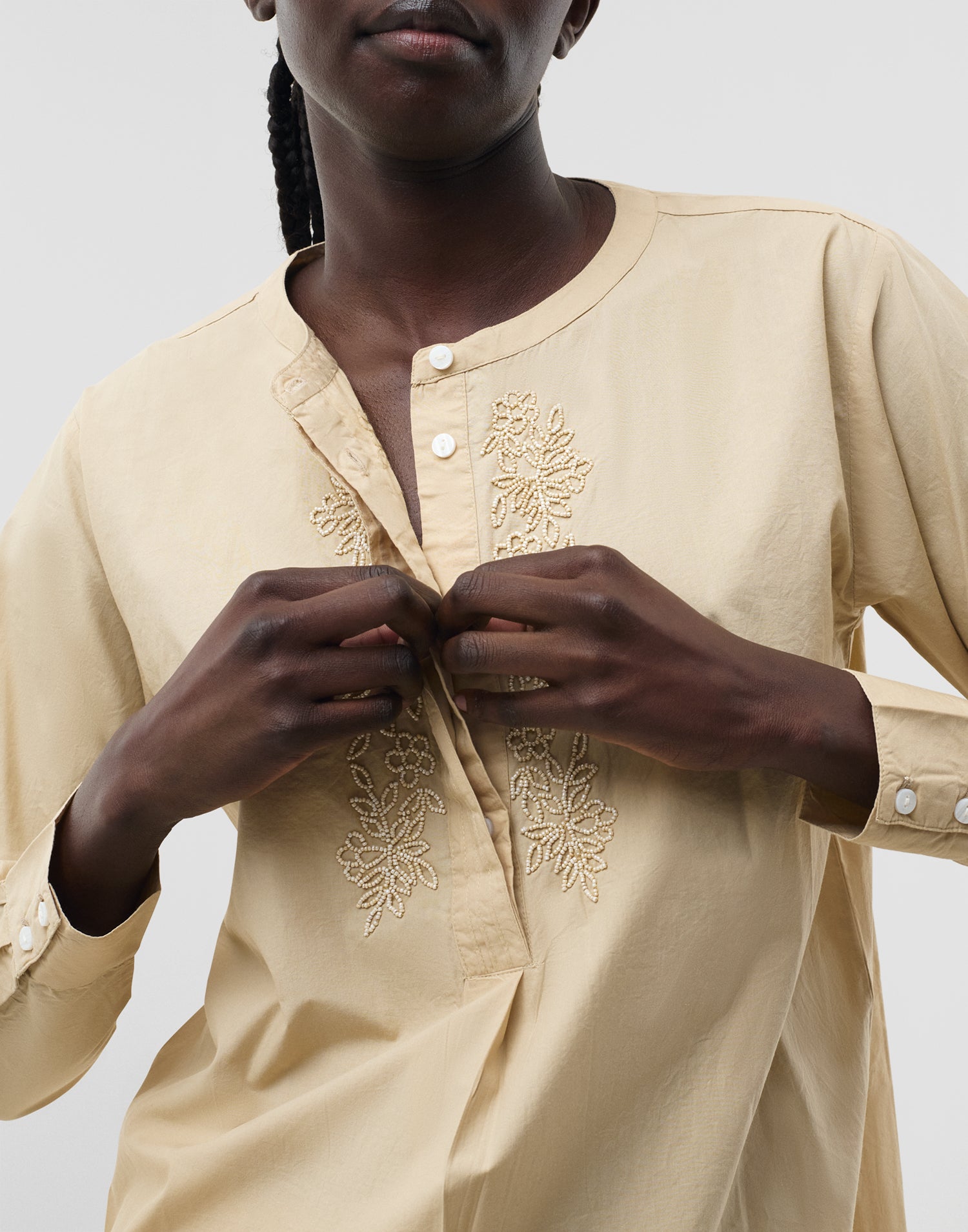 Camisa estilo kurta. Manga larga con puño abotonado, cuello redondo y cierre parcial de botones ocultos. Detalle de apliques a tono en la parte frontal.
