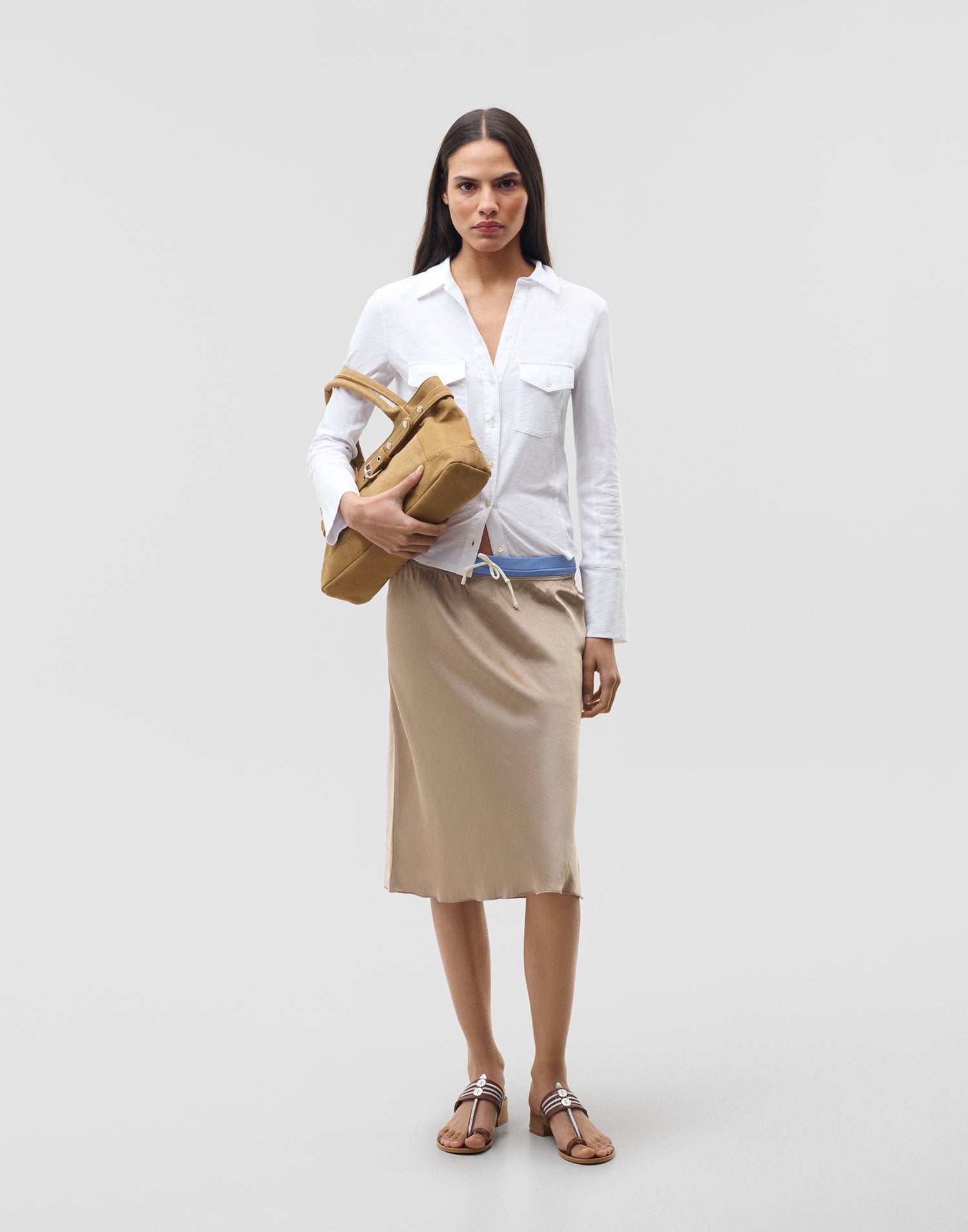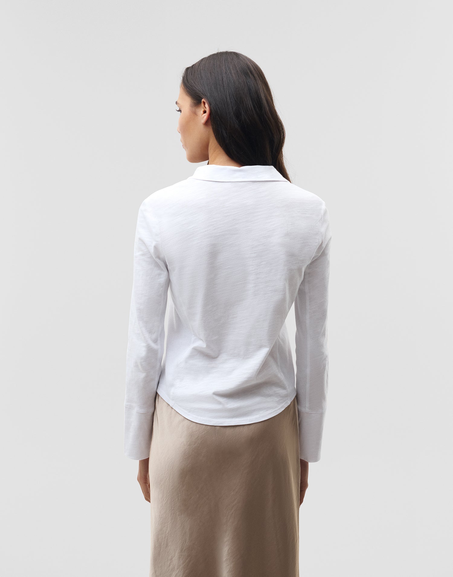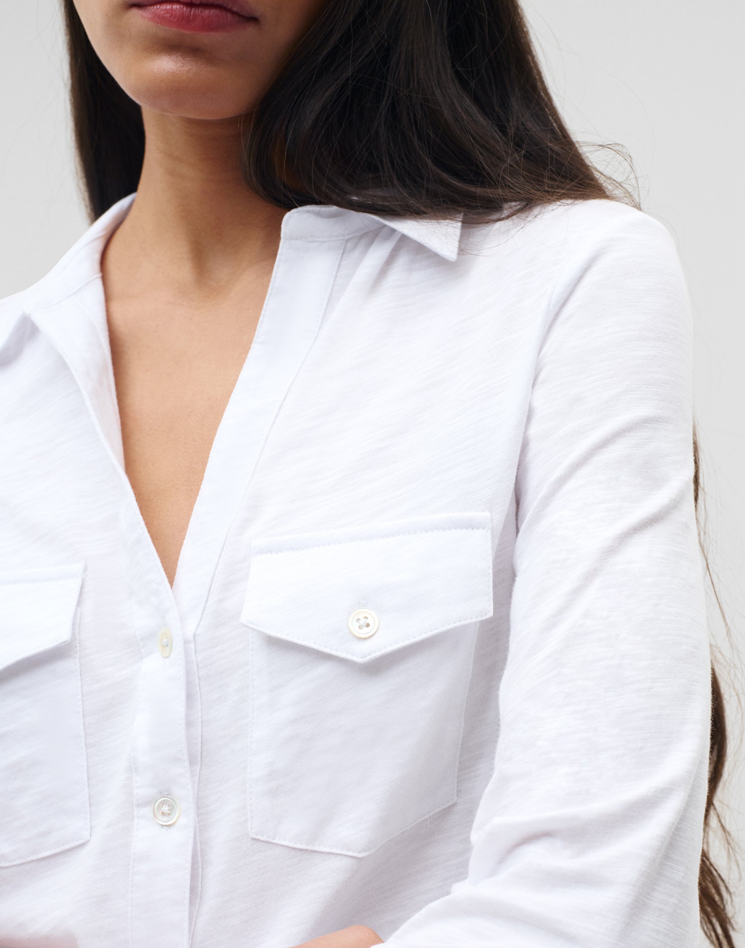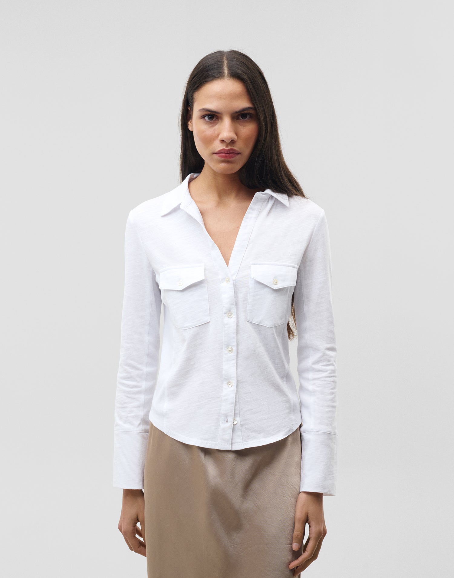 Camisa de manga larga y cuello solapa con cierre frontal de botones. Bolsillos de plastrón con solapa en la parte frontal.