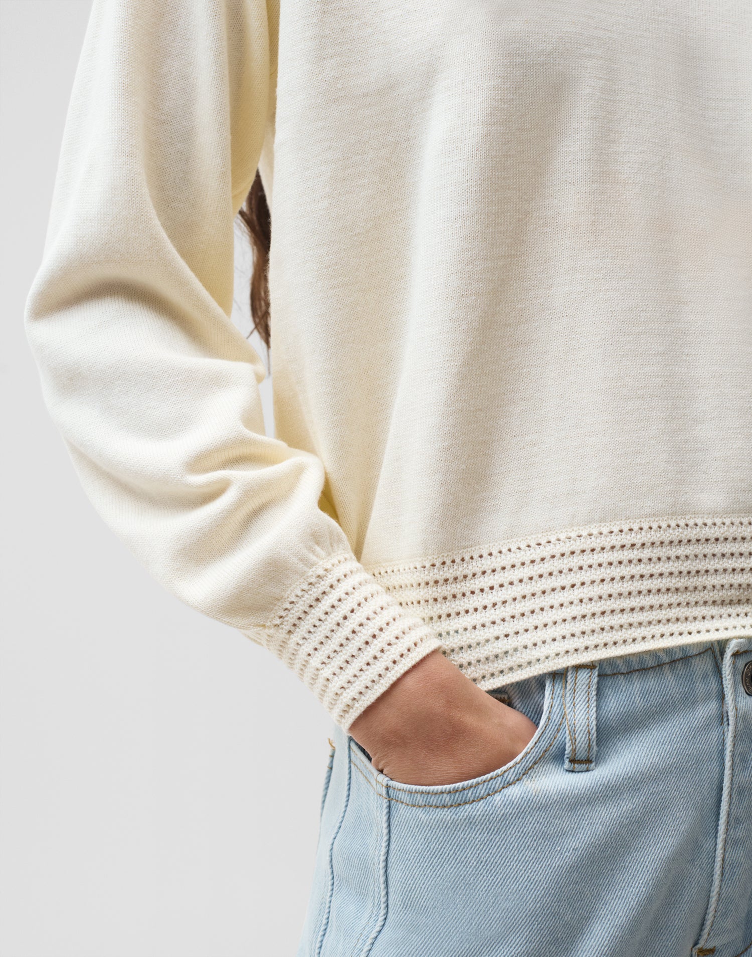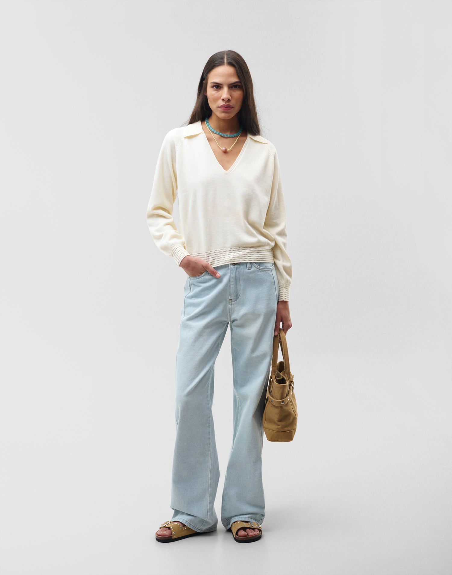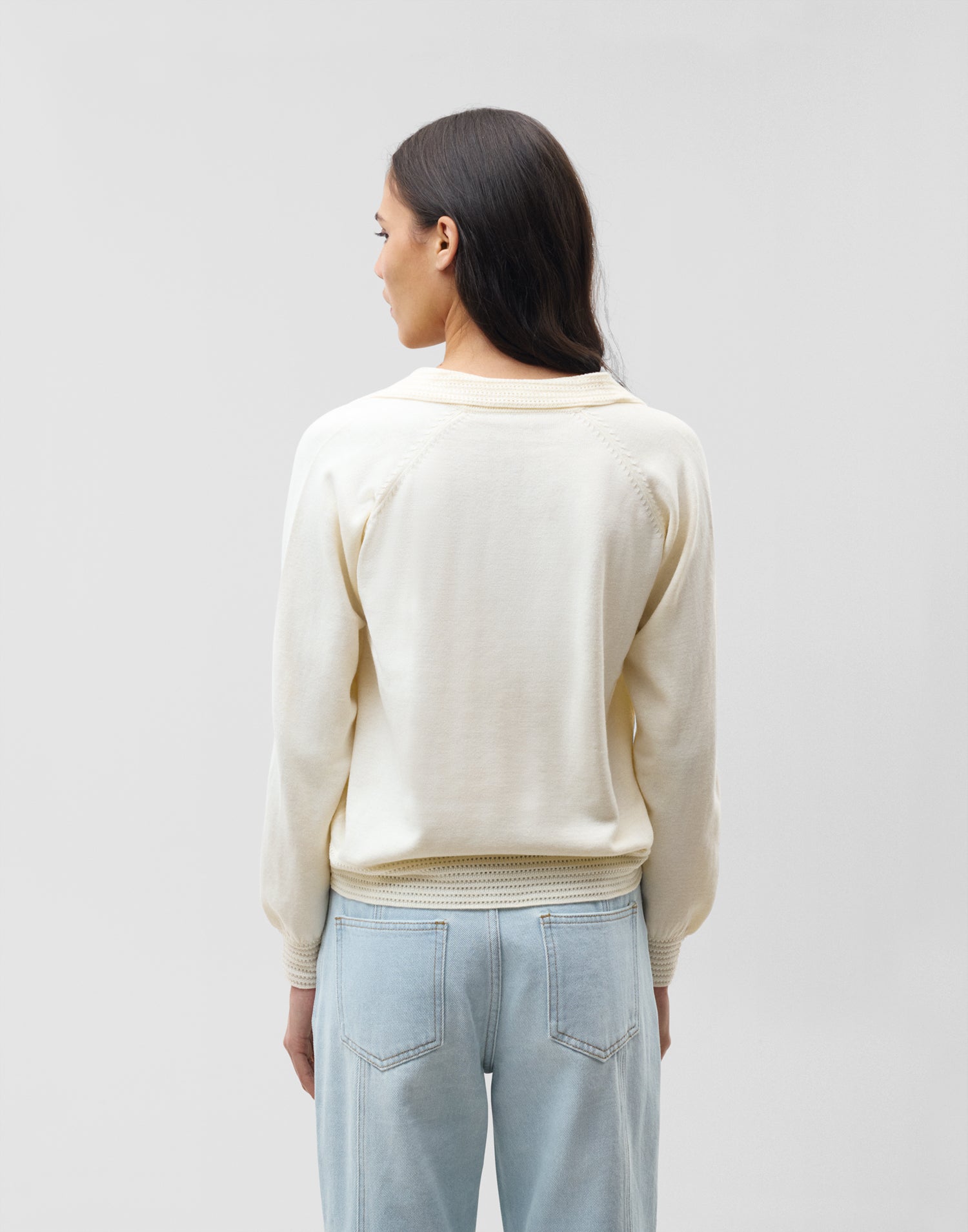 Jersey de punto con escote en pico y cuello solapa. Acabados con detalles calados.
