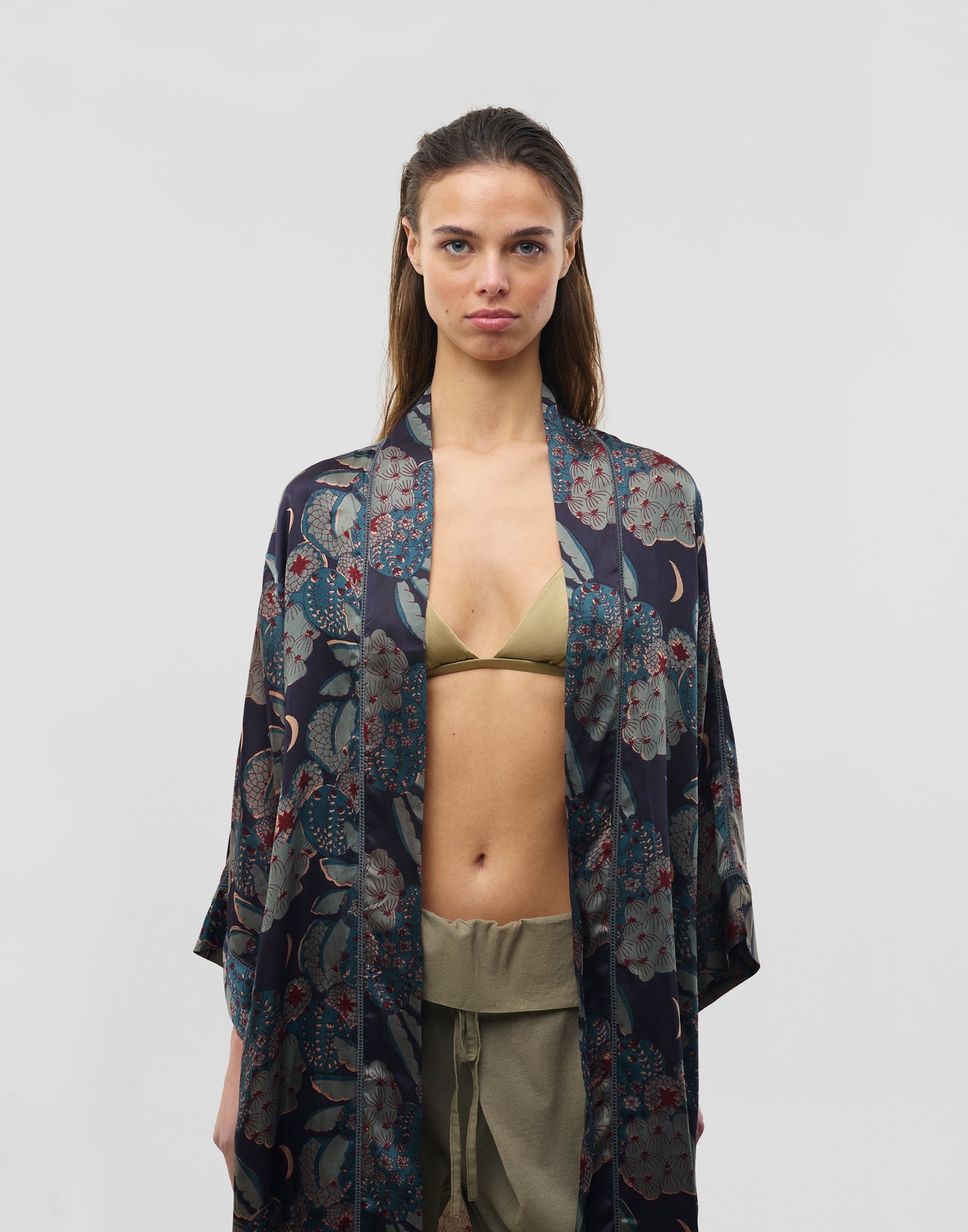 Kimono estampado con acabado satinado y manga larga. Detalle de entredoses y bolsillos laterales.