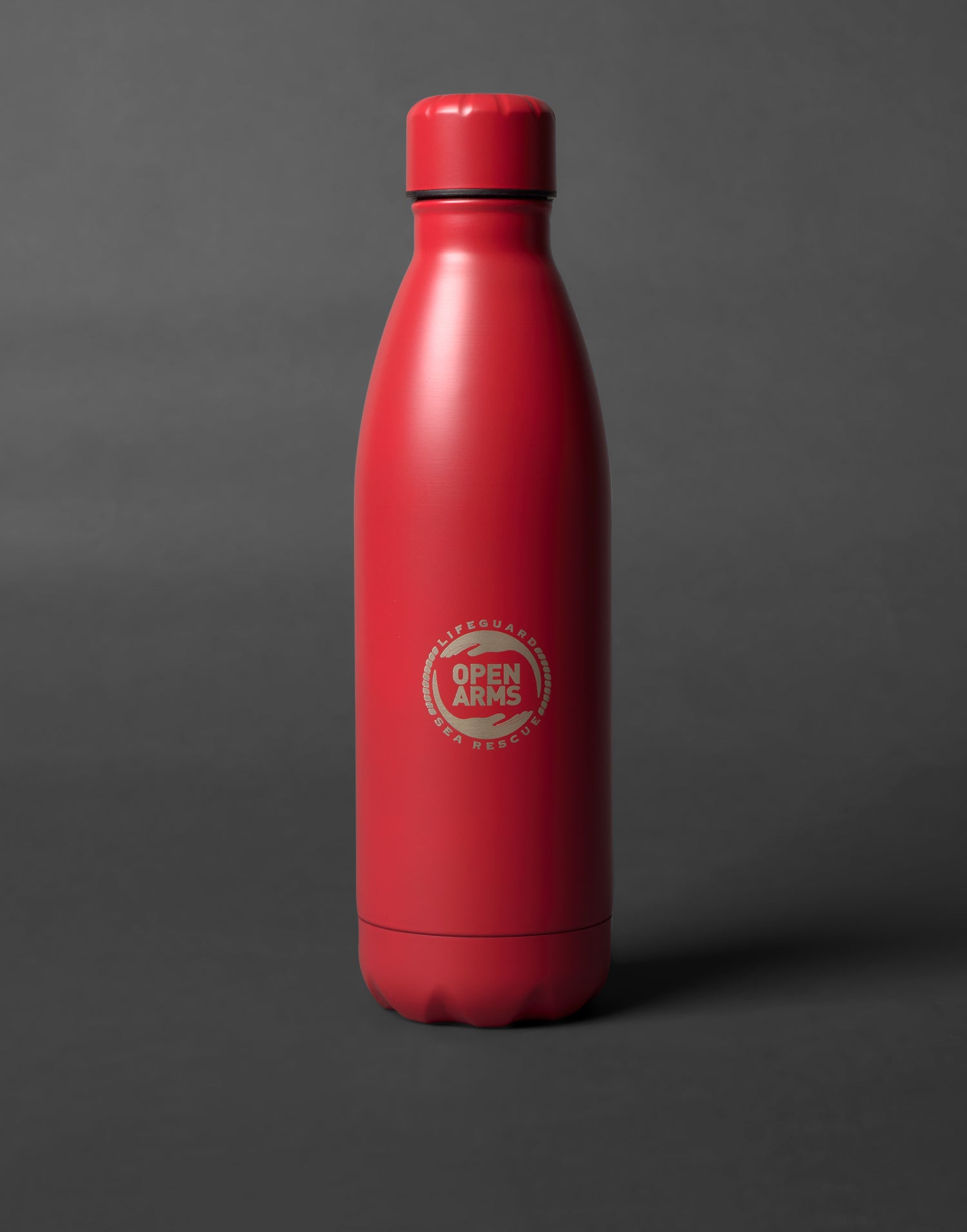 Botella reutilizable de acero inoxidable con tapón de seguridad con rosca. Lleva contigo el agua que necesitas, conservando su temperatura y declarando que eres cómplice de la causa de Open Arms. Tu contribución les ayuda a seguir salvando vidas.