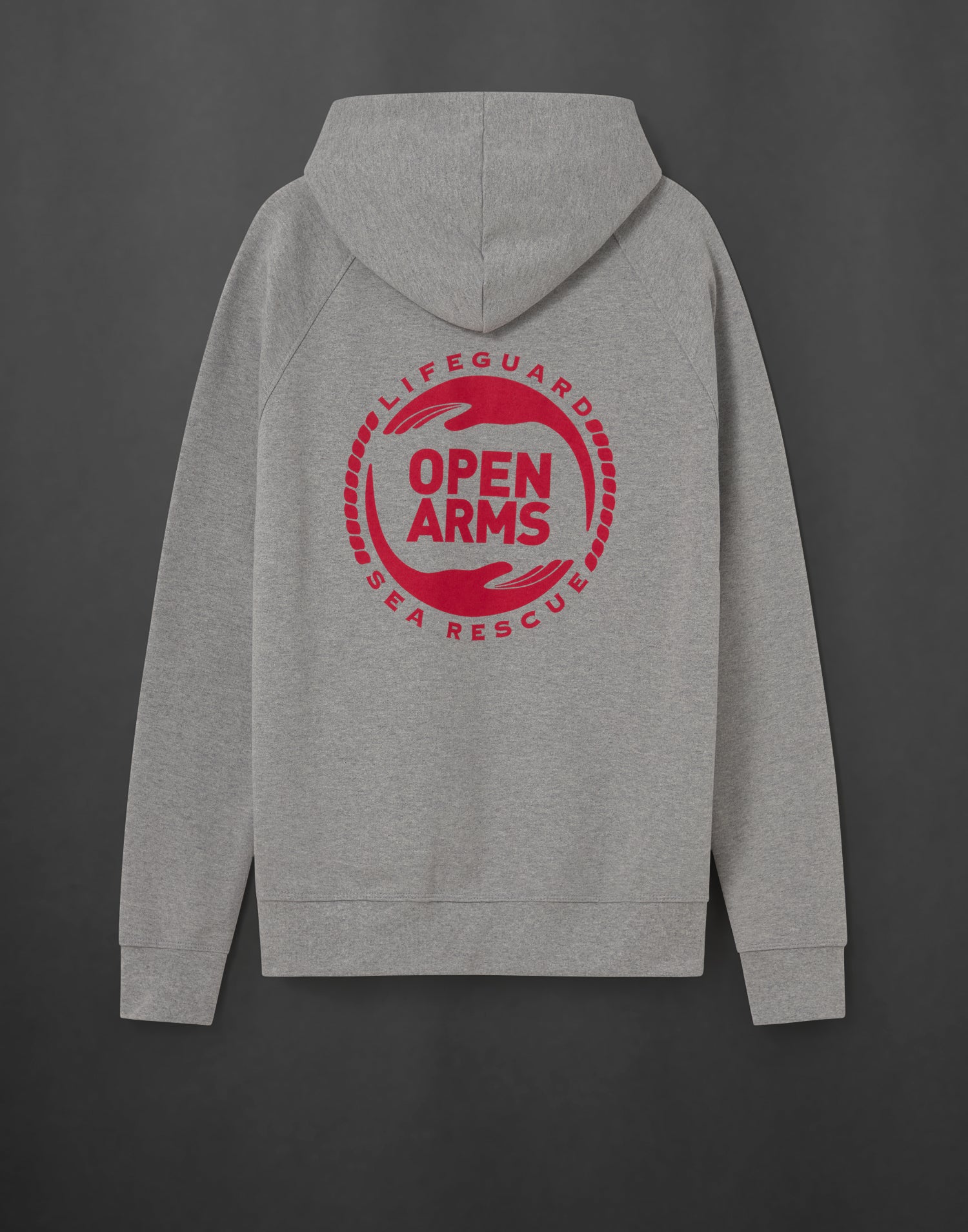 Sudadera gris unisex con capucha y bolsillo estilo canguro, con la palabra Open Arms bordada en la parte delantera y el logo de la organización en la parte trasera.