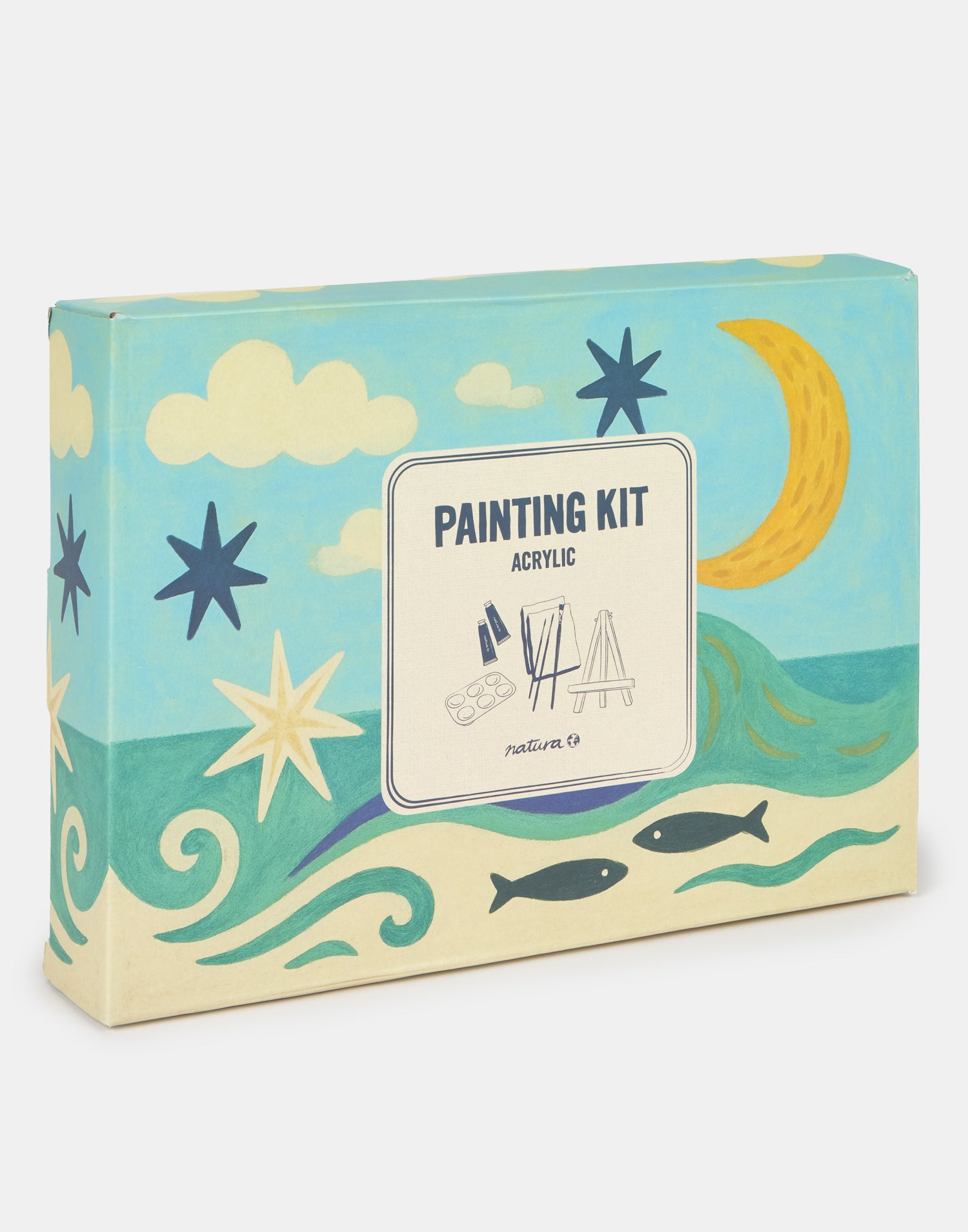 Kit de pintura con 2 lienzos (15x20 cm), 1 caballete de mesa, 1 paleta de plástico, 6 tubos de pintura acrílica y 3 pinceles.