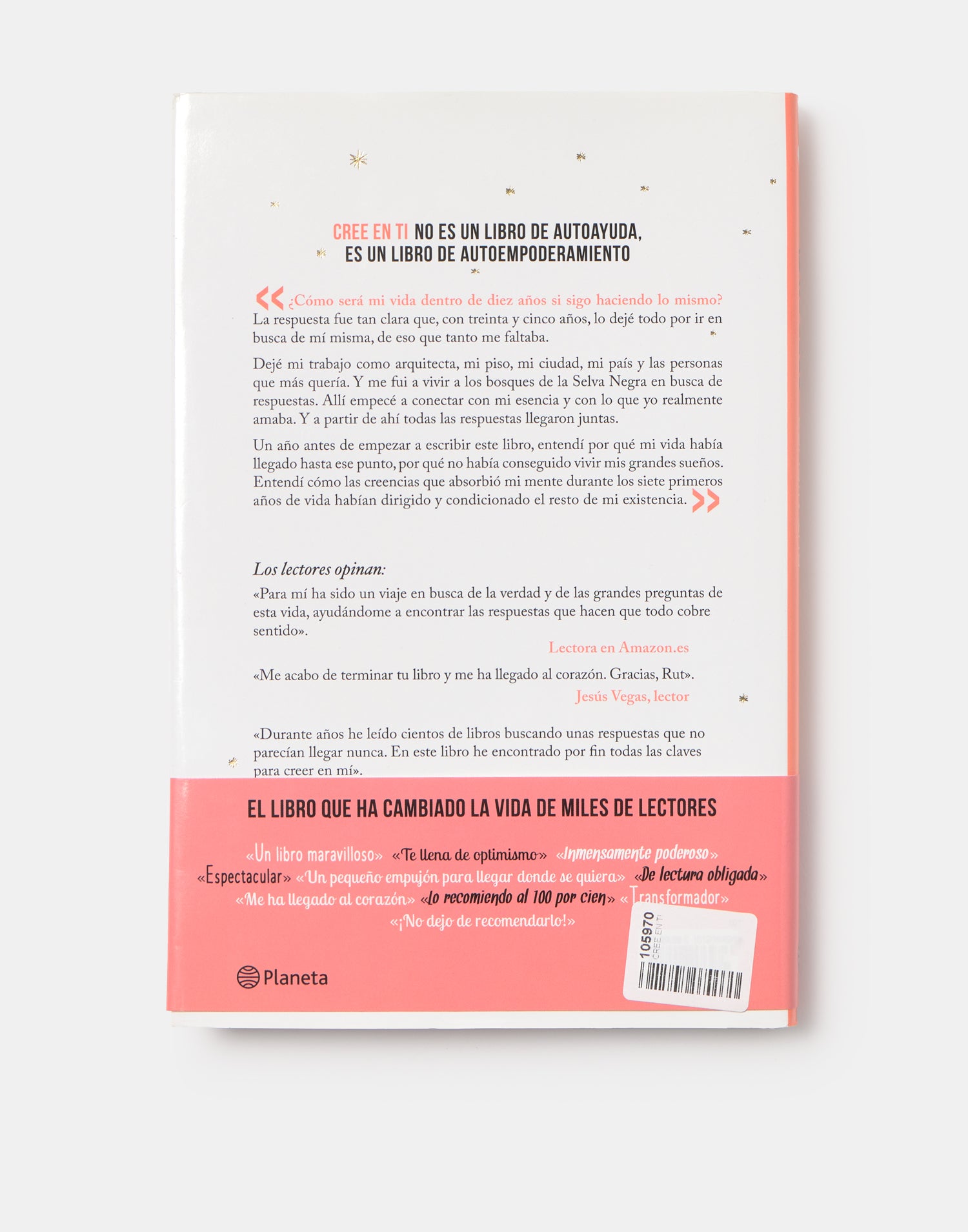 Cree en ti no es un libro de autoayuda, es un libro de autoempoderamiento. «¿Cómo será mi vida dentro de diez años si sigo haciendo lo mismo? La respuesta fue tan clara que con 35 años lo dejé todo por ir en busca de mí misma, de eso que tanto me faltaba. Dejé mi trabajo como arquitecta, mi piso, mi ciudad, mi país y las personas que más quería. Y me fui a vivir a los bosques de la Selva Negra en busca de respuestas. Allí empecé a conectar con mi esencia y con lo que yo realmente amaba. Y a partir de ahí, todas las respuestas llegaron juntas. Un año antes de empezar a escribir este libro entendí por qué mi vida había llegado hasta ese punto. Por qué no había conseguido vivir mis grandes sueños. Entendí cómo las creencias que absorbió mi mente durante los siete primeros años de vida habían dirigido y condicionado el resto de mi vida.»