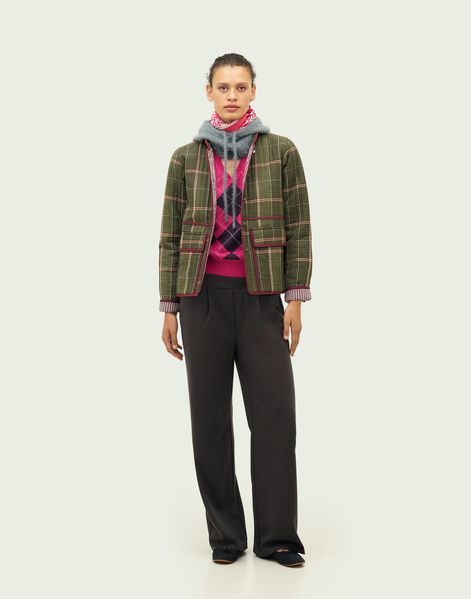 Chaqueta confeccionada en algodón con diseño acolchado. Cuello redondo, bolsillos de plastrón en delantero y cierre frontal de botones forrados a tono.