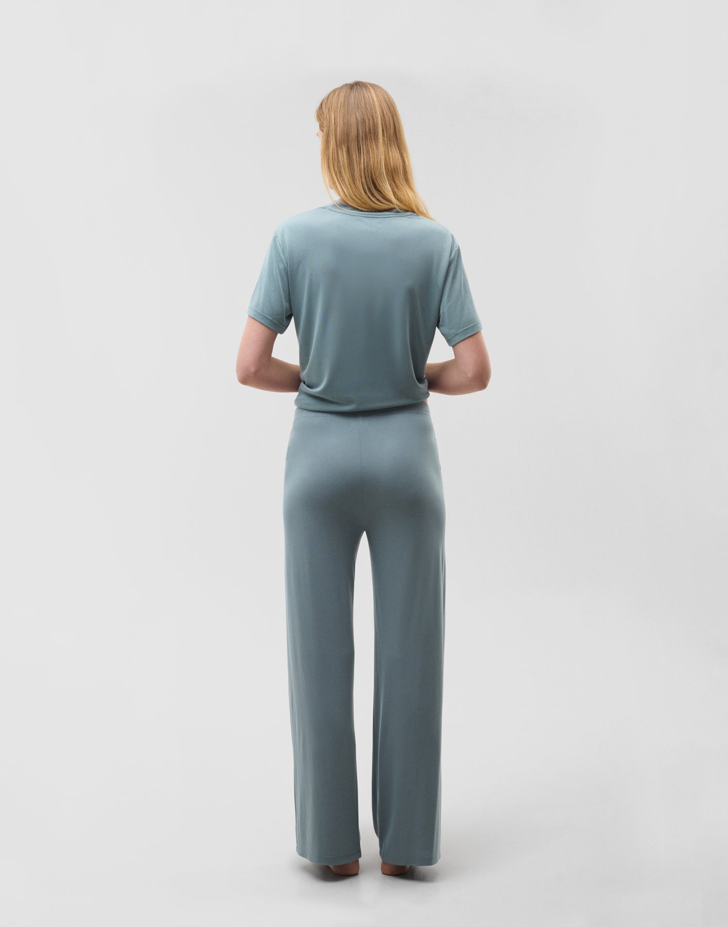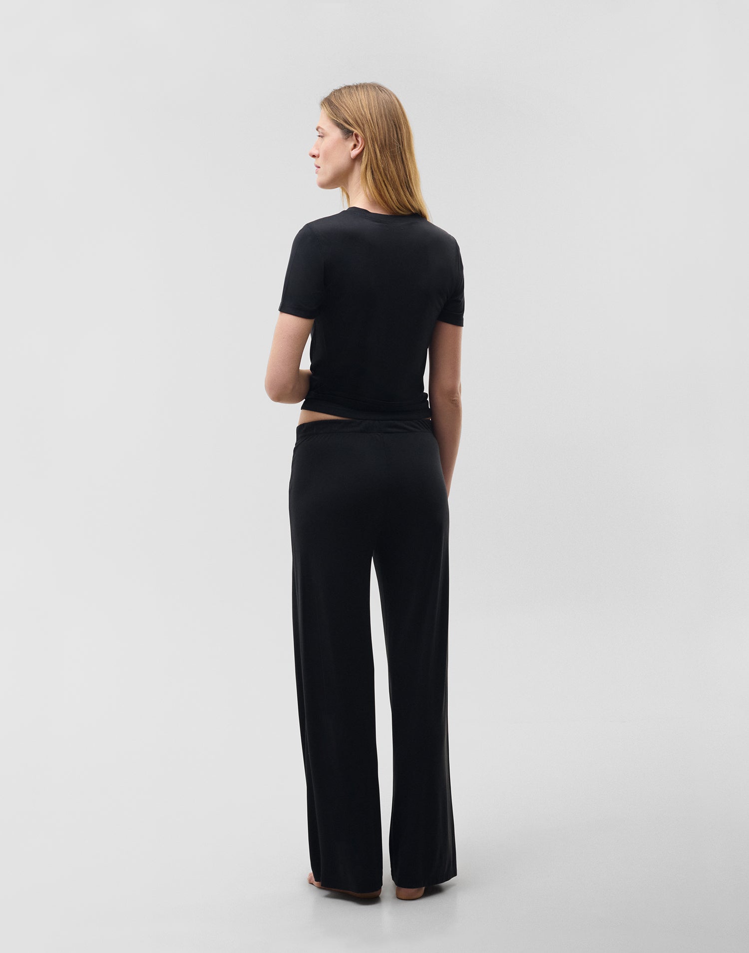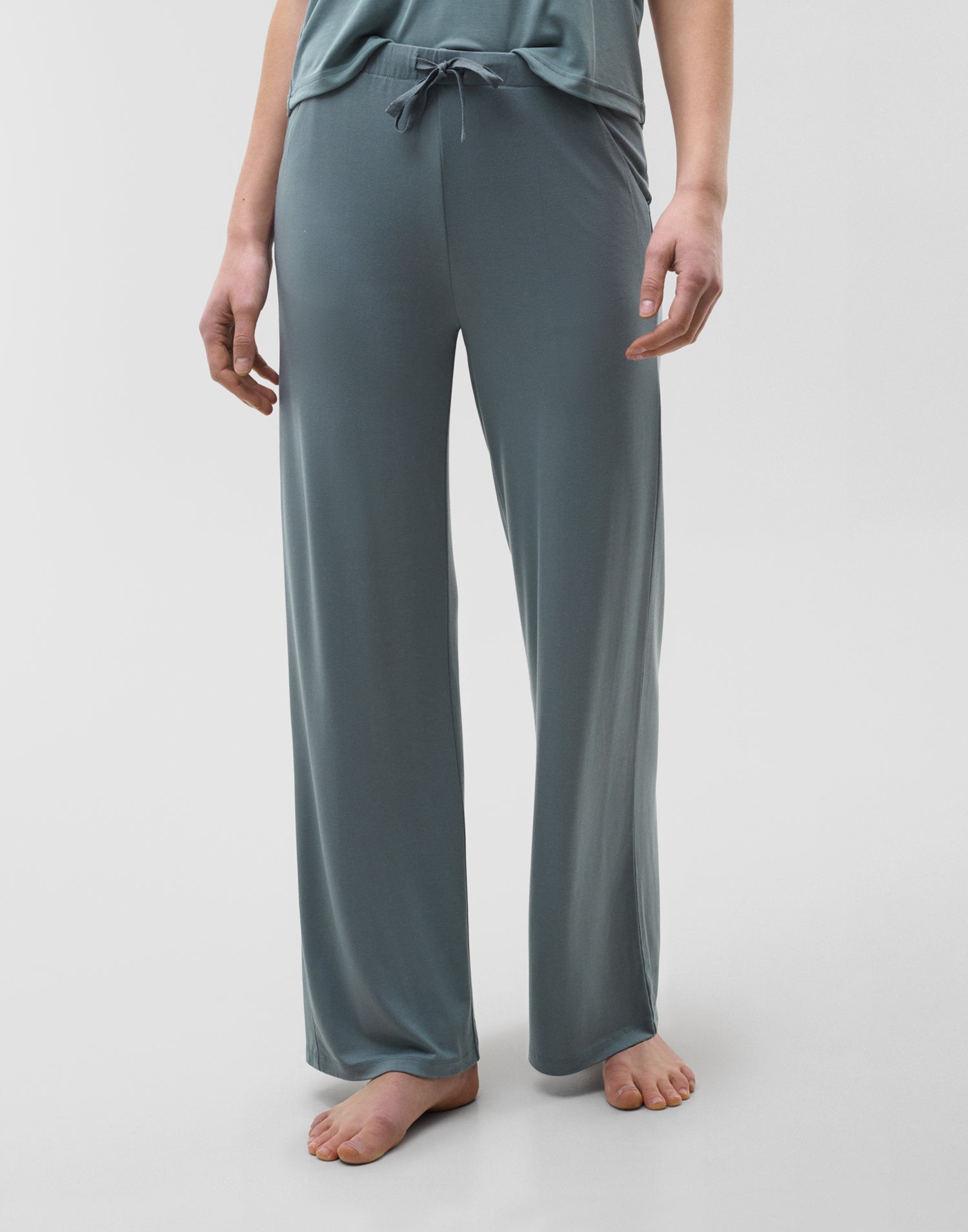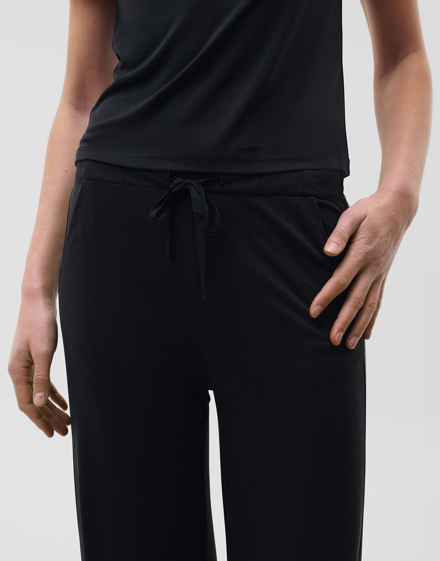 Pantalón de corte recto y tejido elástico. Acabado con bolsillos laterales y cintura ajustable con cordón.