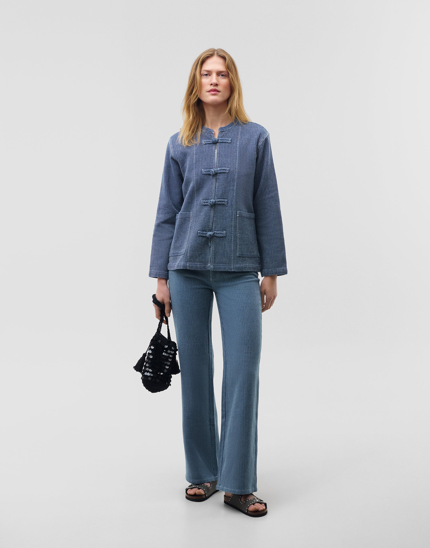 Pantalón tejano con pierna recta, bolsillos laterales y bolsillos de plastrón en espalda. Cintura con trabillas y cierre frontal con cremallera y botón.