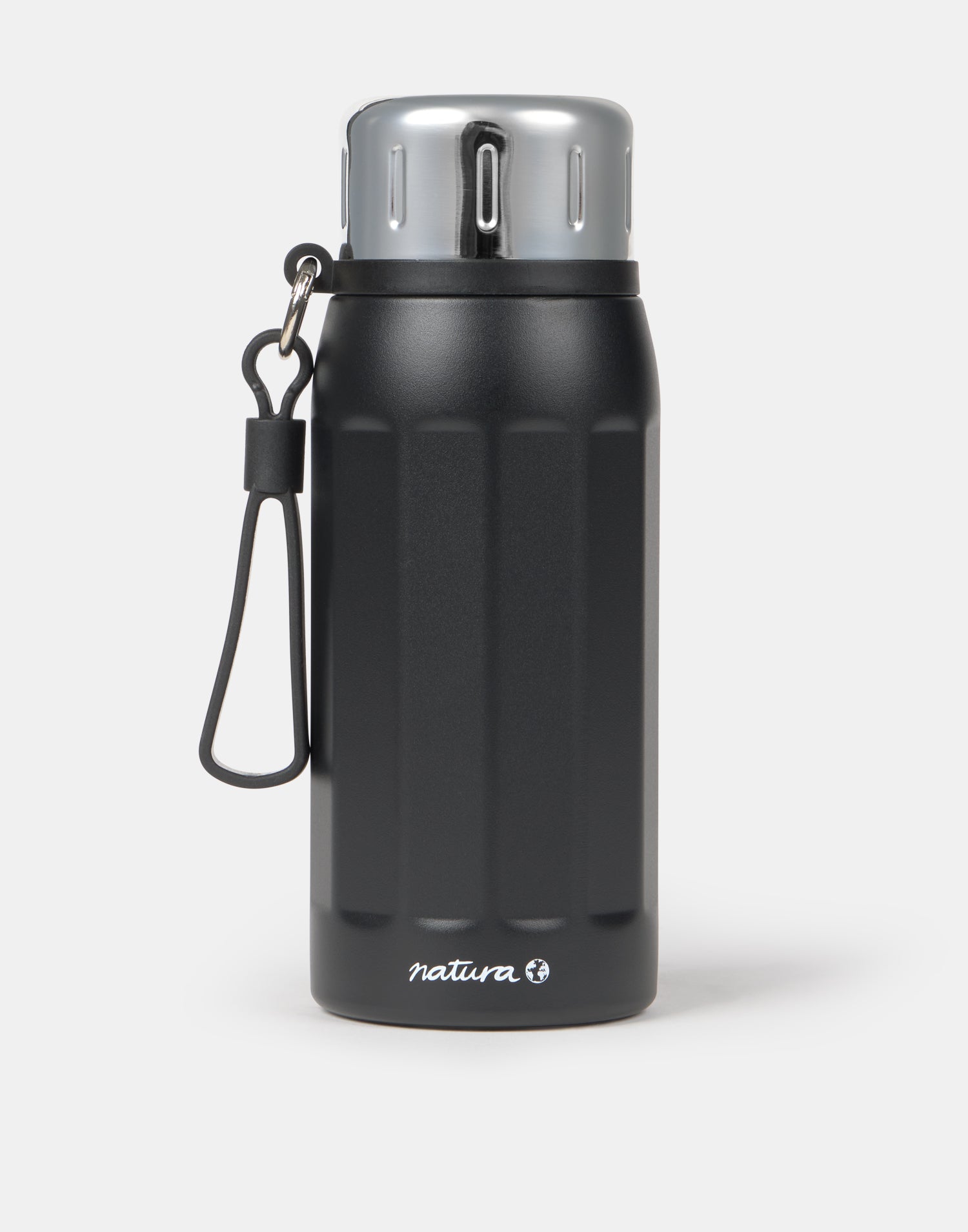 Botella metálica reutilizable con capacidad de 500 ml y con asa de silicona para facilitar su transporte. Puede usarse como termo.