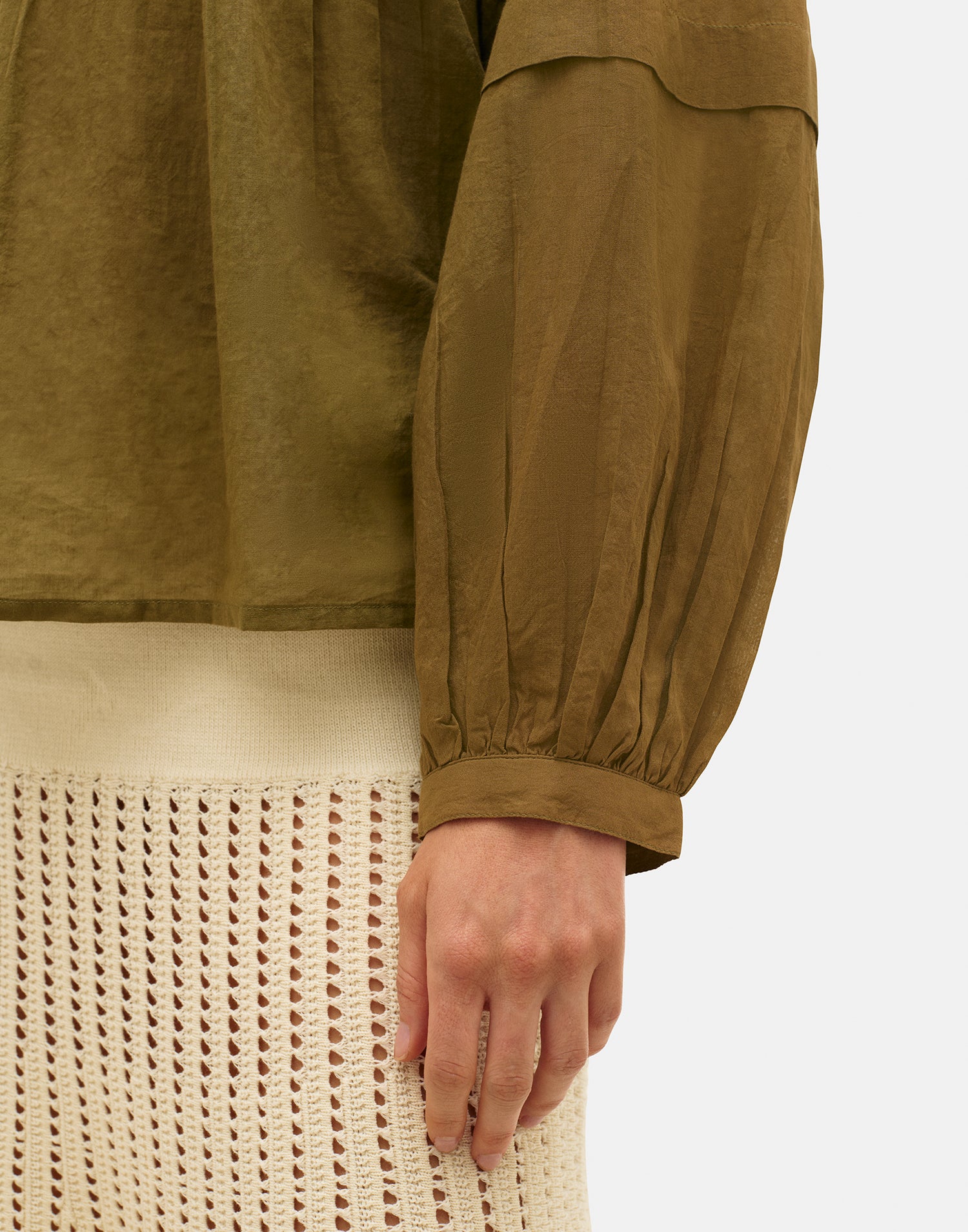 Langarmbluse mit V-Ausschnitt, plissierten Details auf der Vorderseite und Knopfmanschetten.