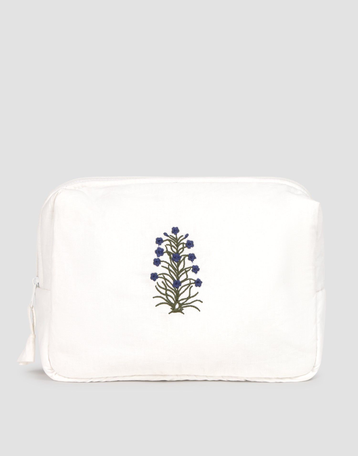 Kosmetiktasche aus Baumwolle mit Reißverschluss, Innentasche und gesticktem Detail auf der Vorderseite.