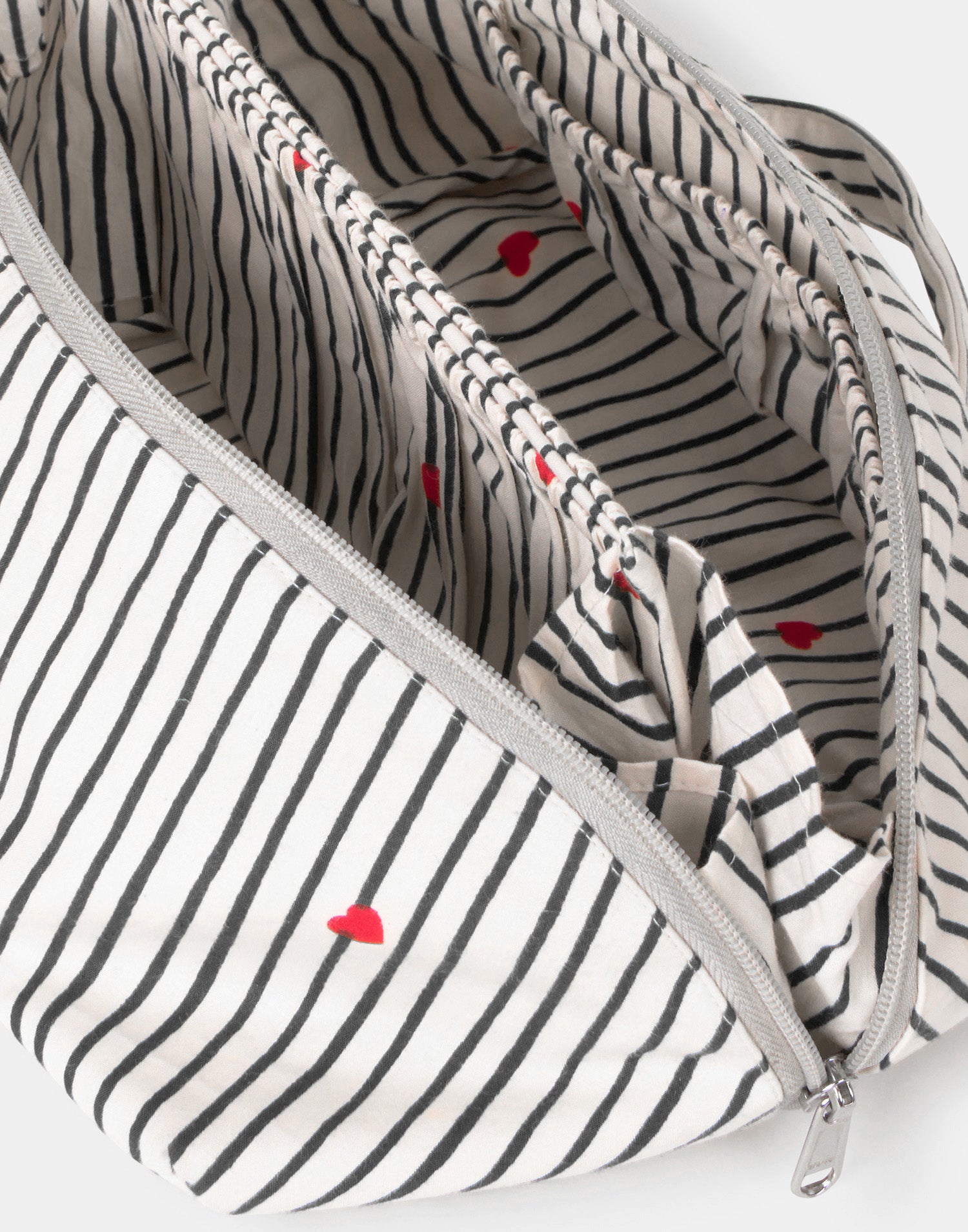 Bedruckte Kulturtasche mit Reißverschluss, seitlichem Griff und weiter Öffnung. Innenfutter aus Baumwolle mit mehreren Fächern.