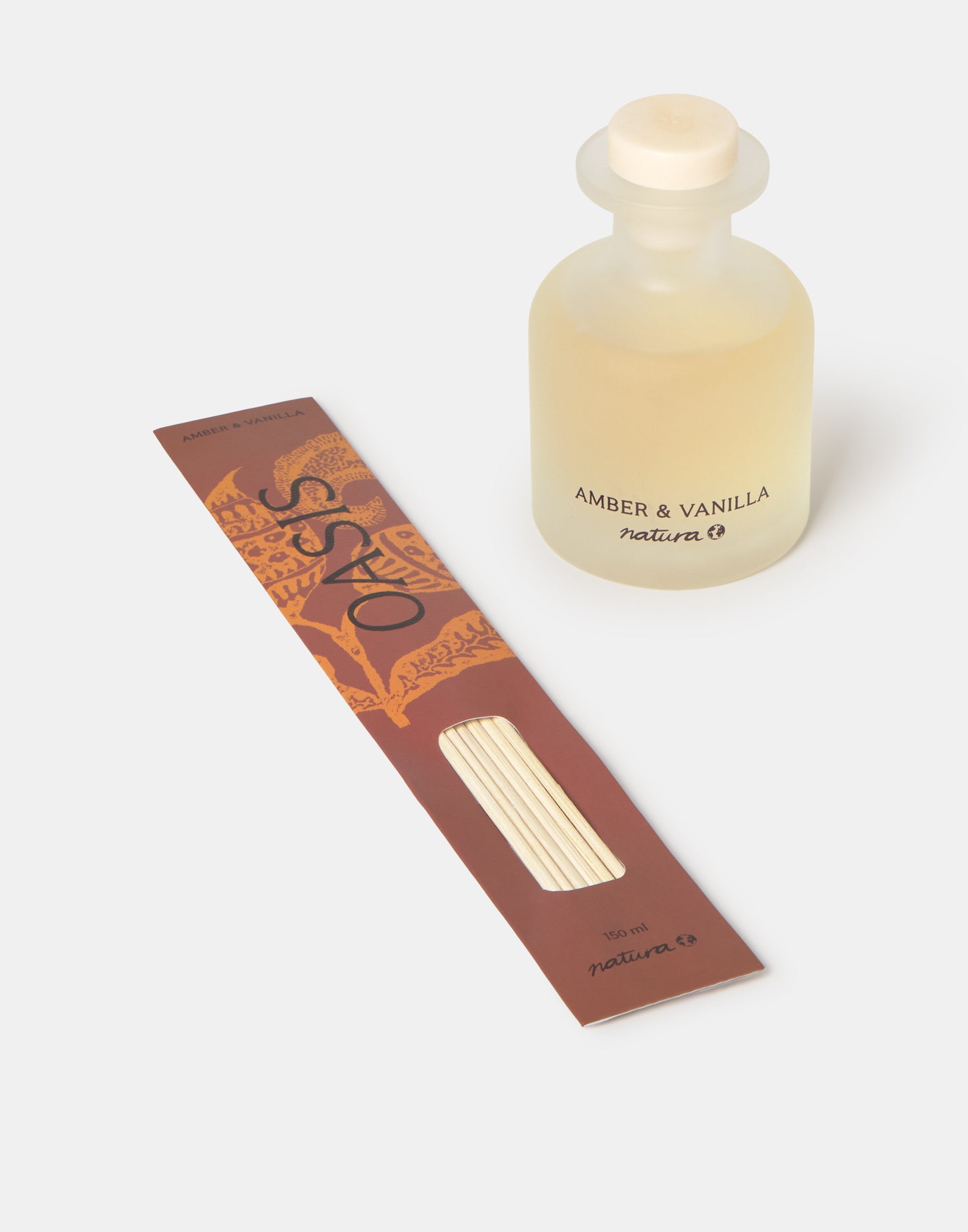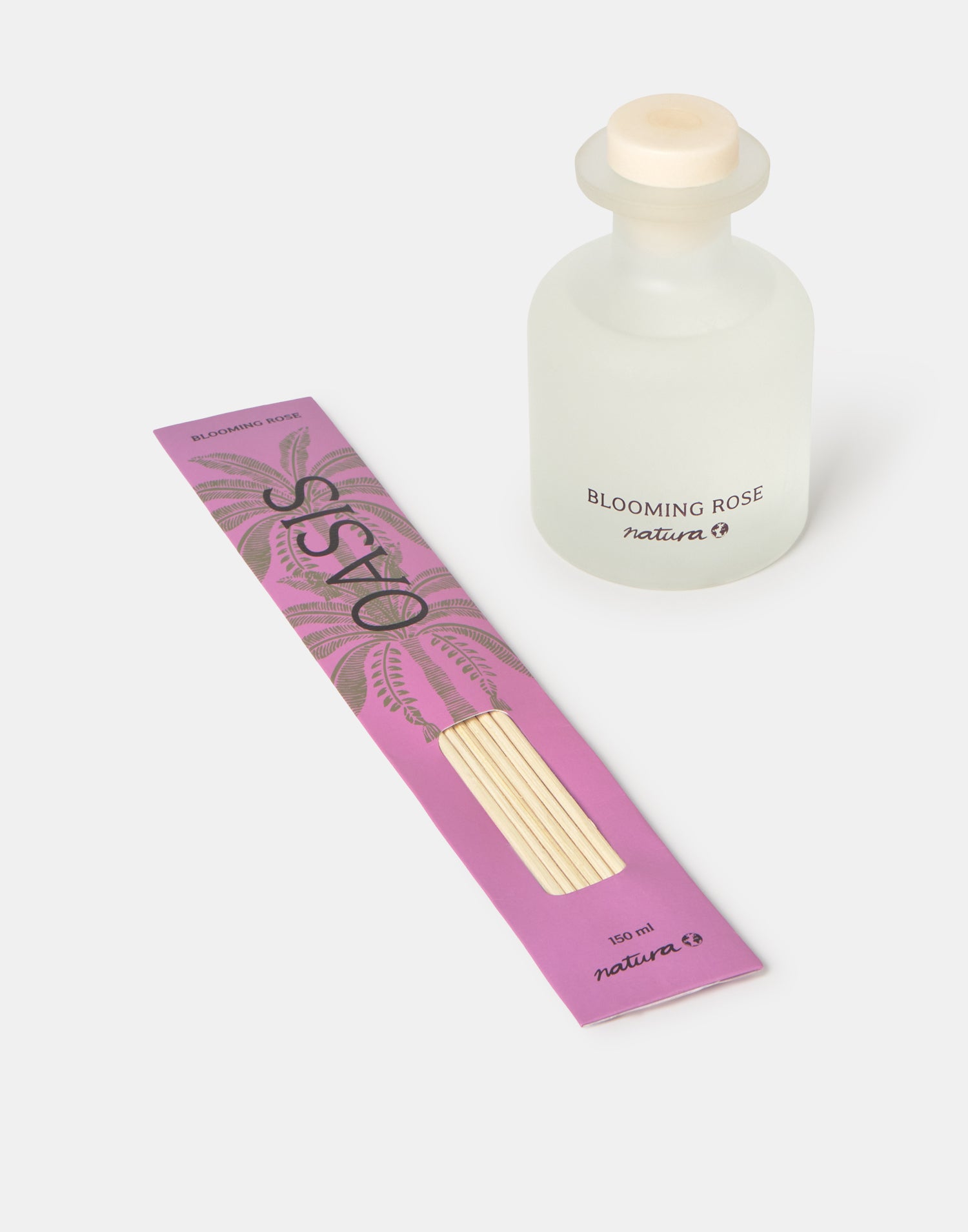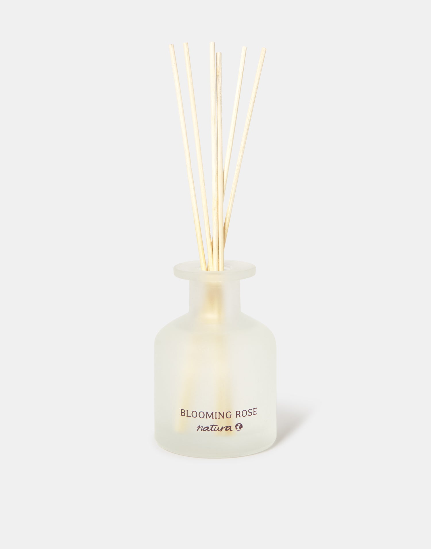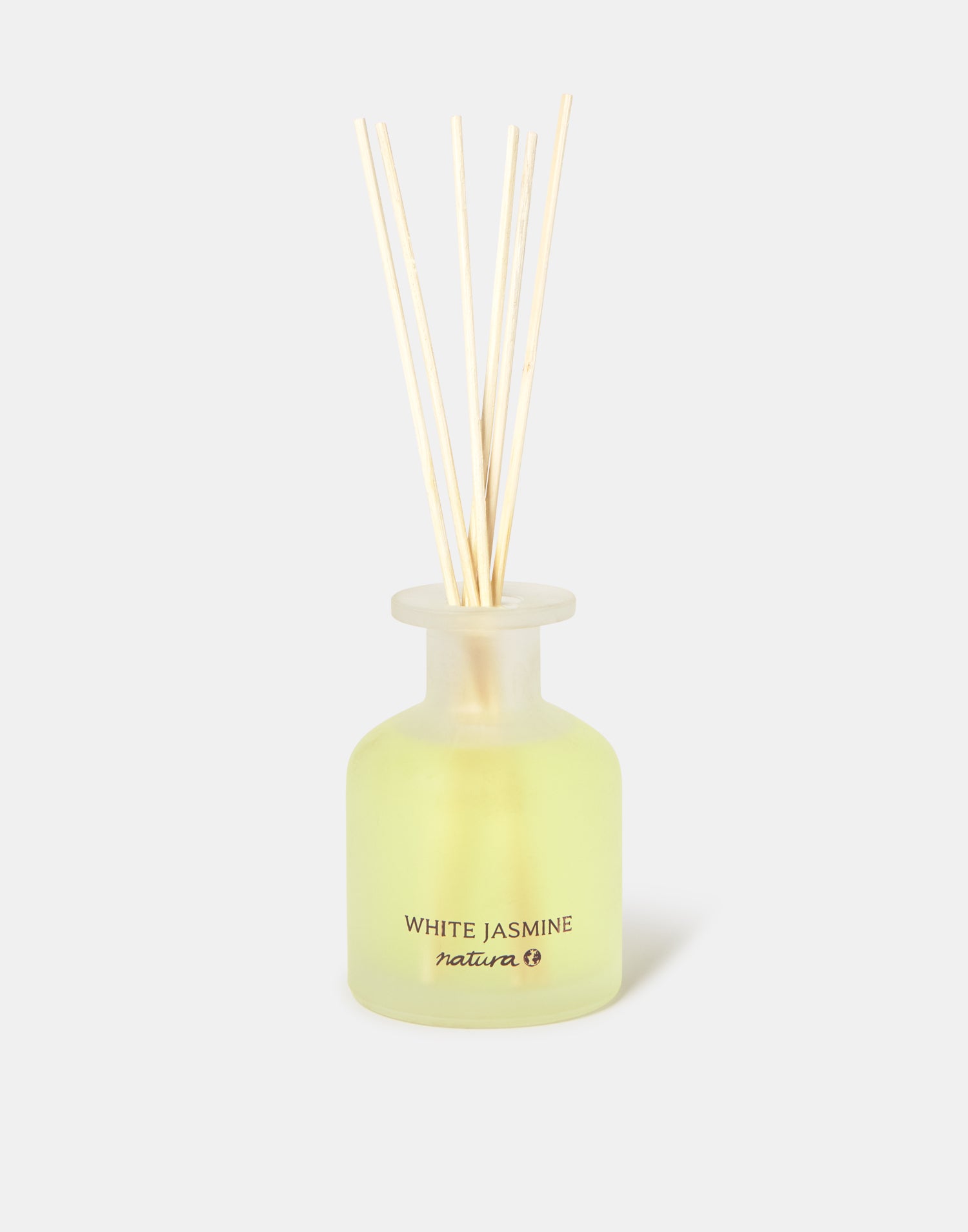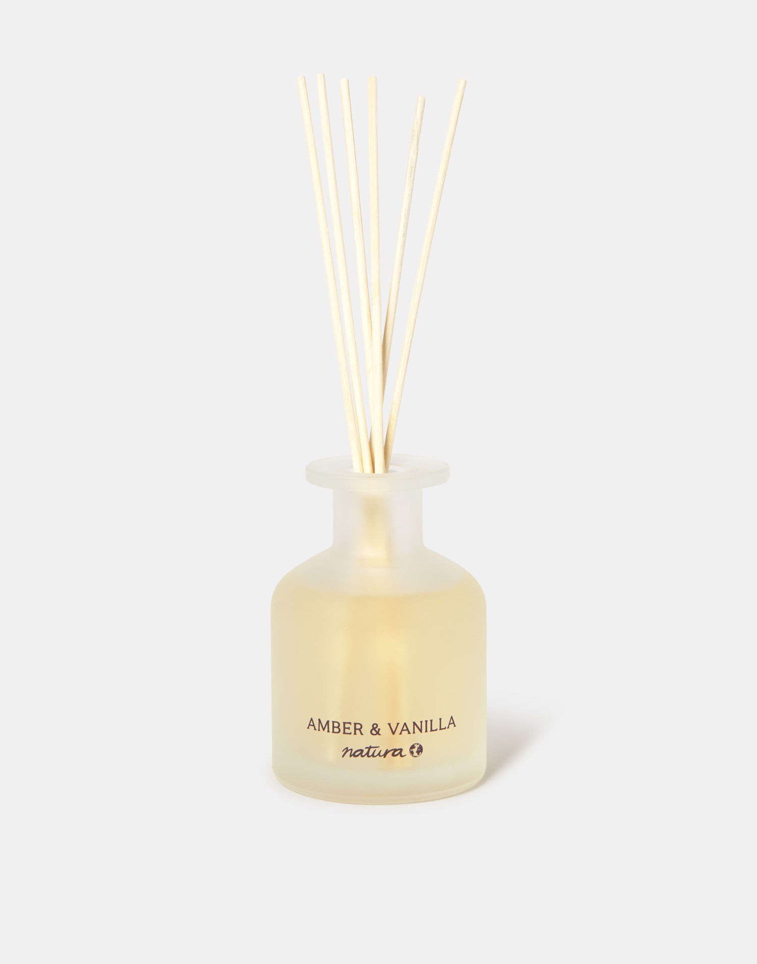 Duftdiffusor mit Glasflasche und Rattanstäbchen.