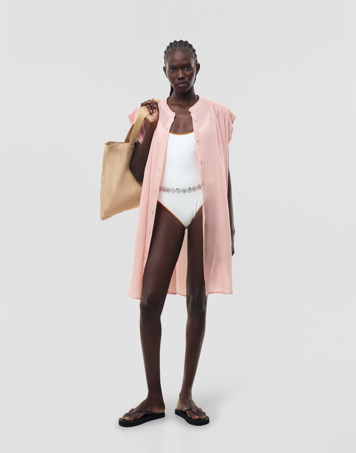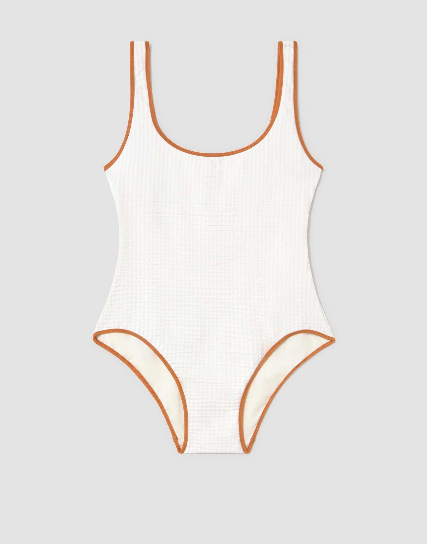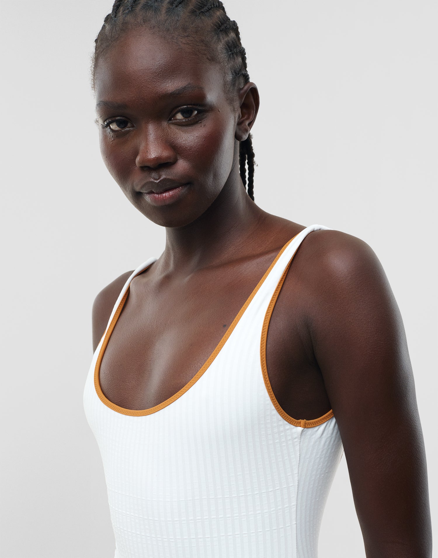 Badeanzug mit Rundhalsausschnitt, Trägern und Taschen am Rücken. Strukturierter Stoff mit kontrastierenden Einfassungen. Gefüttert.