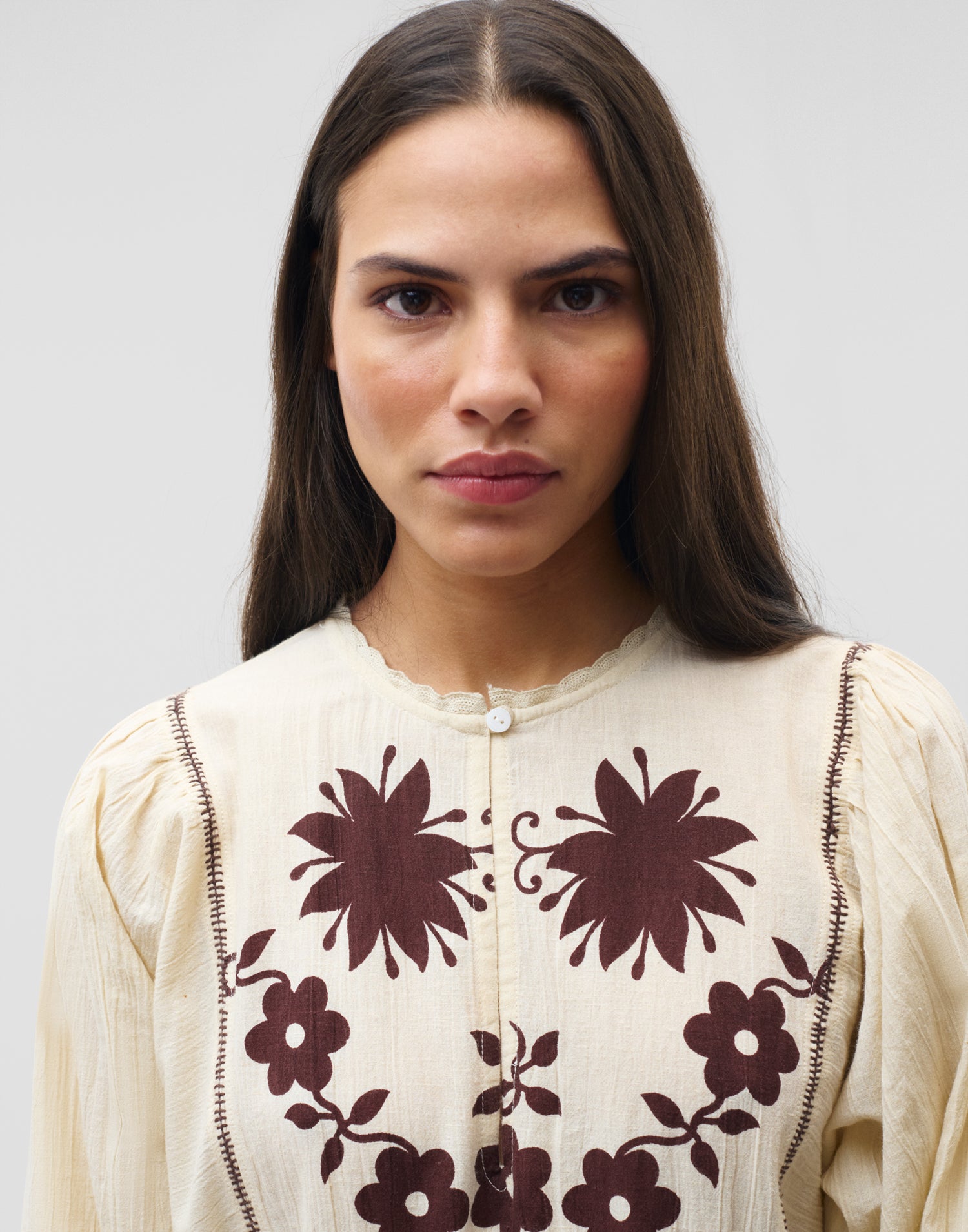 Langes Kleid mit Rundhalsausschnitt und langen Ärmeln mit elastischem Bündchen. Mit bedruckten und gestickten Details. Verarbeitet mit Biesen und Spitzenbändern.