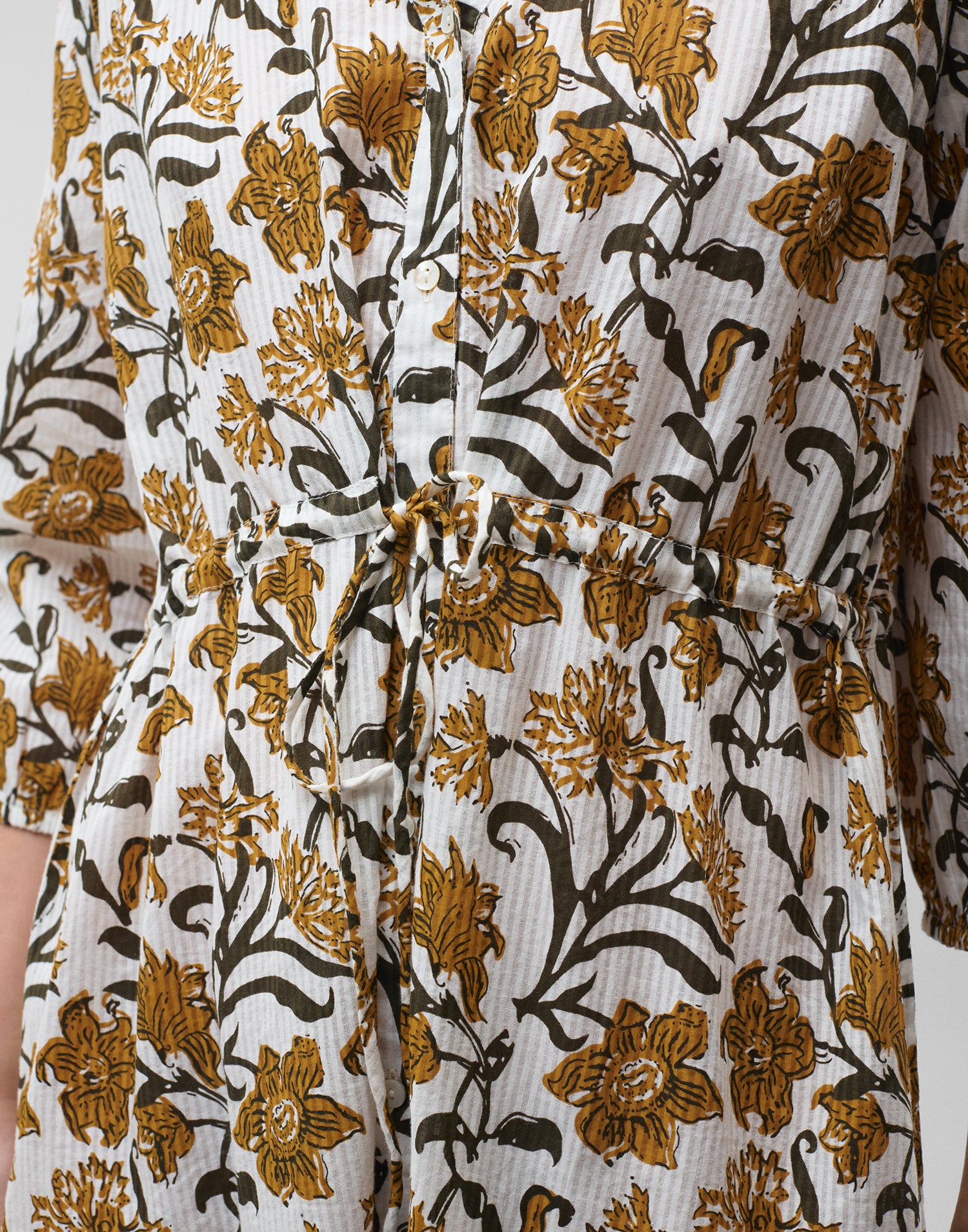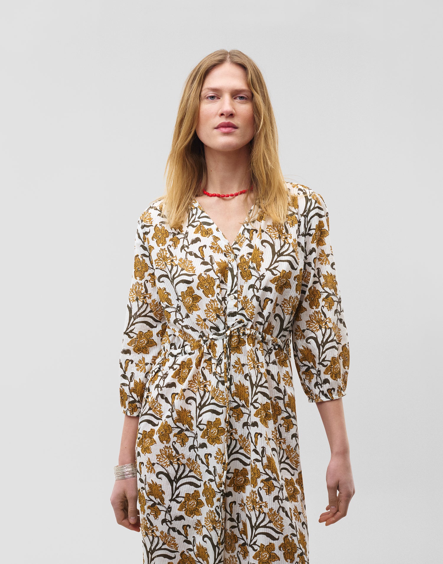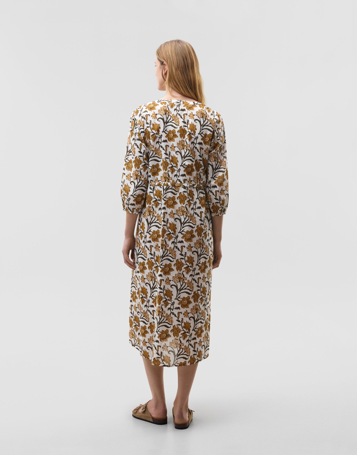 Kleid mit Ärmeln unterhalb des Ellenbogens mit elastischem Abschluss und V-Ausschnitt. Verstellbare Taille mit Bindeband und Knopfverschluss vorne.