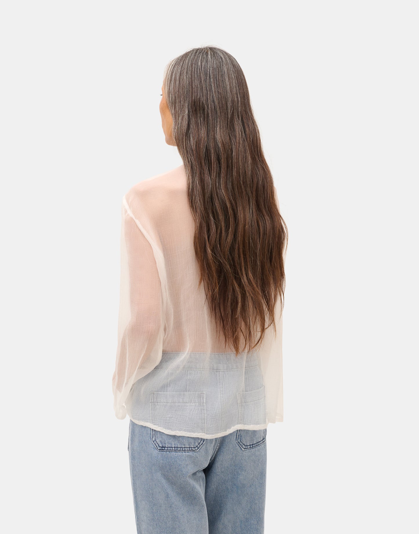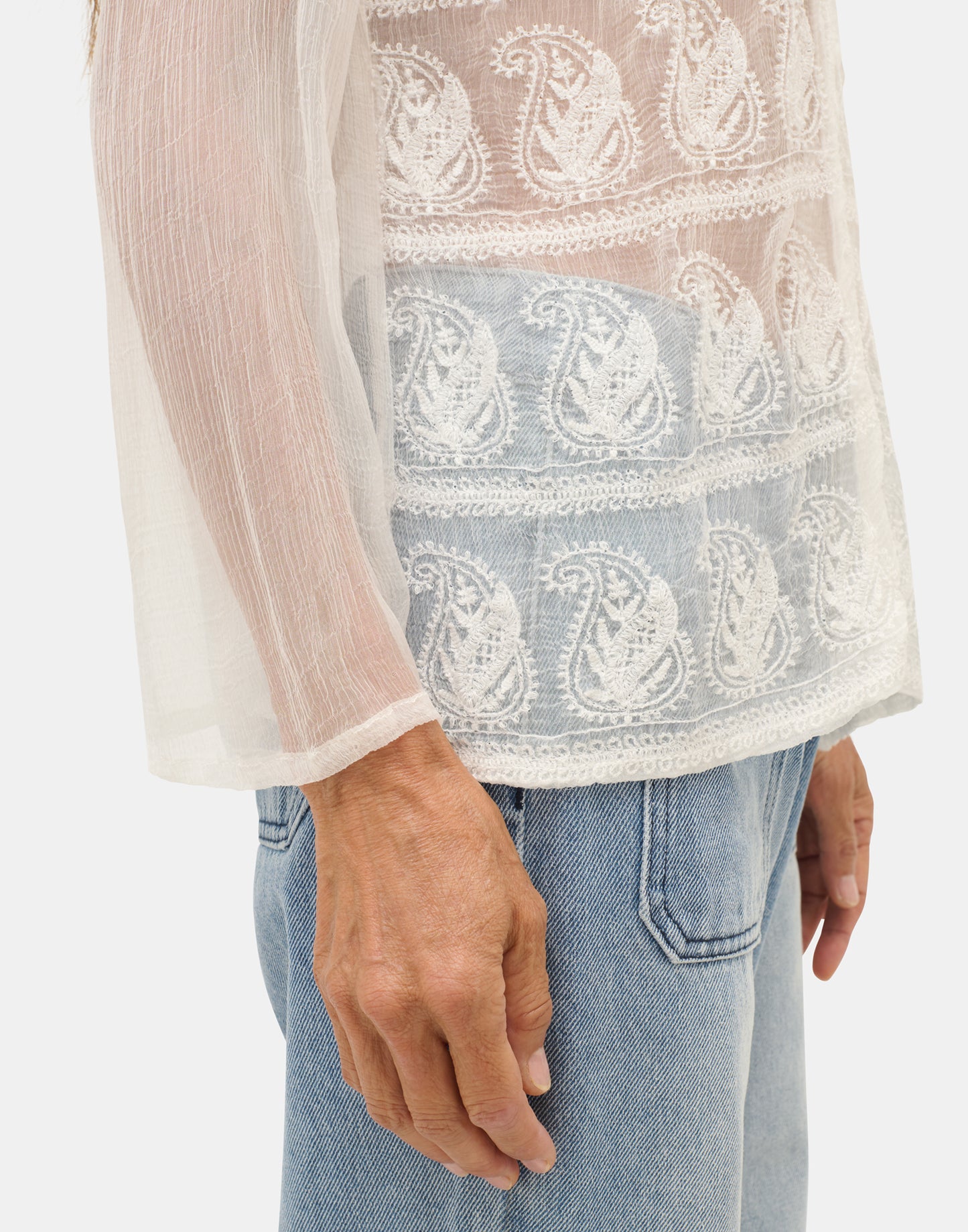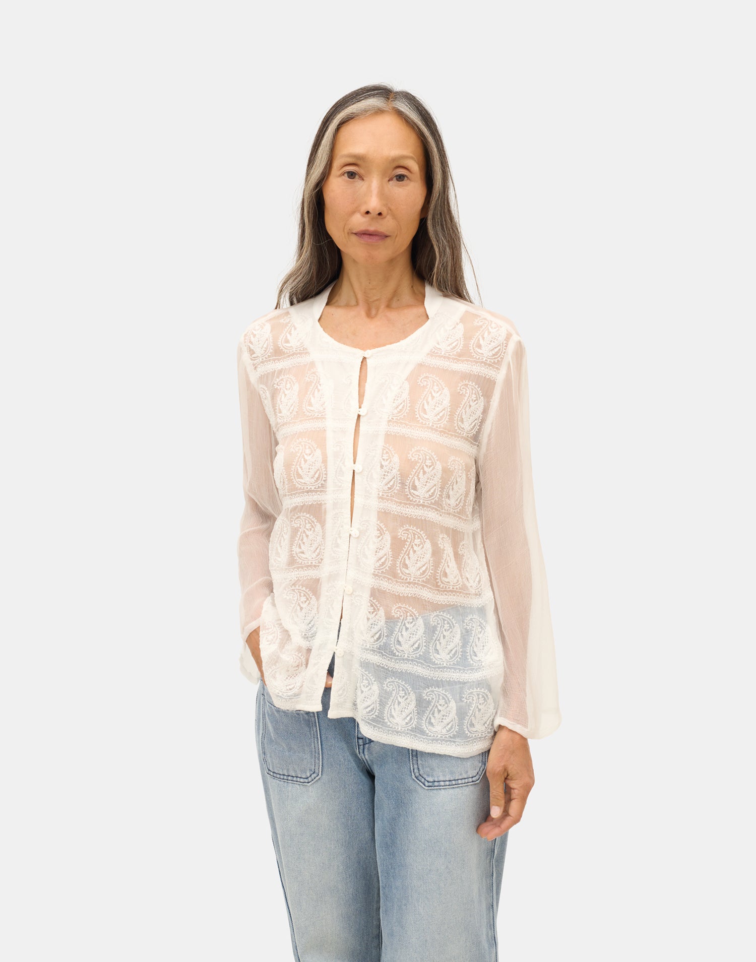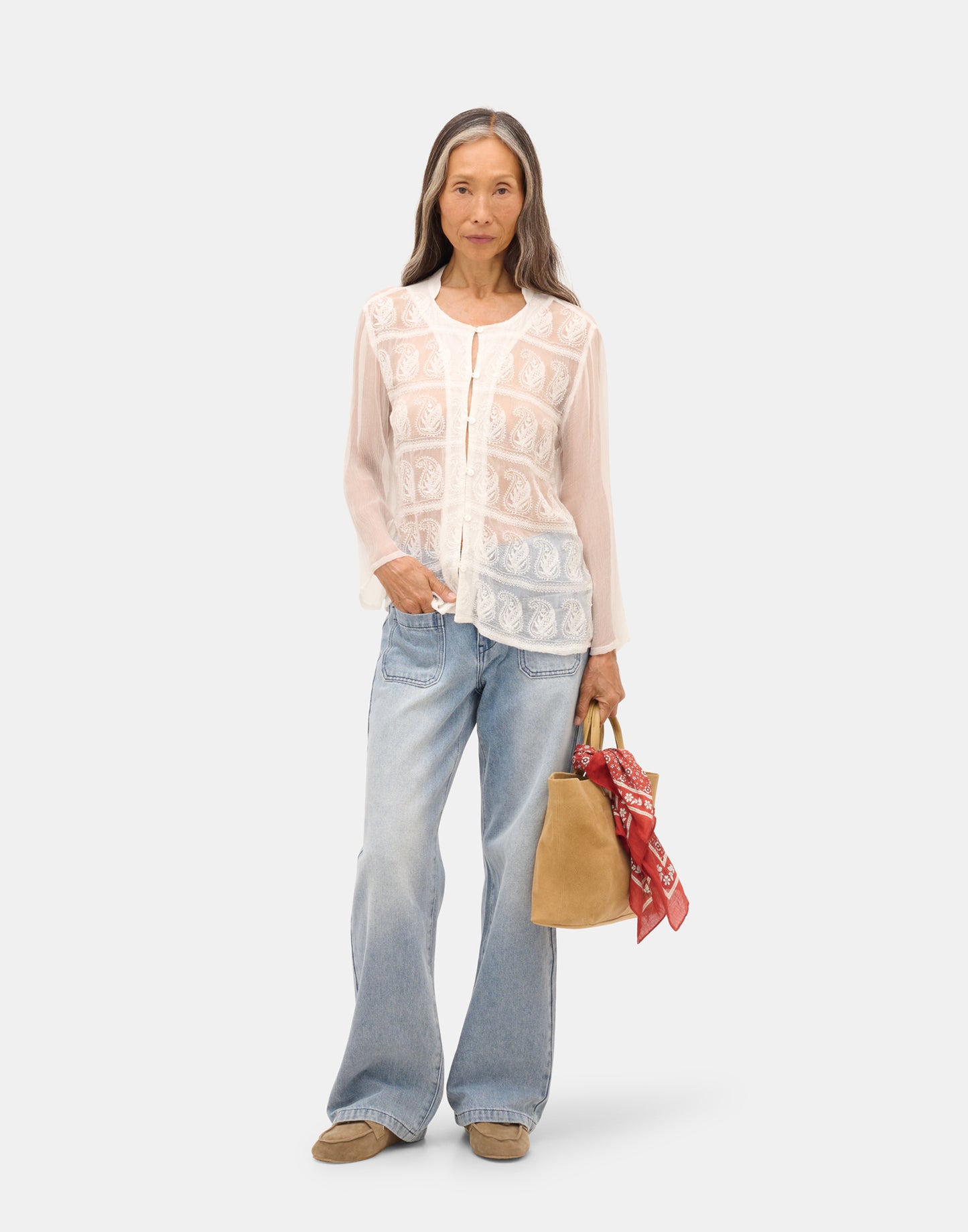 Langärmelige Bluse mit transparenten Partien und Stickdetails auf der Vorderseite. Knopfverschluss und Mao-Kragen.