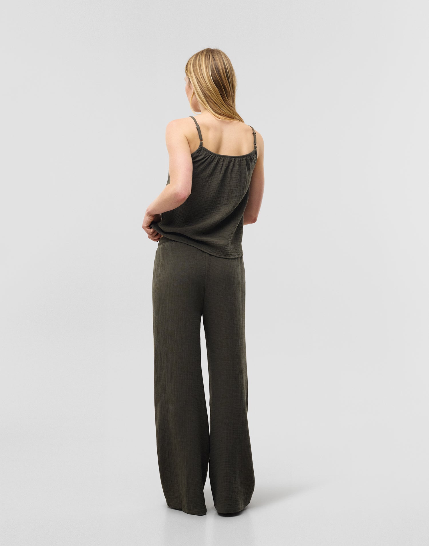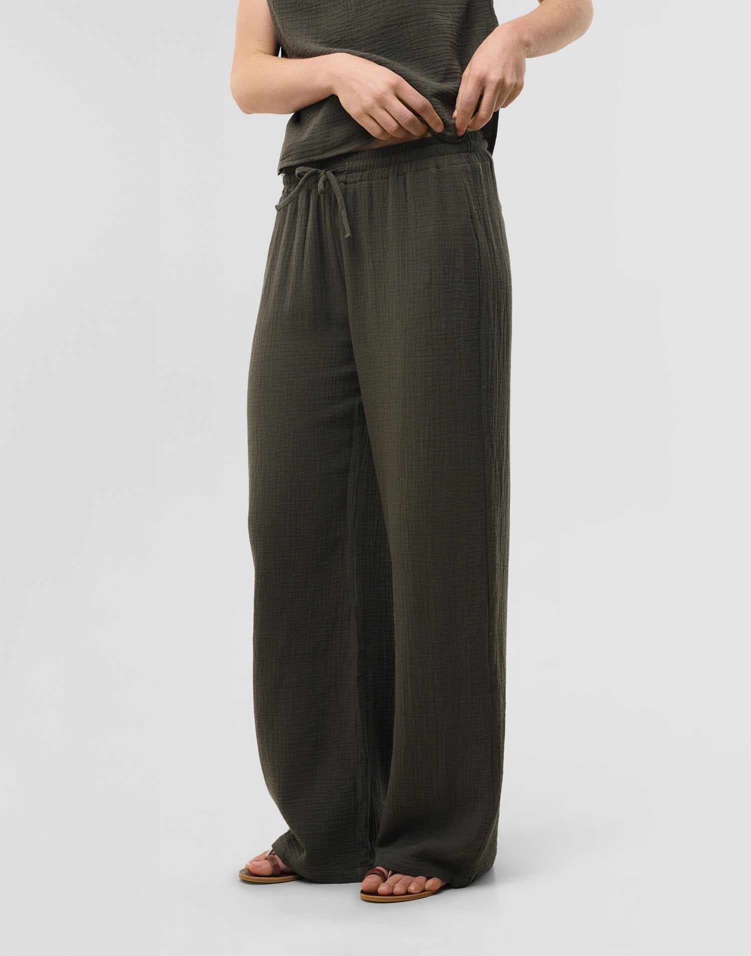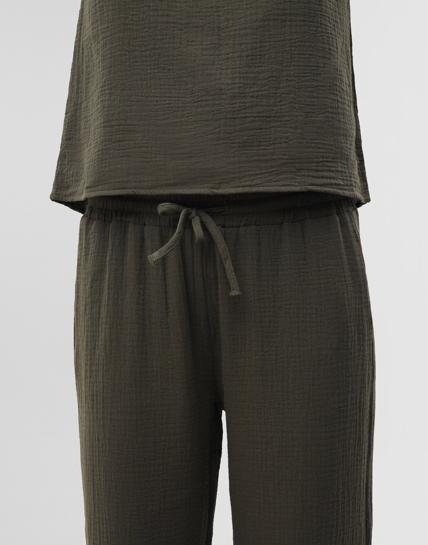Gerade geschnittene Hose aus 100 % Baumwolle. Elastischer Bund mit verstellbarem Bindeband.