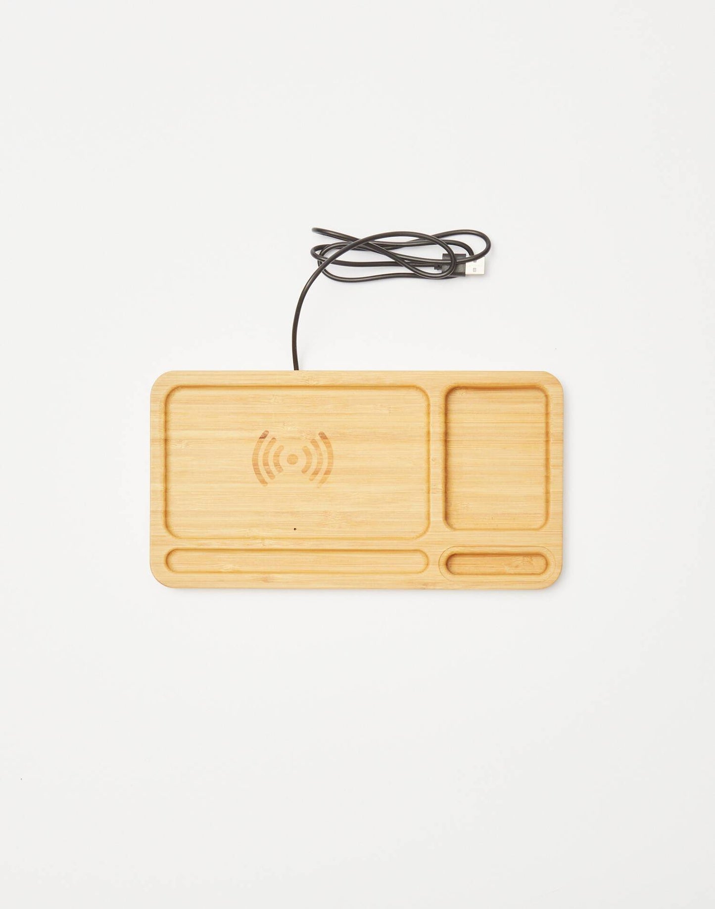 Eleganter Bambusorganisator mit drahtloser Lastoption, um Ihre Schlüssel, Mobile und andere Objekte ordentlich zu platzieren.