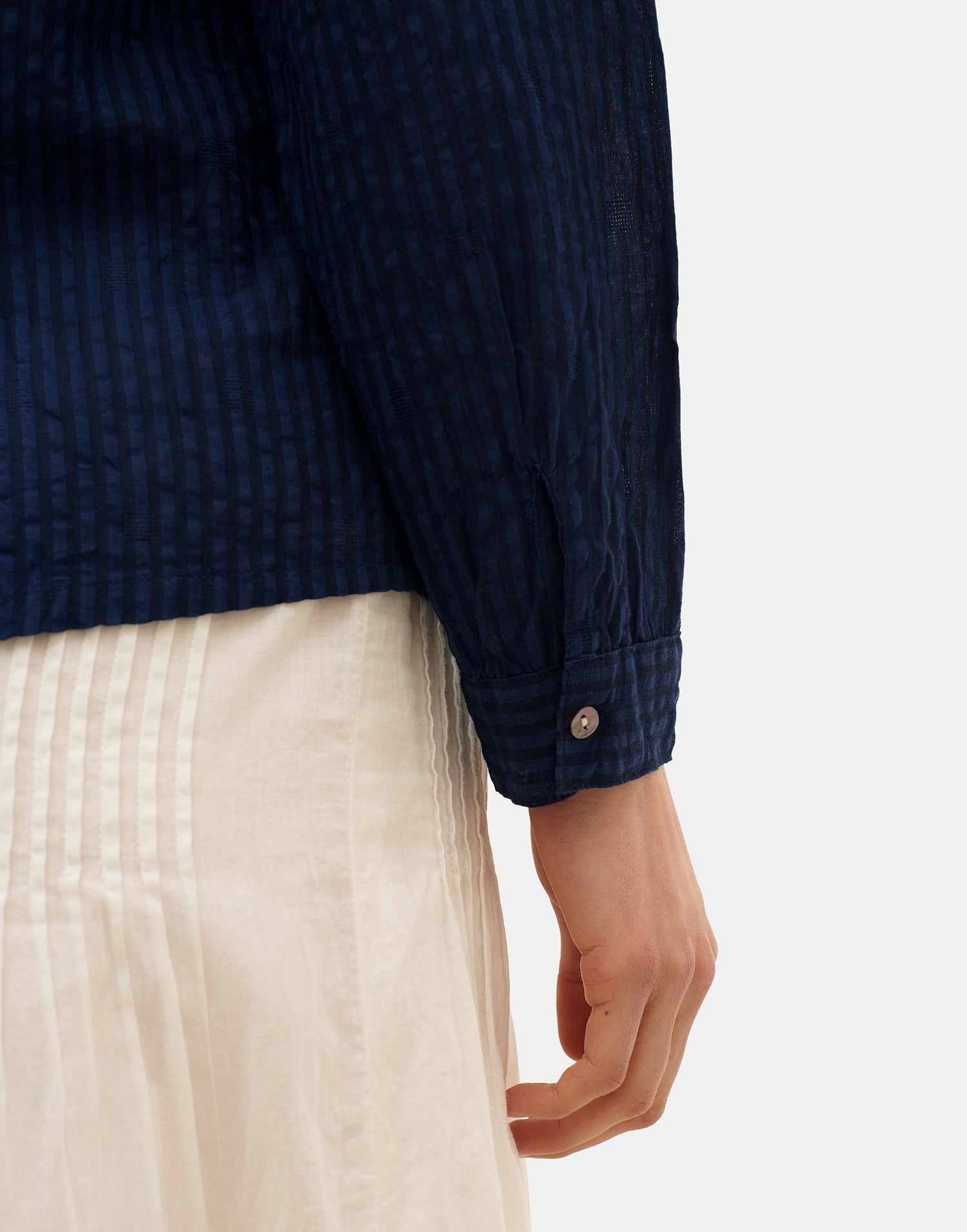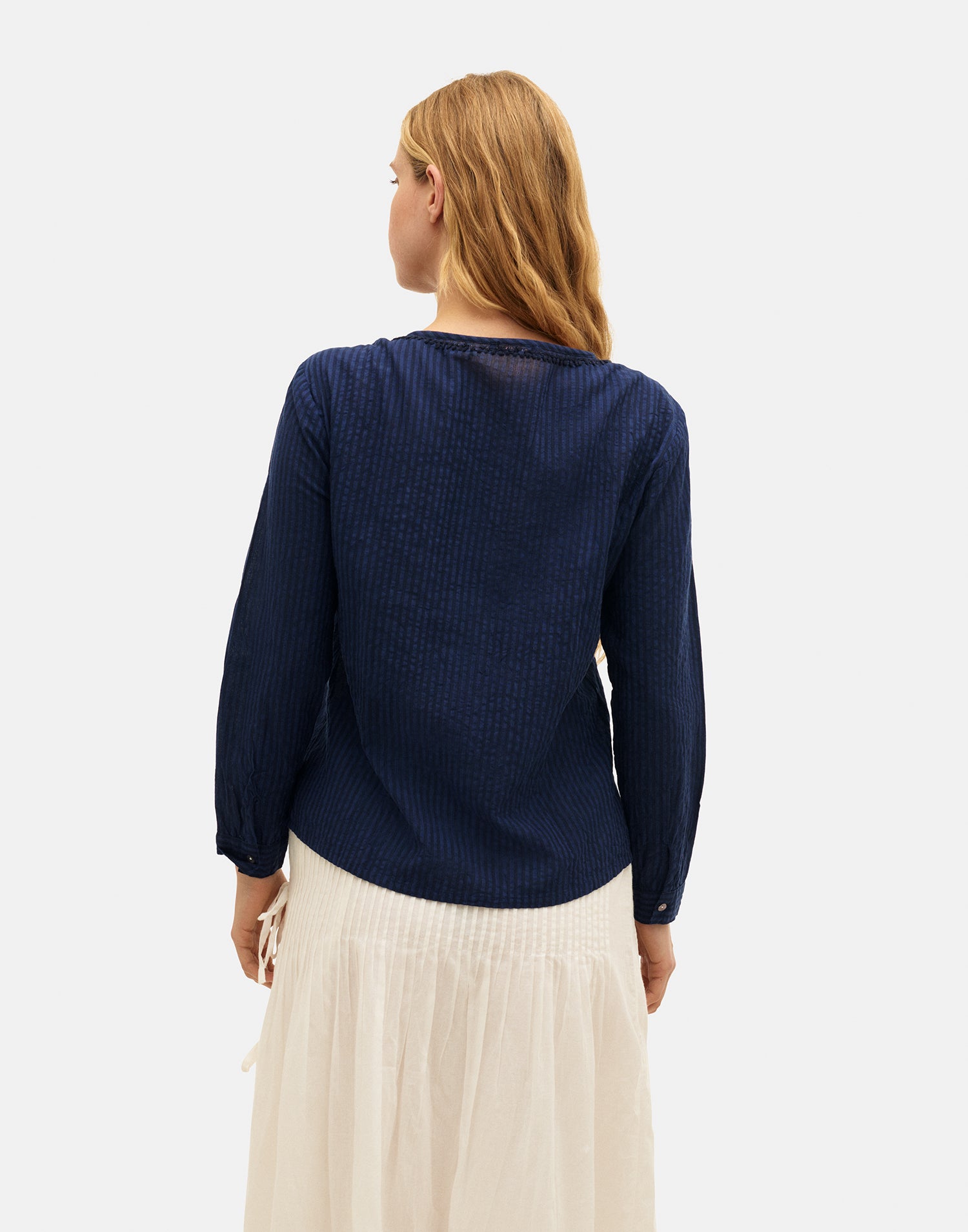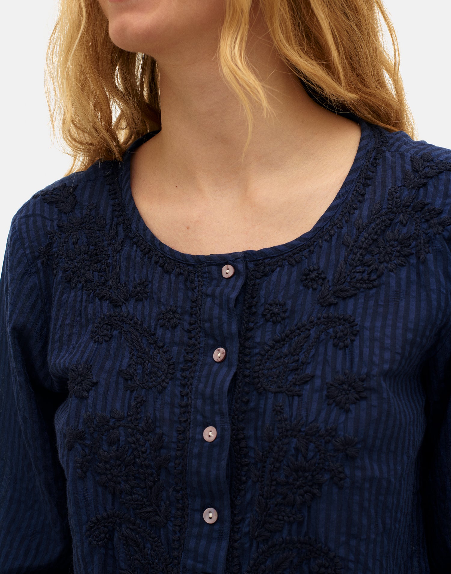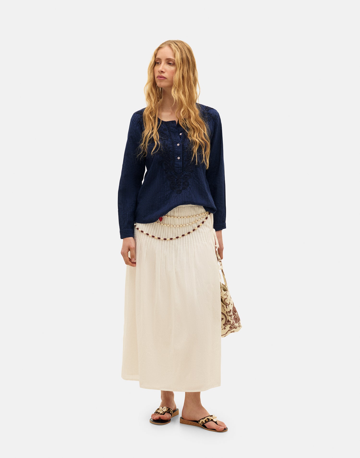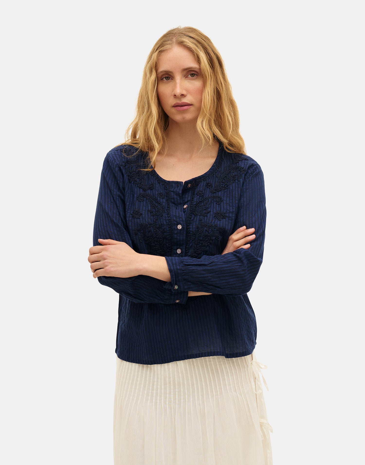 Blouse featuring a round neckline and long sleeves with buttoned cuffs. Embroidered details and front button closure.