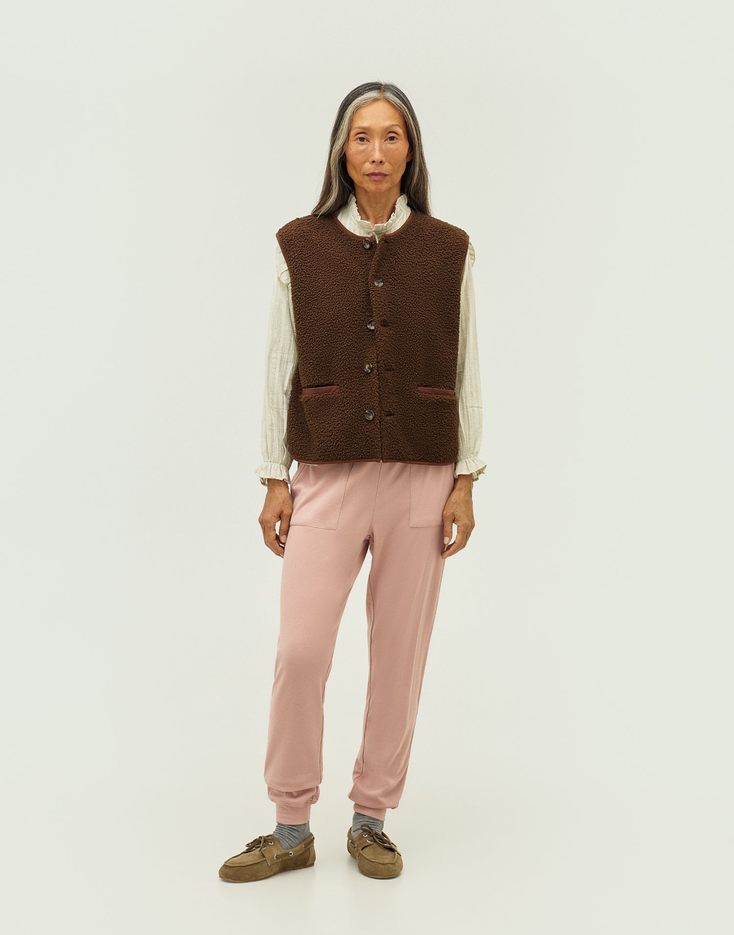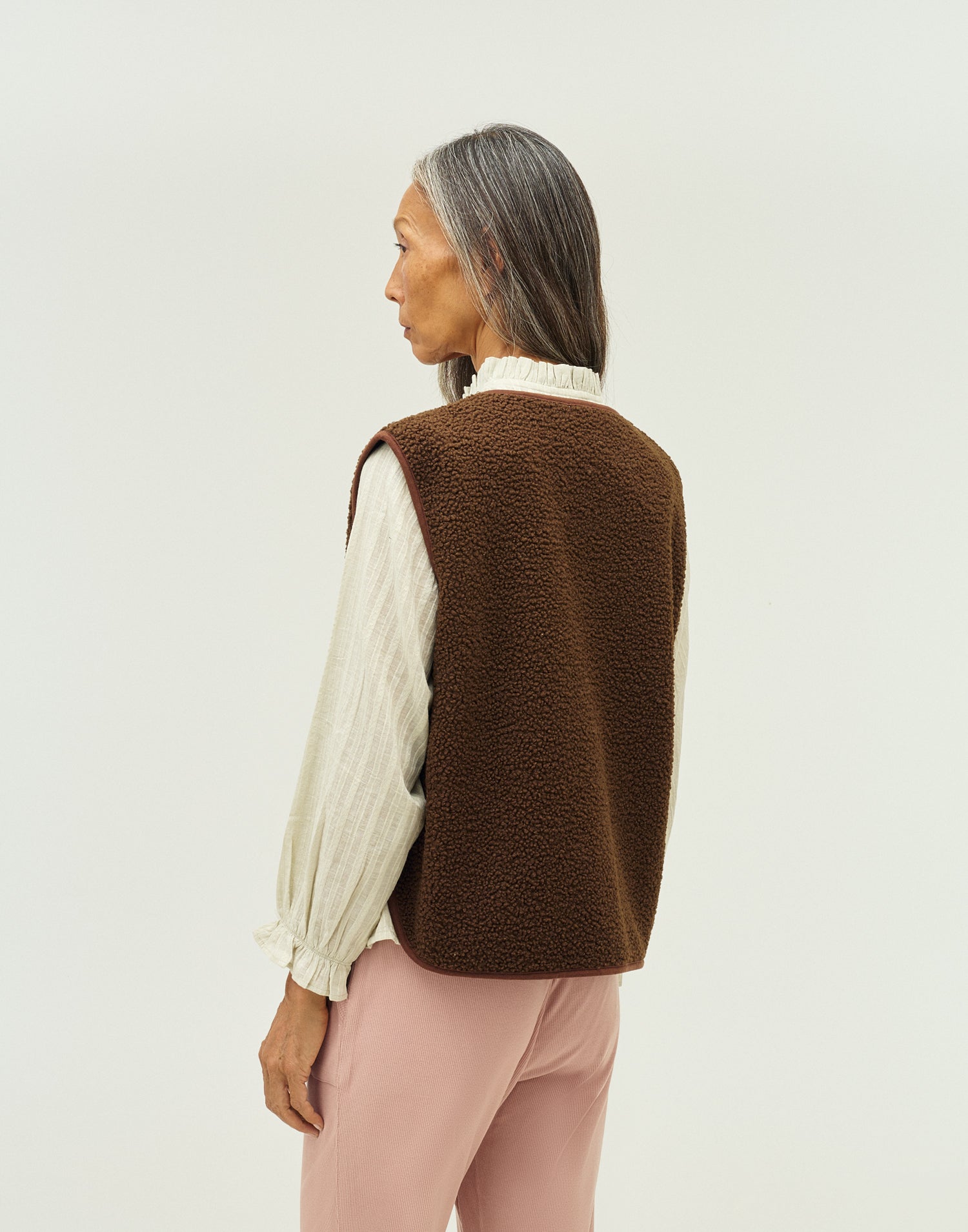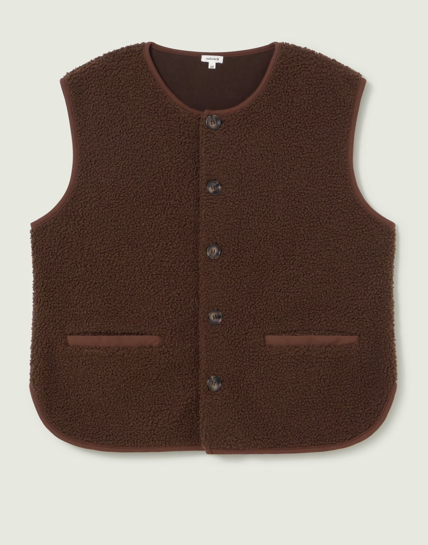 Fleece-effect vest with sleeveless design and round neck. Front button closure.