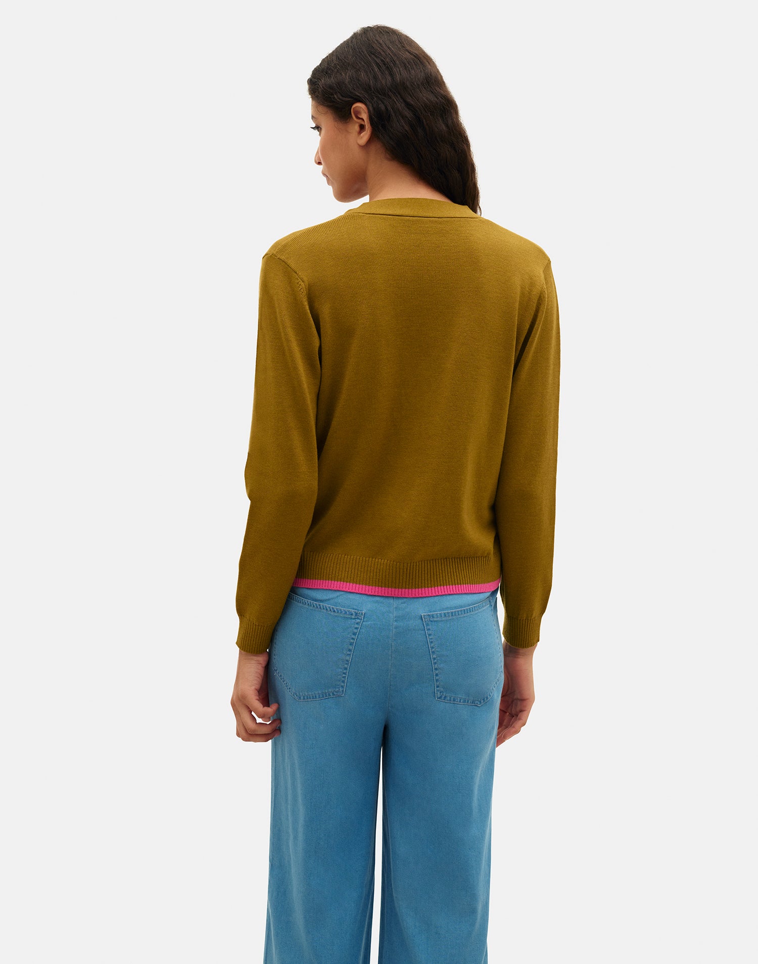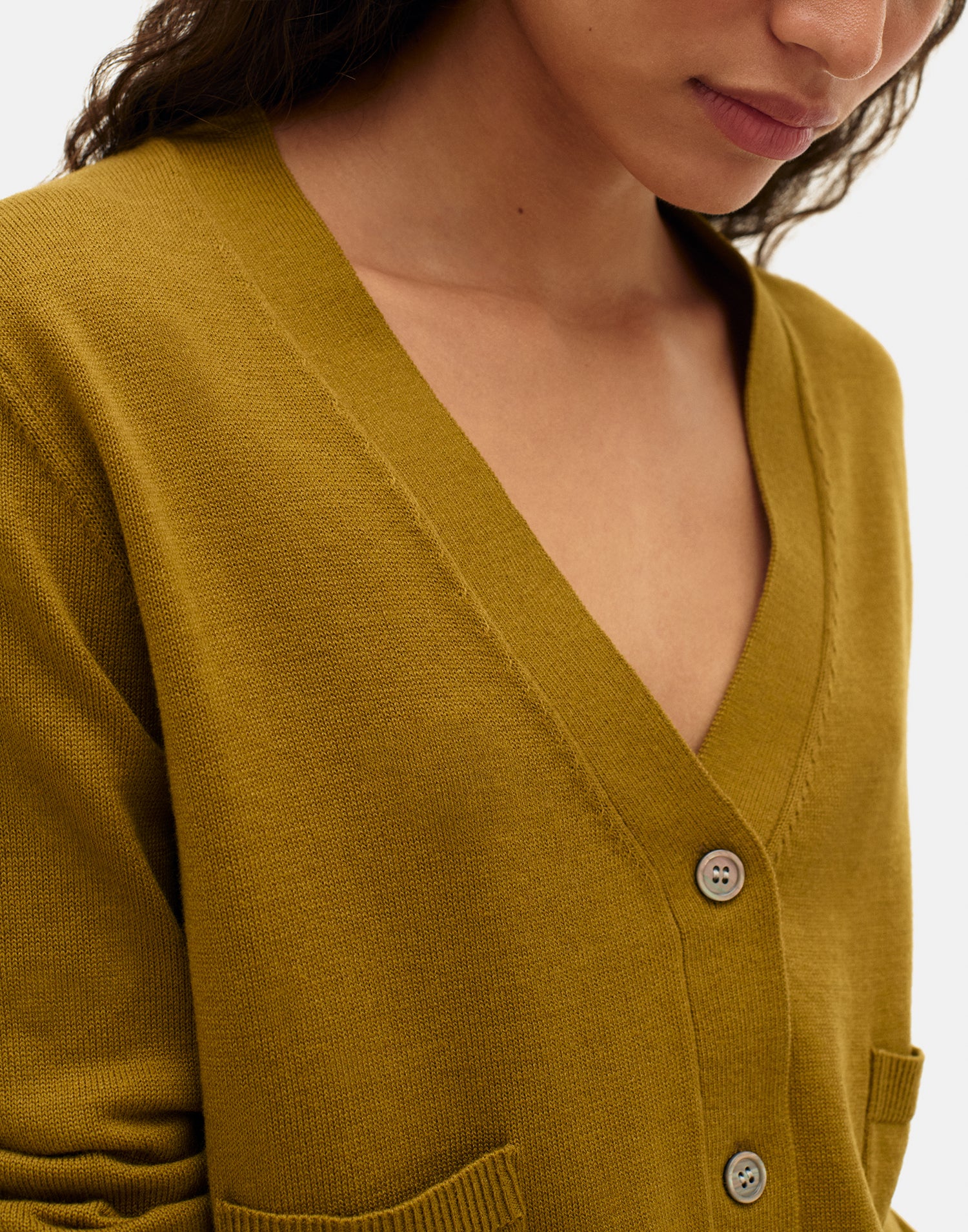 Knit cardigan with long sleeves, V-neckline, and patch pockets on the front. Finished with ribbed edges and front button closure.