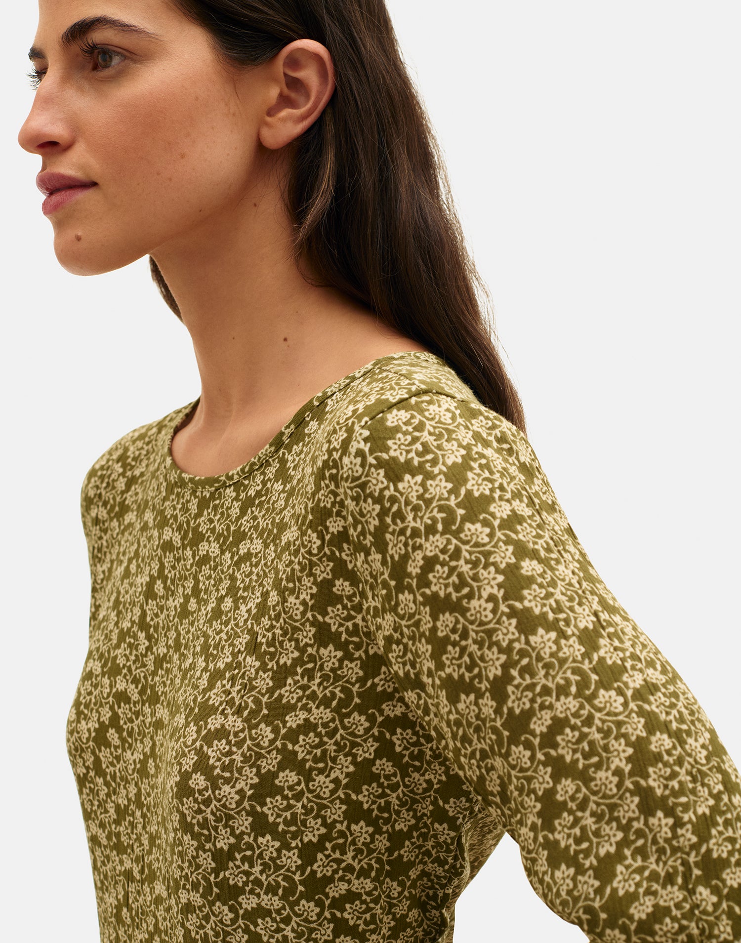 Long dress featuring a floral print, round neckline, and 3/4 sleeves. Button closure at the back.