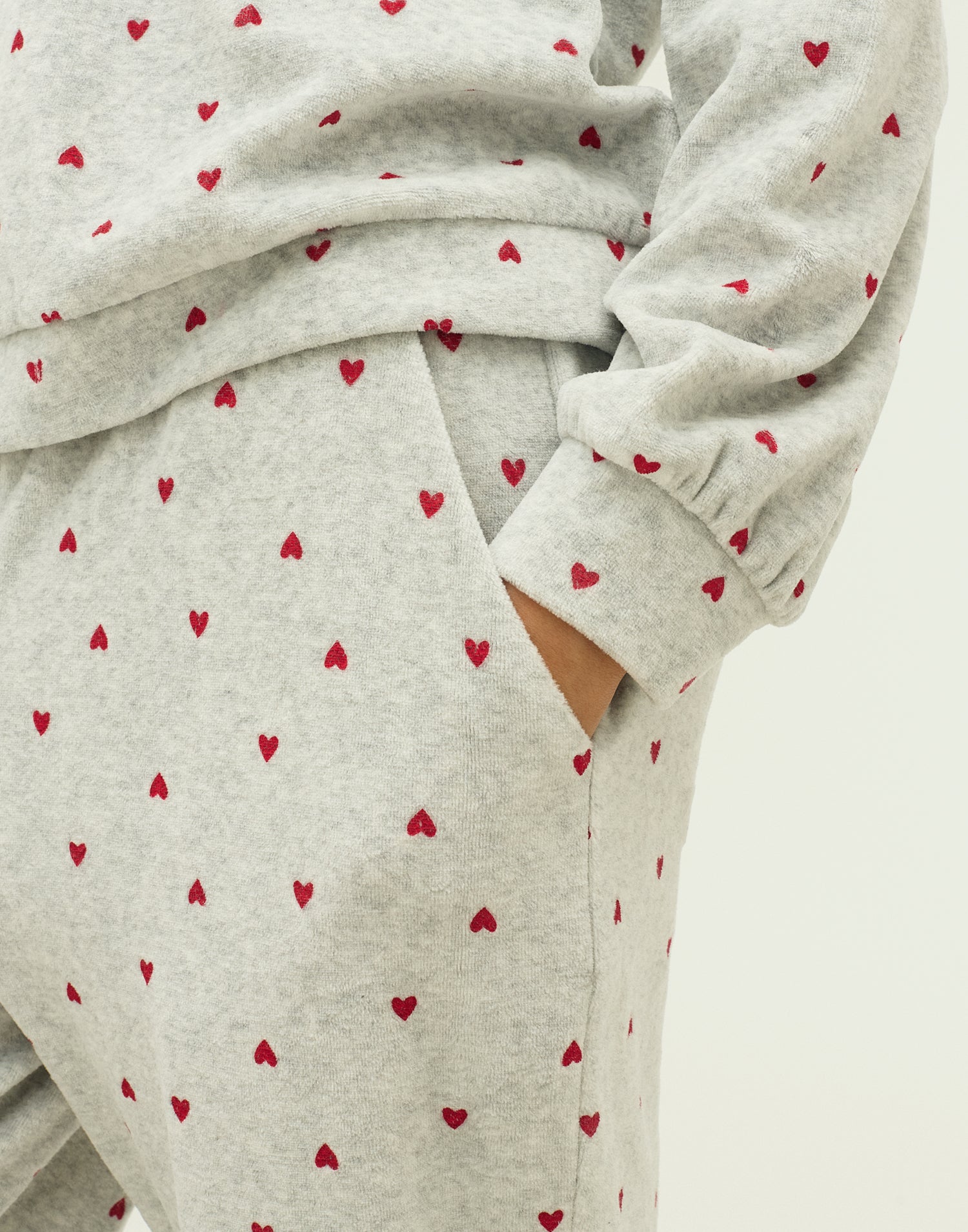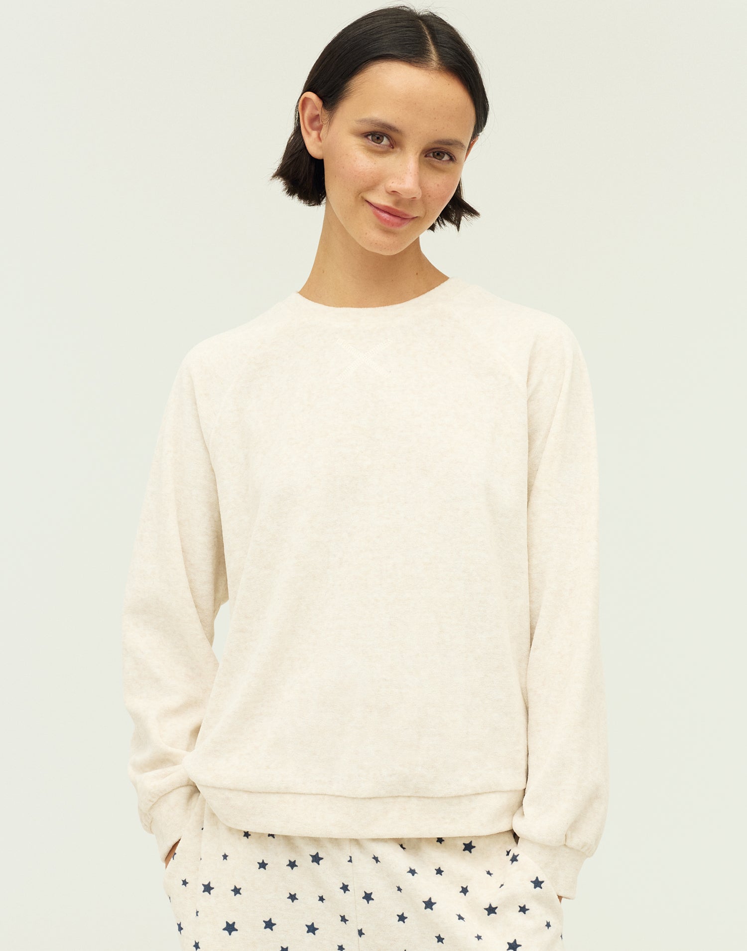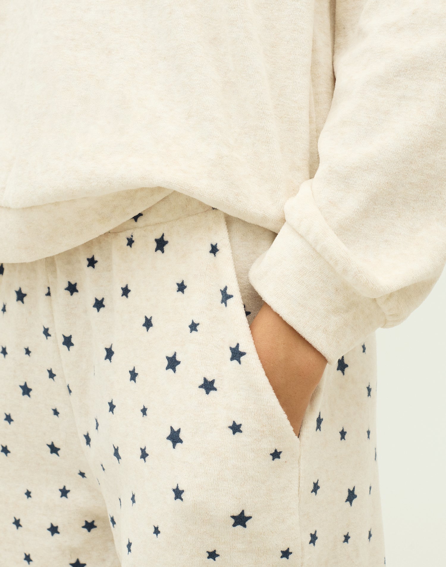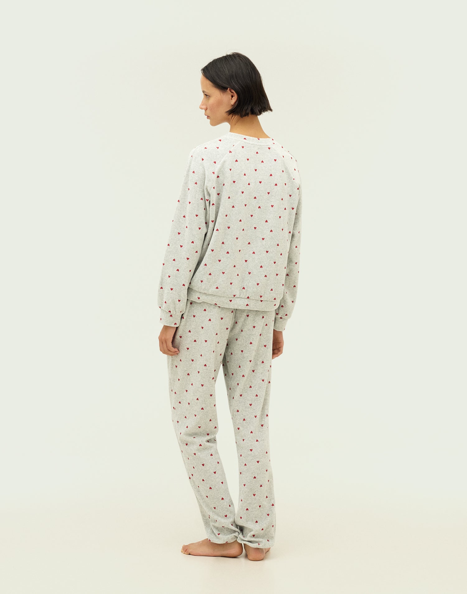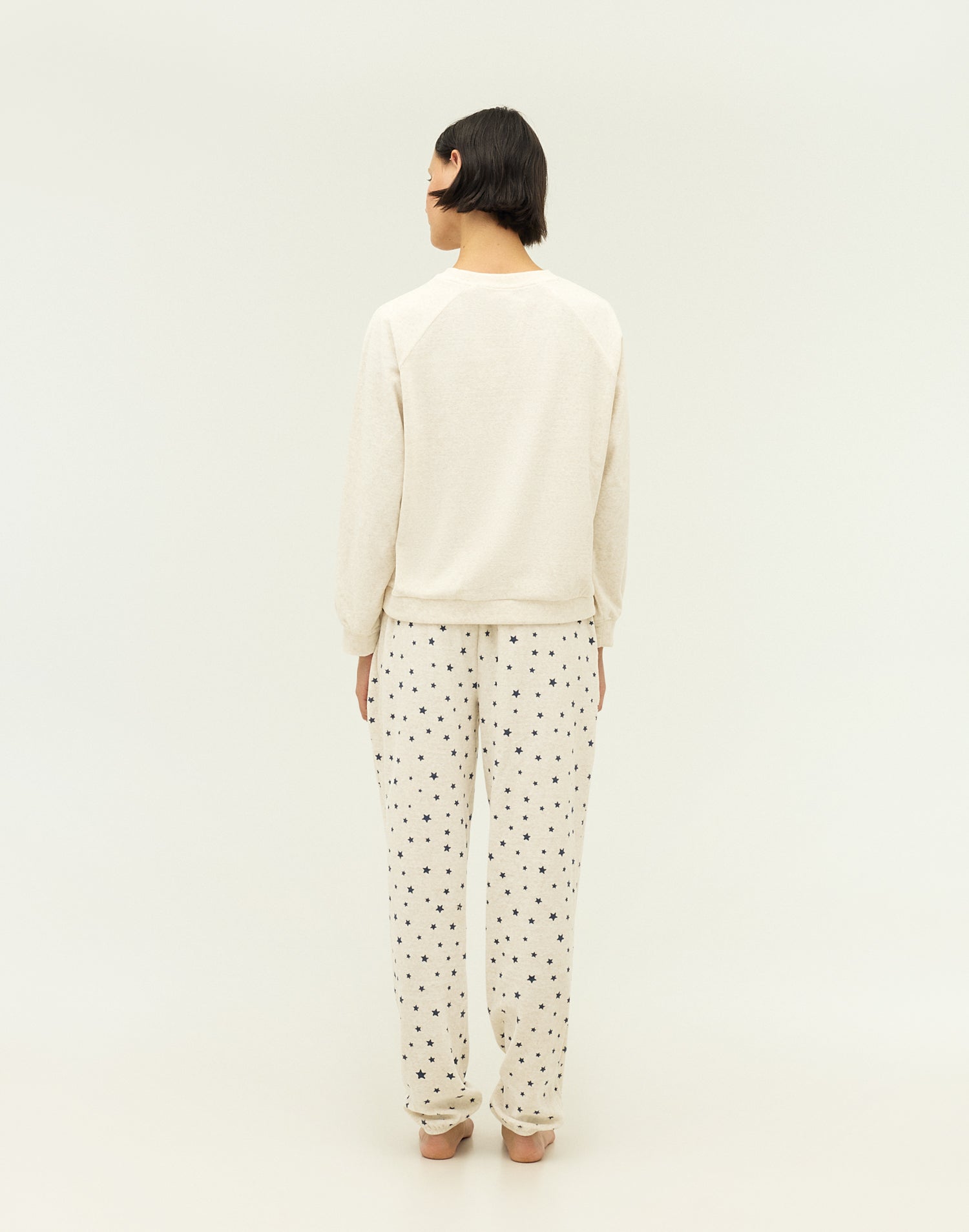 Pyjama set composed of a sweatshirt-style long-sleeve top with a round neck and long trousers with an elastic waistband, side pockets and elastic cuffs at the hem.