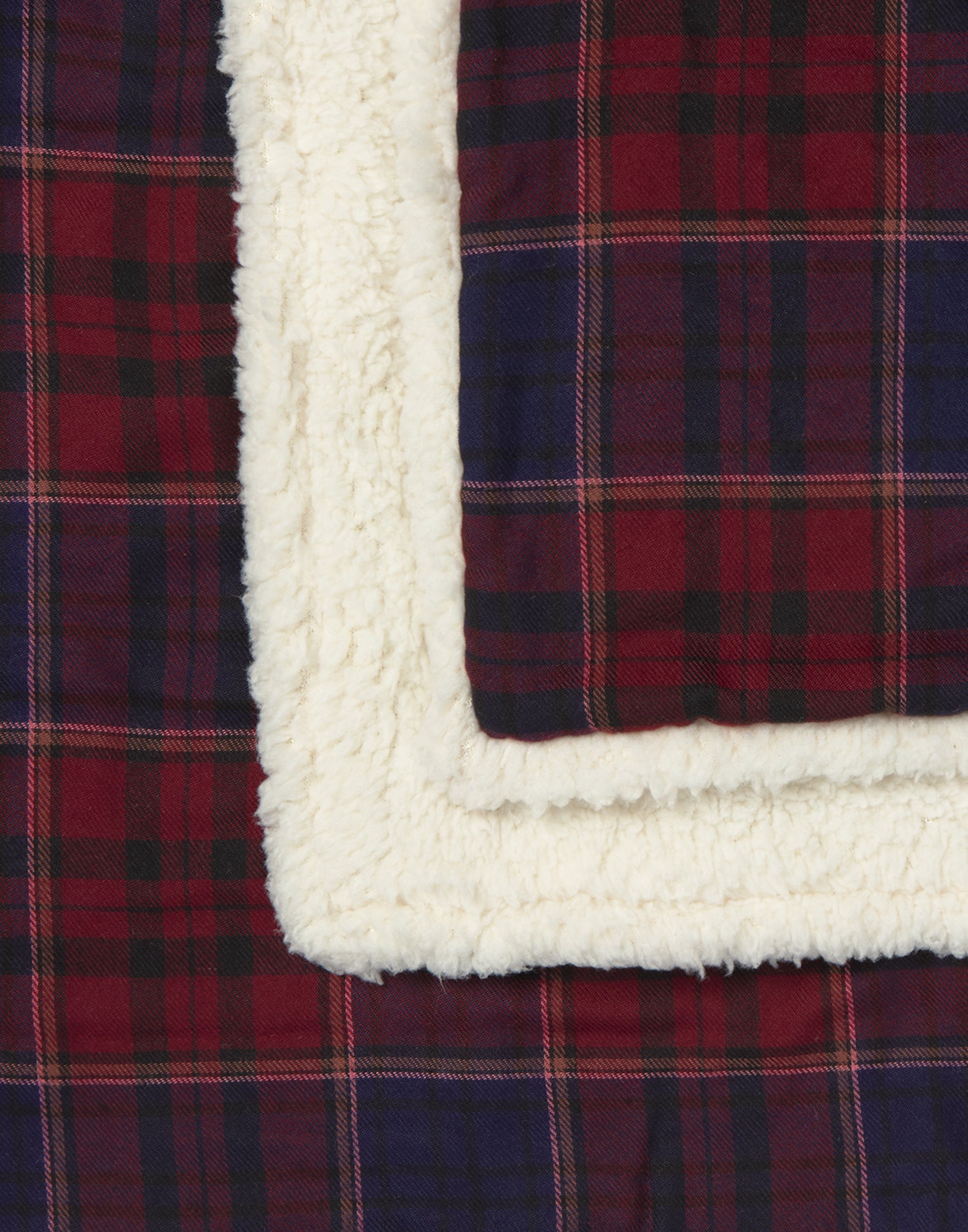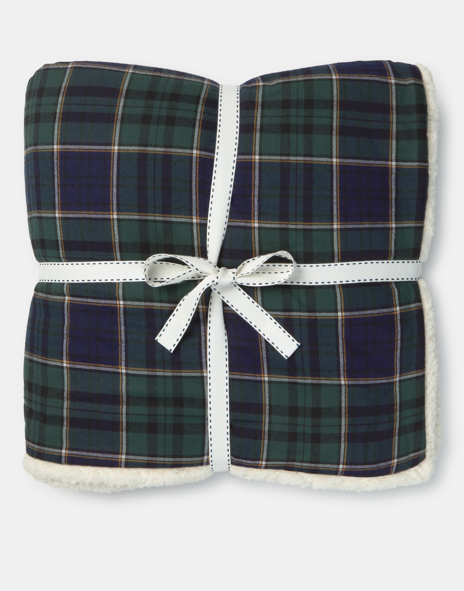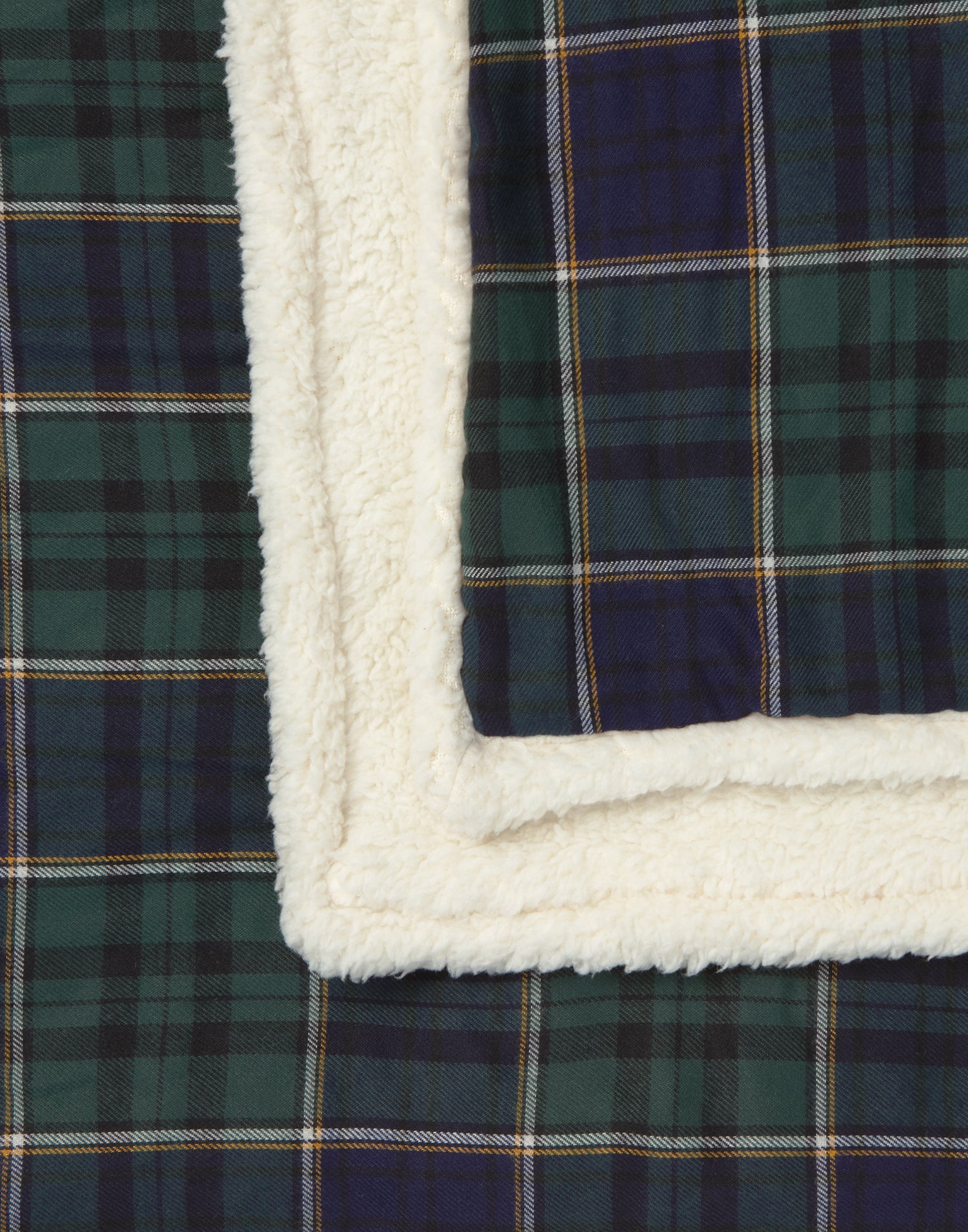 Blanket featuring a fleece interior and a tartan-style checkered pattern.