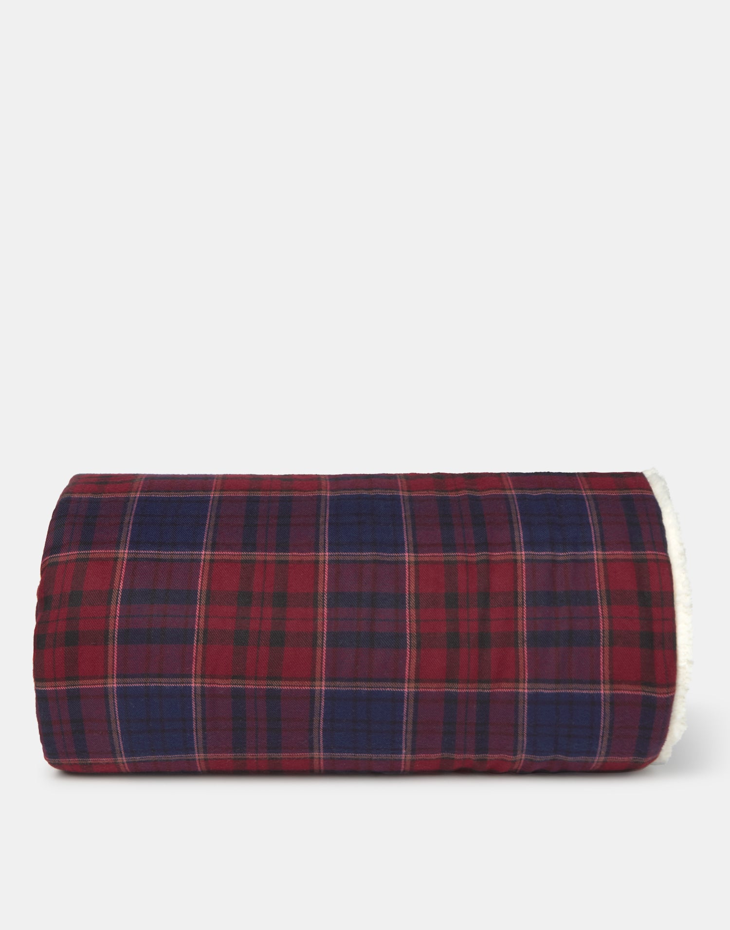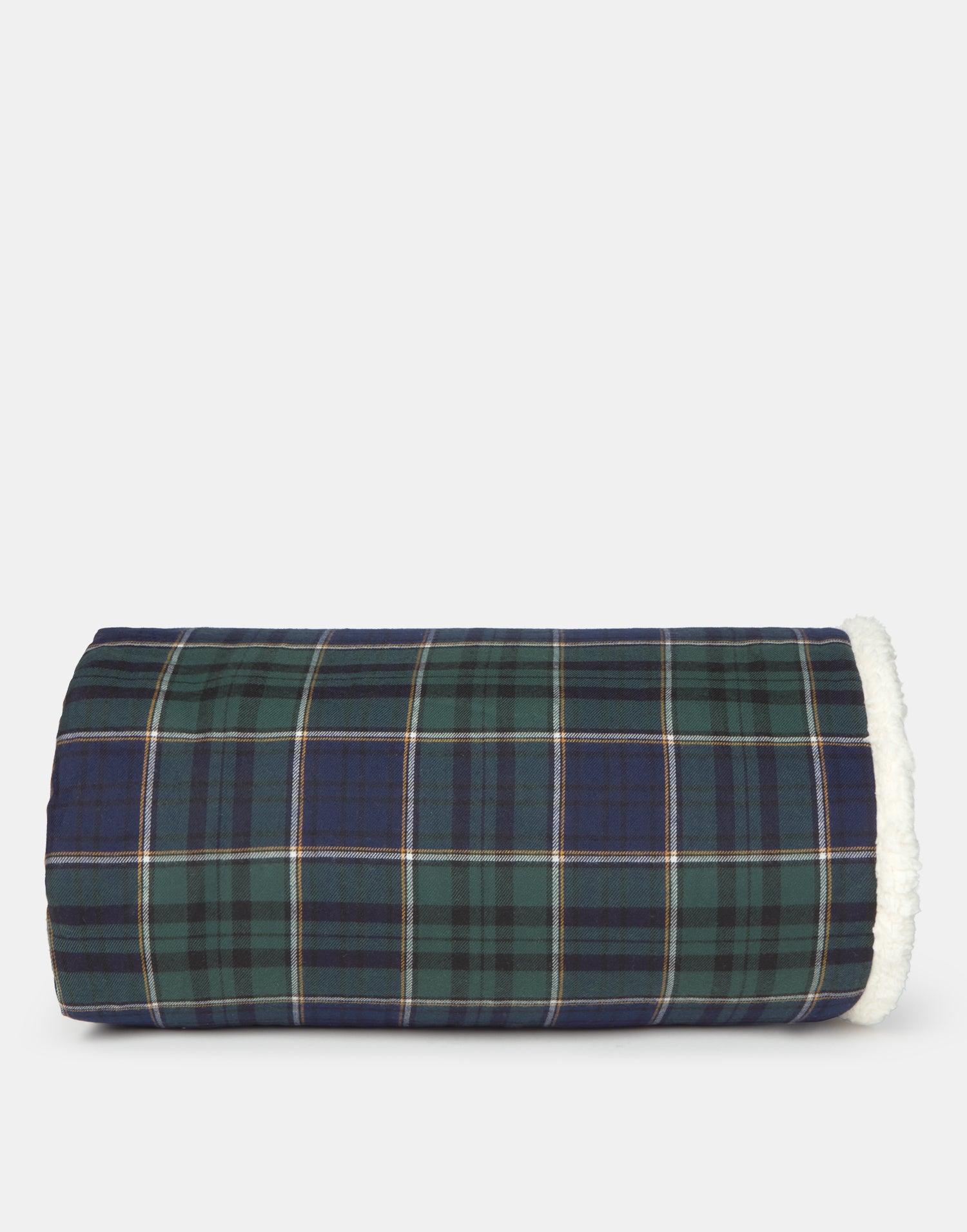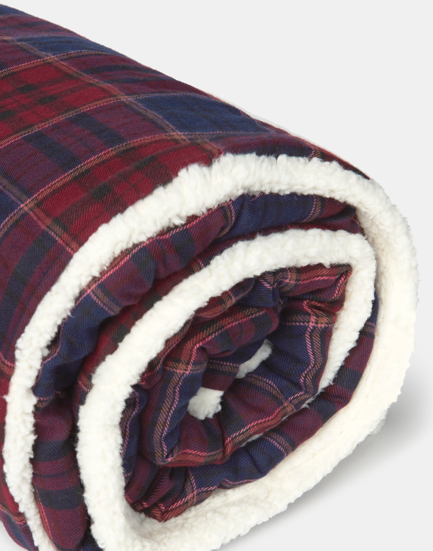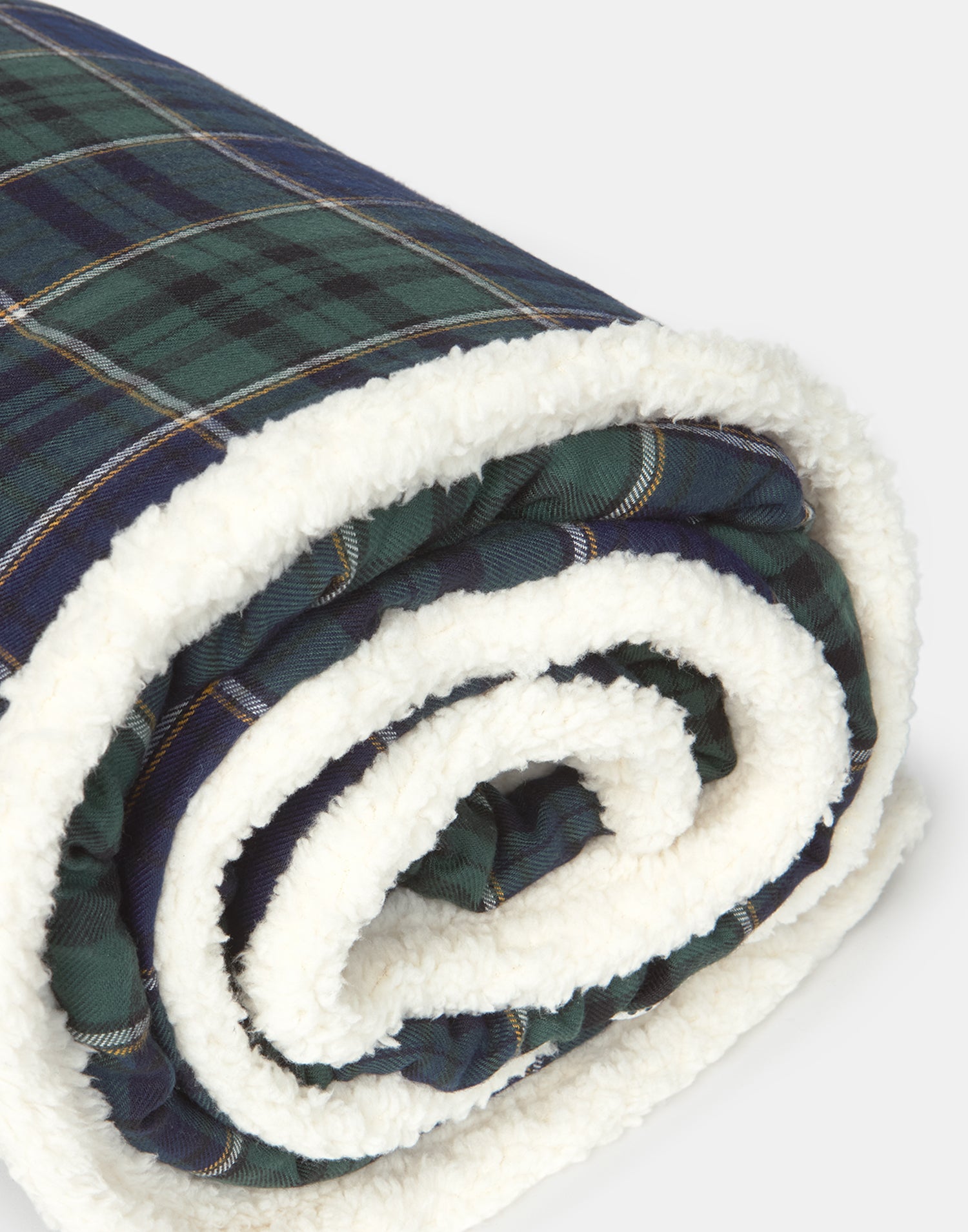 Blanket featuring a fleece interior and a tartan-style checkered pattern.