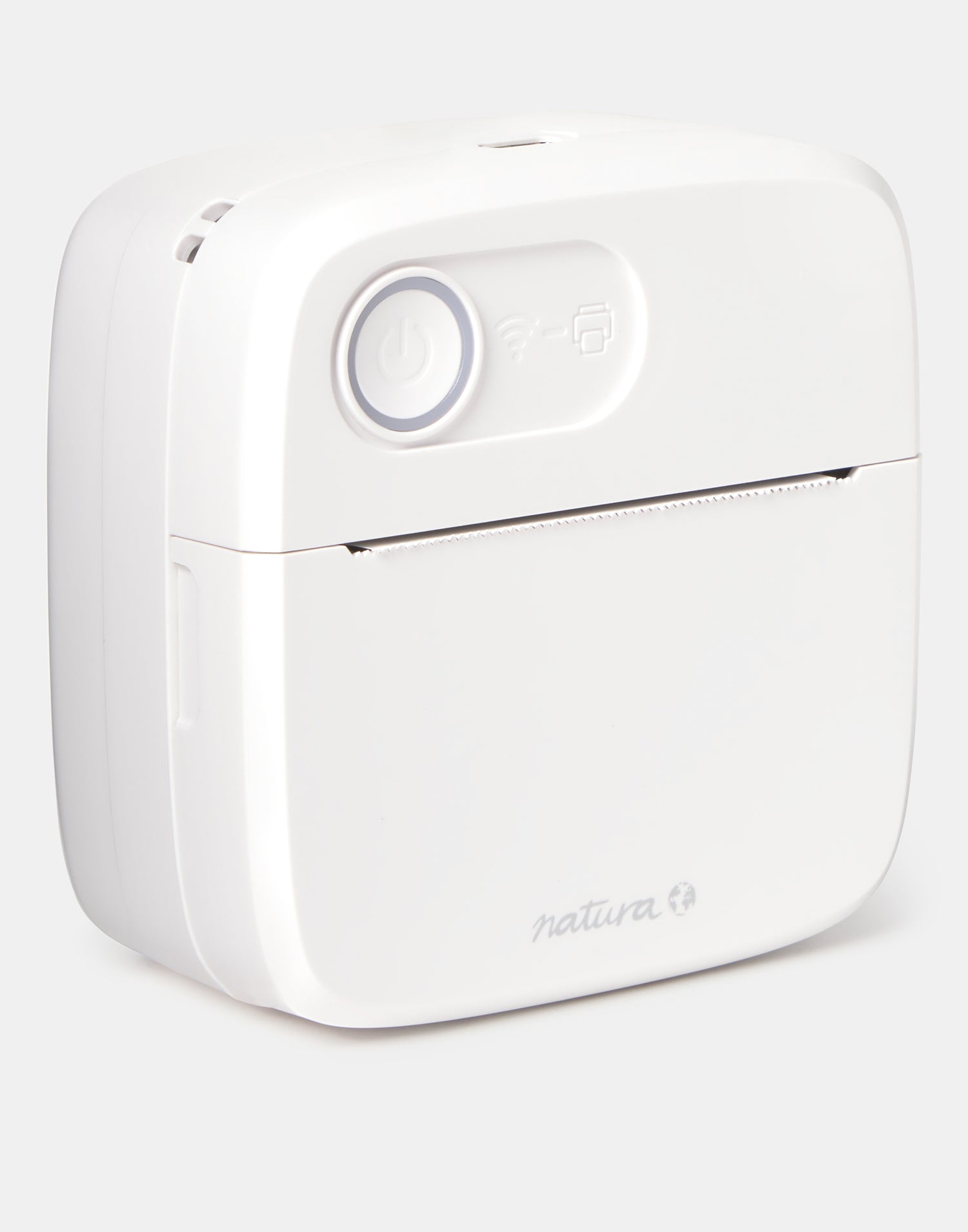 Thermal printing. Charging port: USB-C cable (included). Works via Bluetooth. Includes the printer, two paper rolls and a string for hanging.